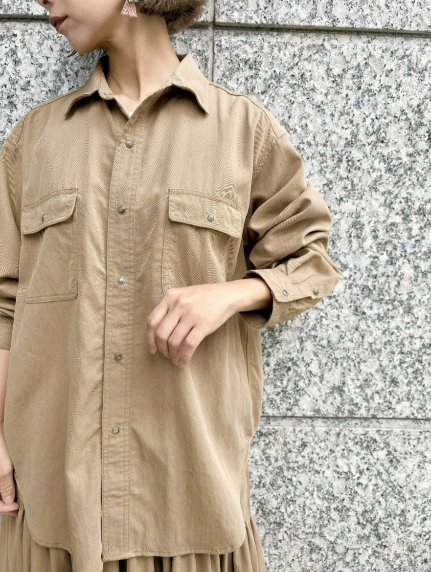 同素材のスカートとのセットアップとしても単品使いとしても◎オールシーズン活躍の一枚あるととても便利なシャツですよ!!