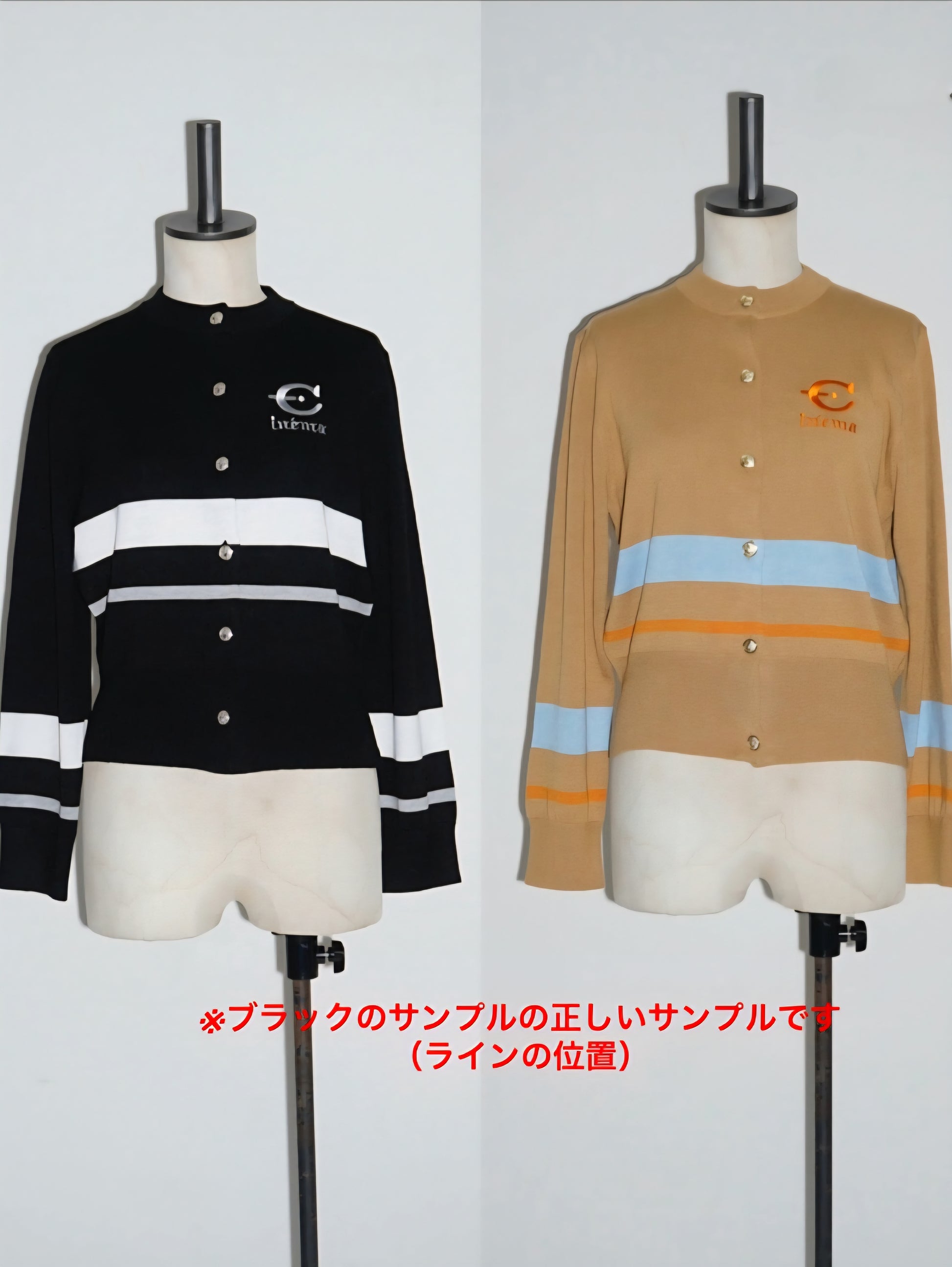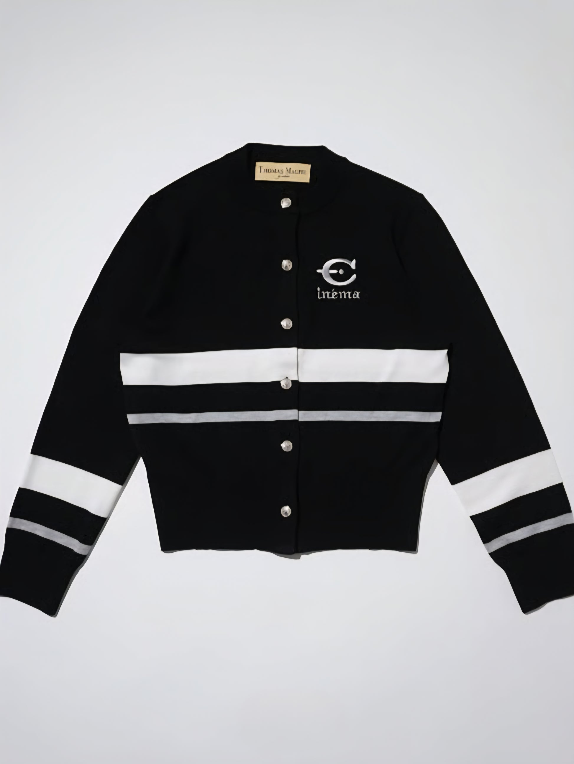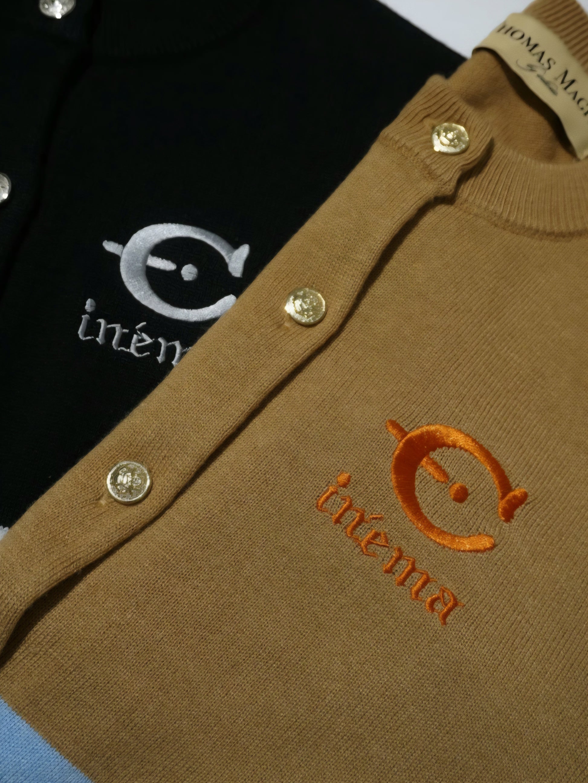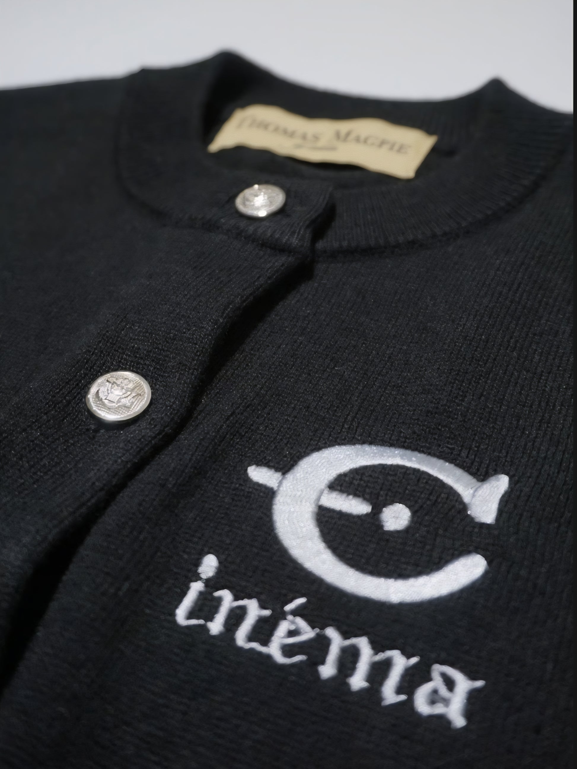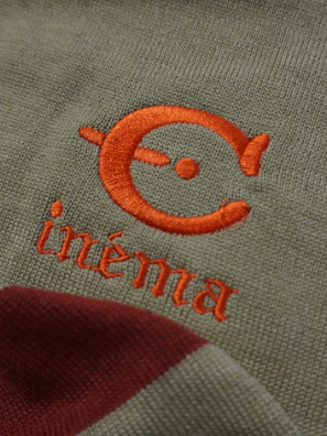 今回のテーマである映画’’CINEMA’’とフランス語で刺繍を胸にワンポイントで入れています。ボタンはキャメルにブルーライン、金ボタンを配しました。ブラックはホワイトのライン、シルバーボタンです。最近はコンパクトなニットを好みます。