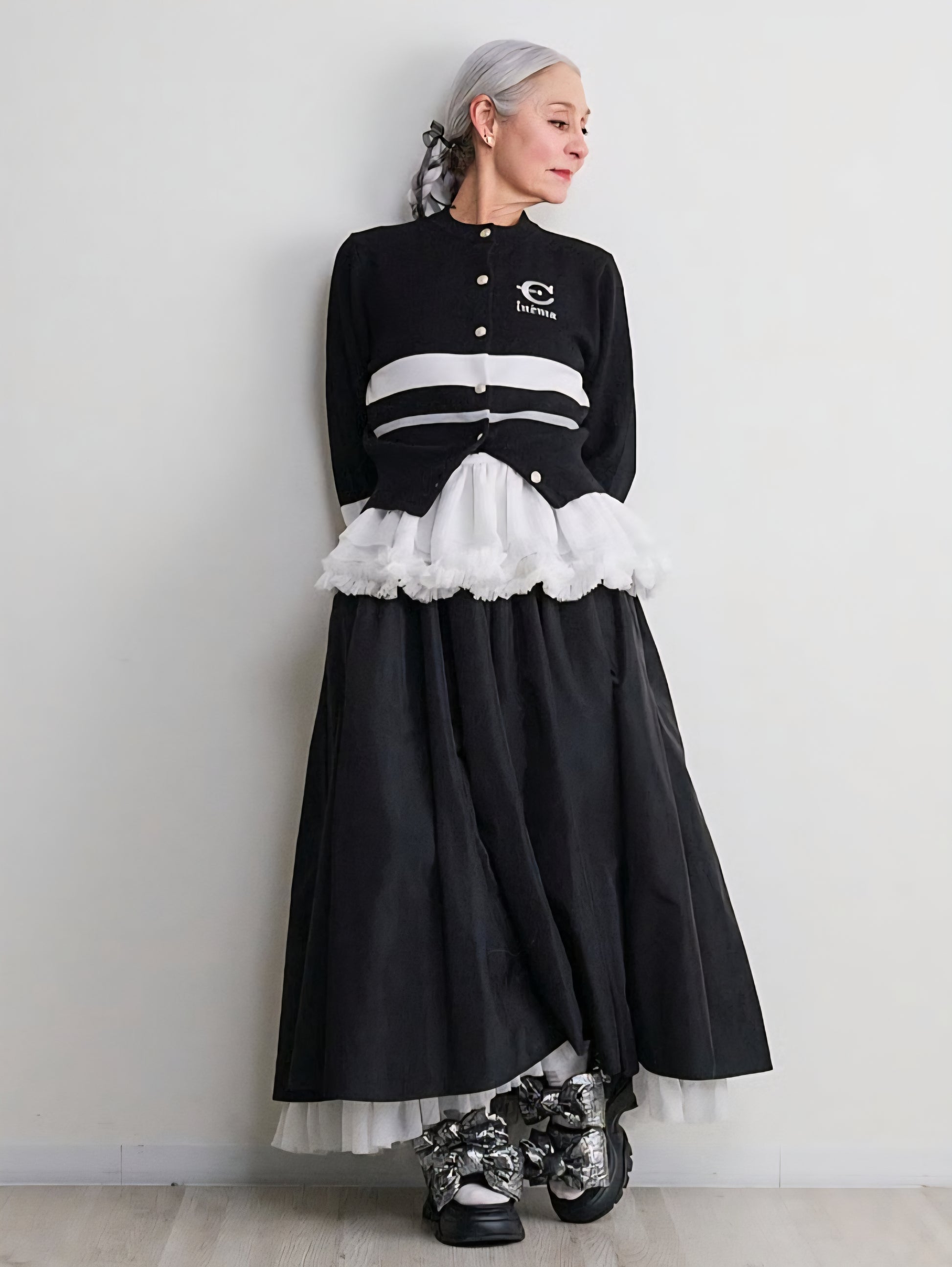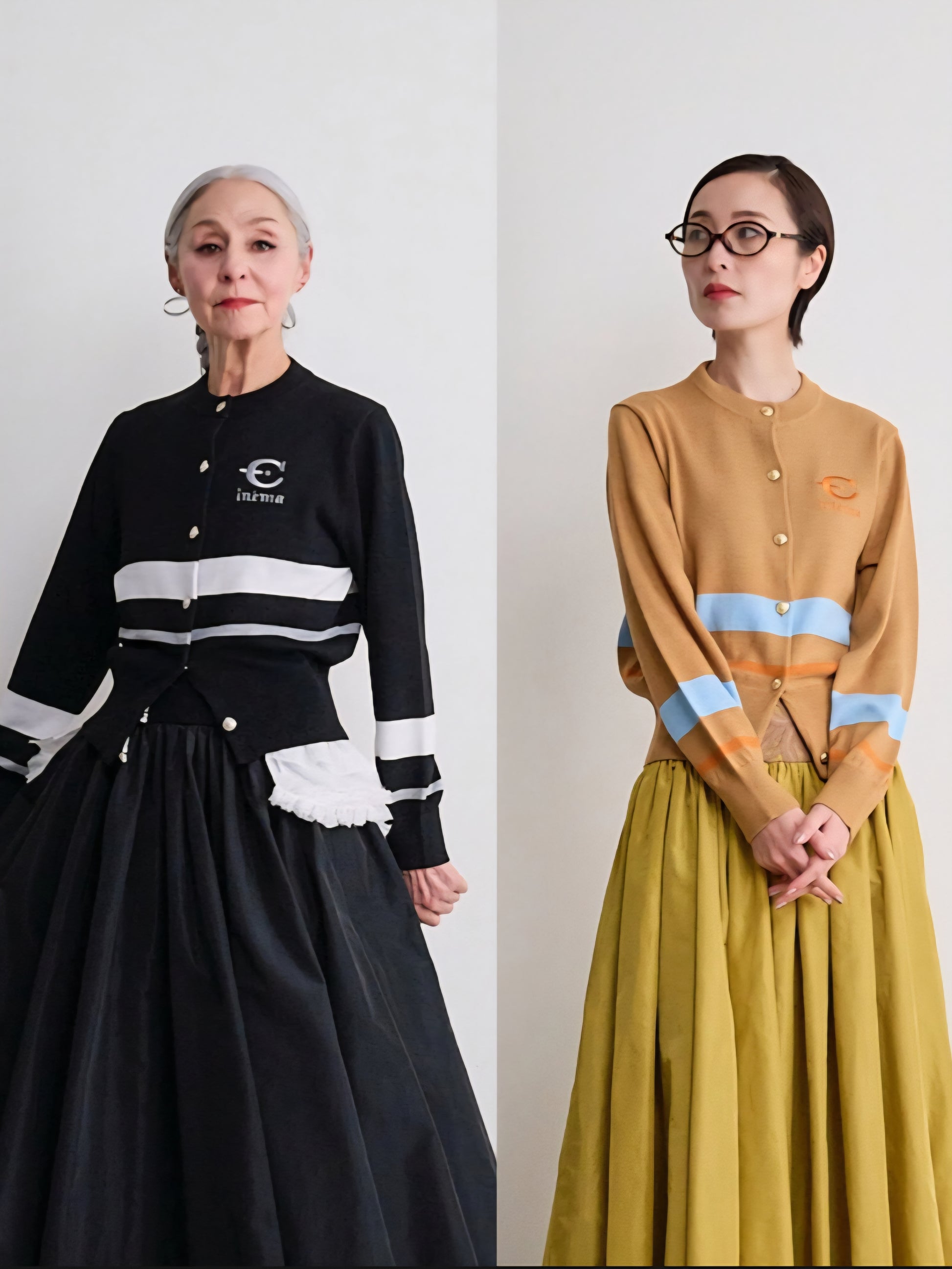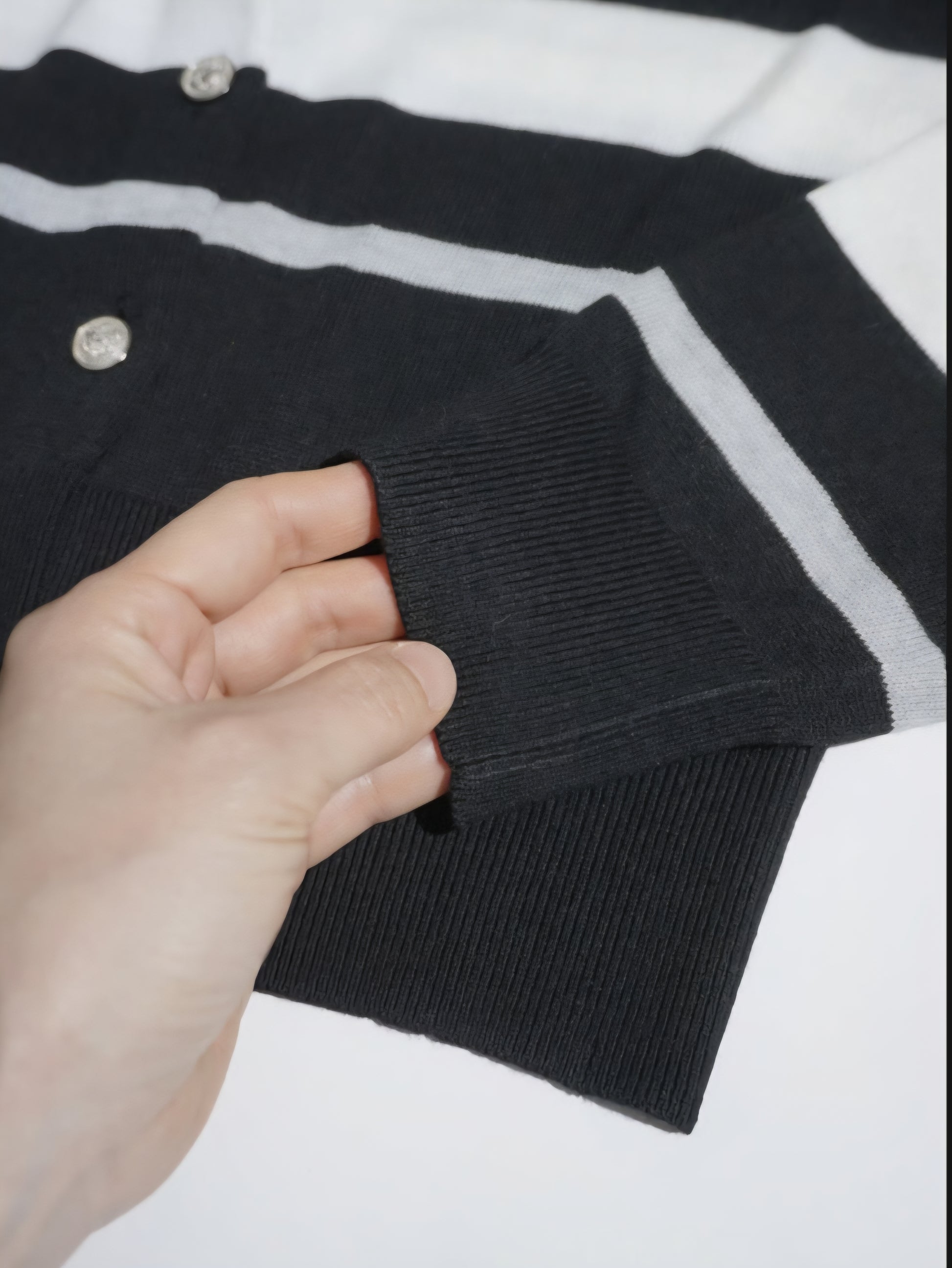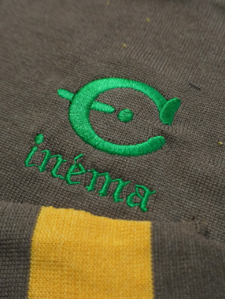 今回のテーマである映画’’CINEMA’’とフランス語で刺繍を胸にワンポイントで入れています。ボタンはキャメルにブルーライン、金ボタンを配しました。ブラックはホワイトのライン、シルバーボタンです。最近はコンパクトなニットを好みます。