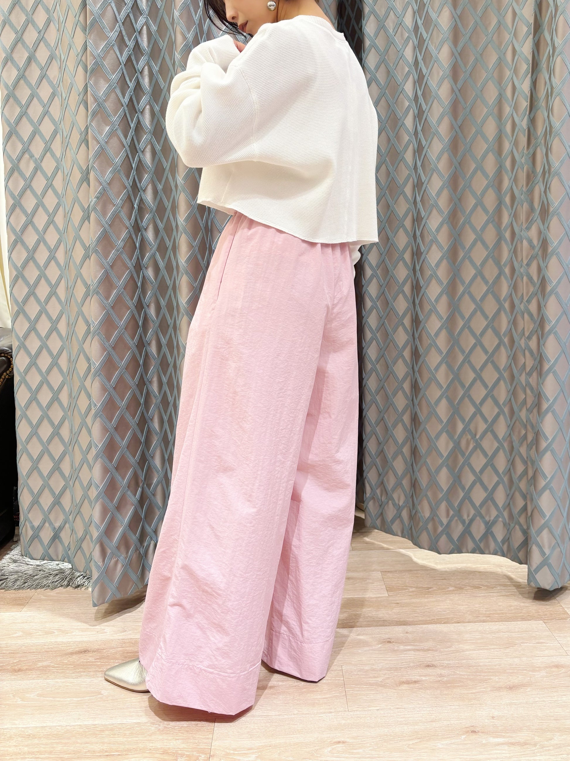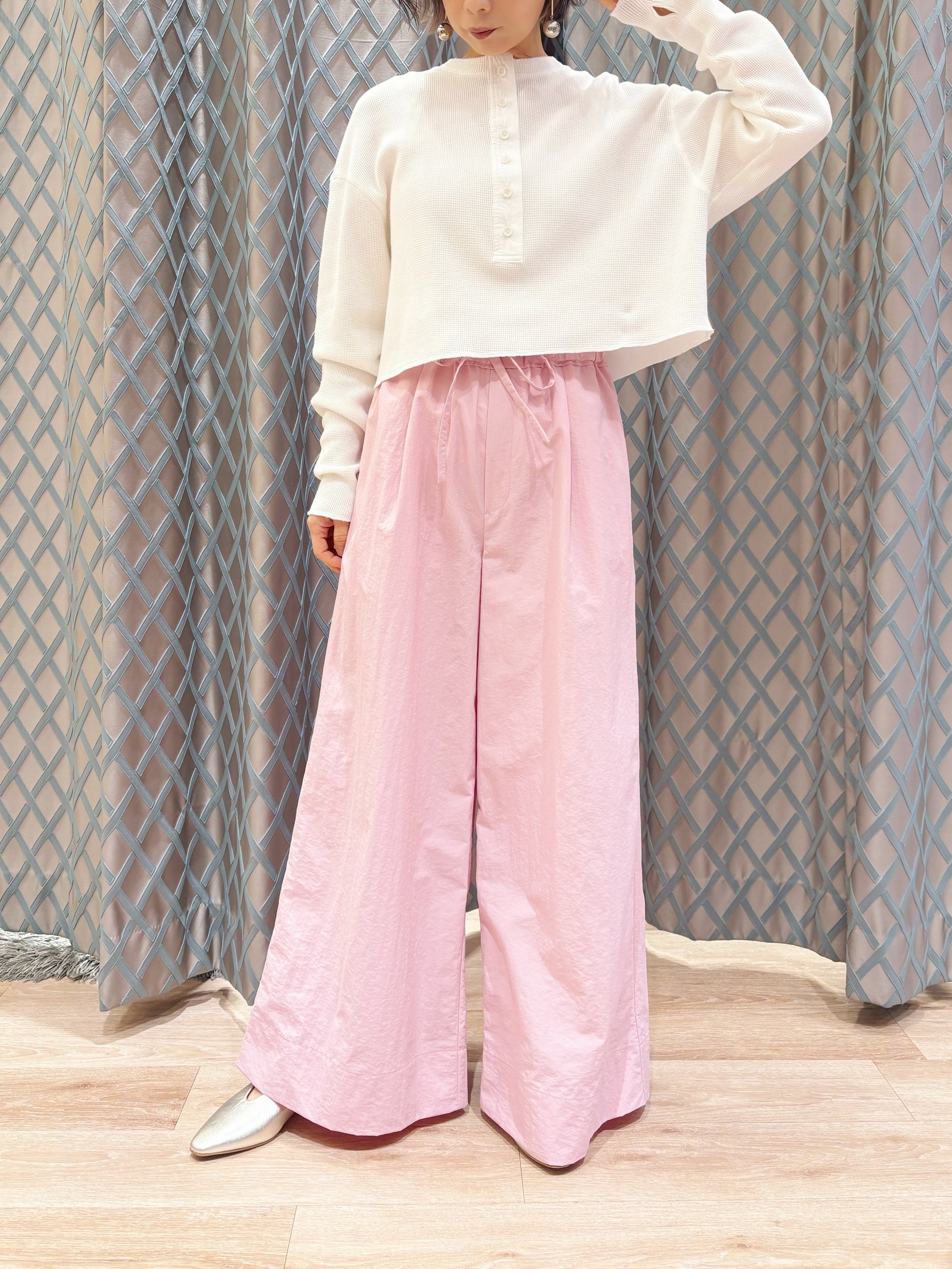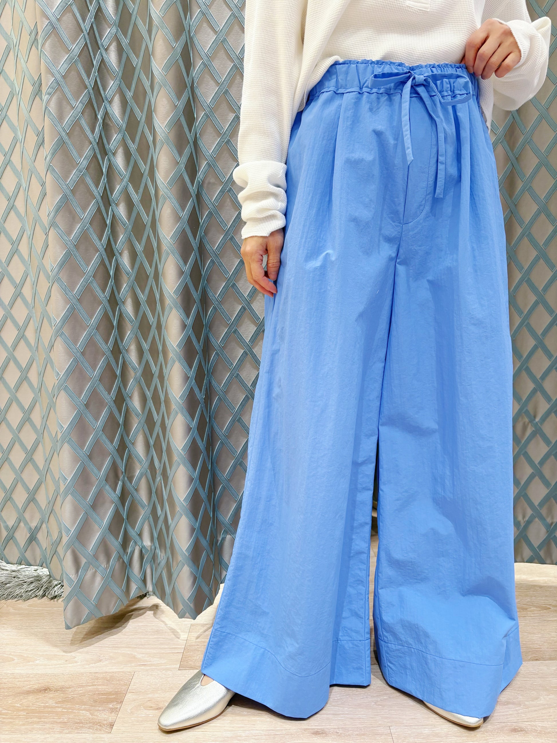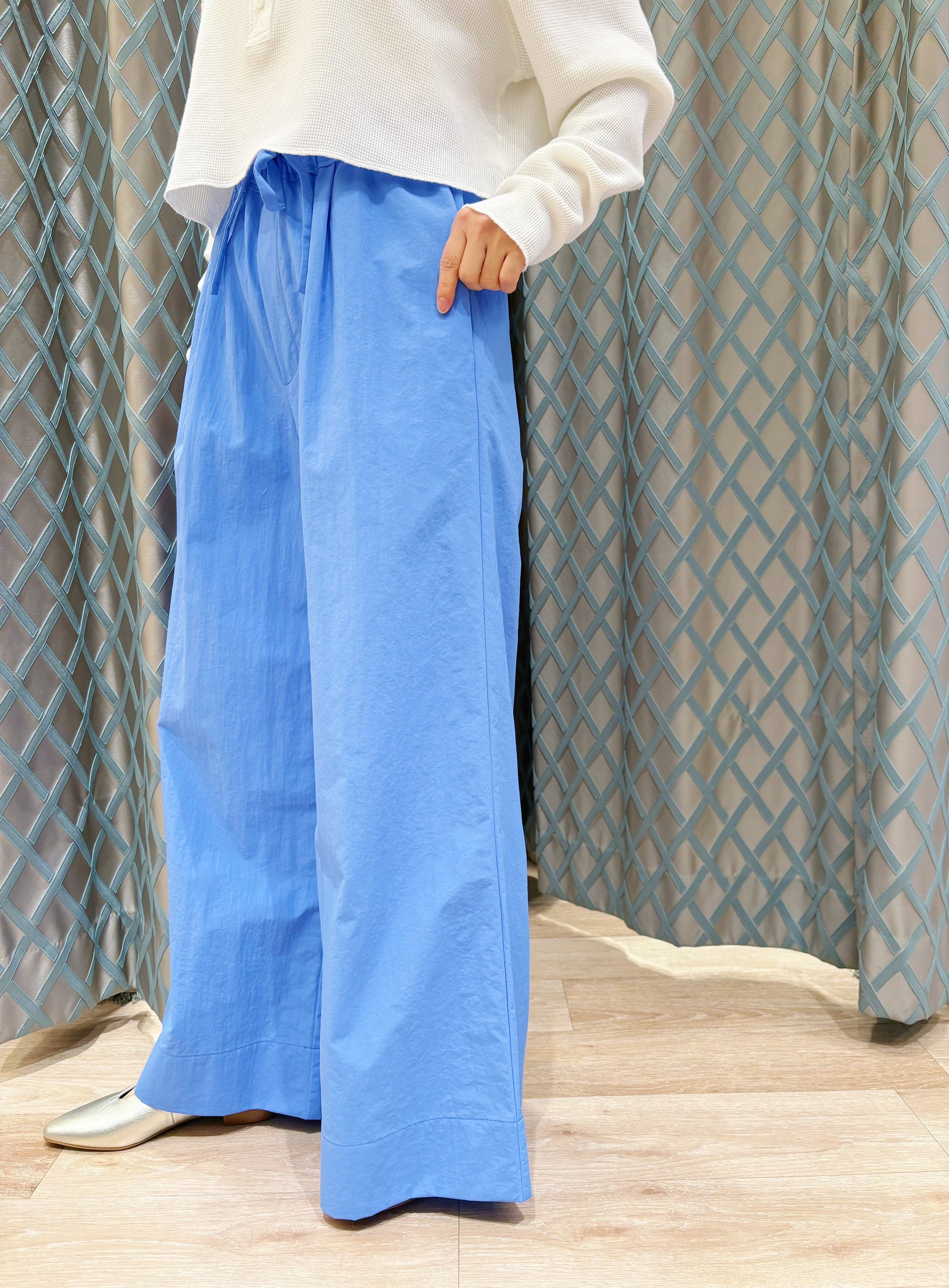 コンパクトなカットソーやブラウスを合わせて、パンツの軽やかな素材感を引き立てたスタイルがおすすめです😊