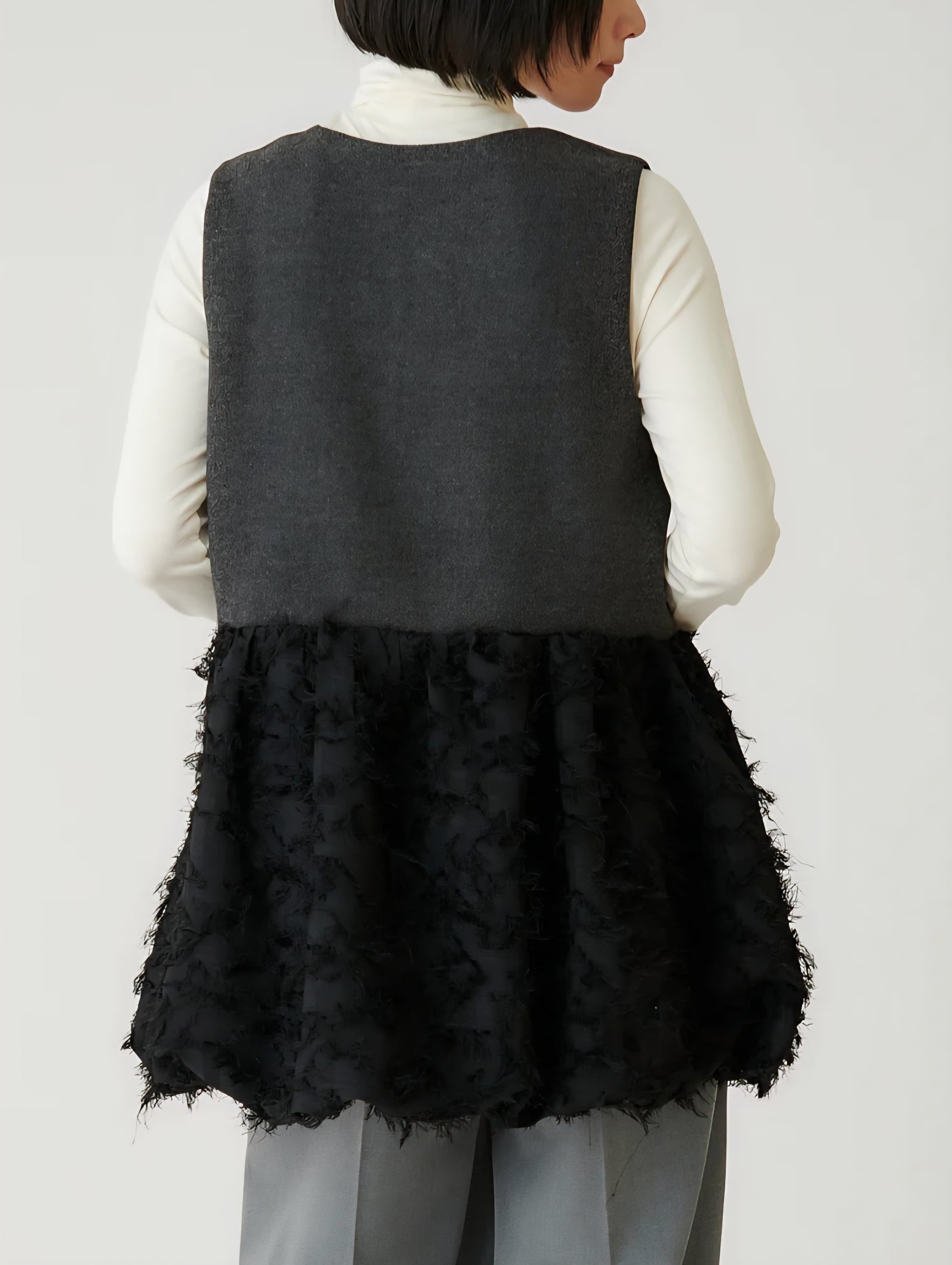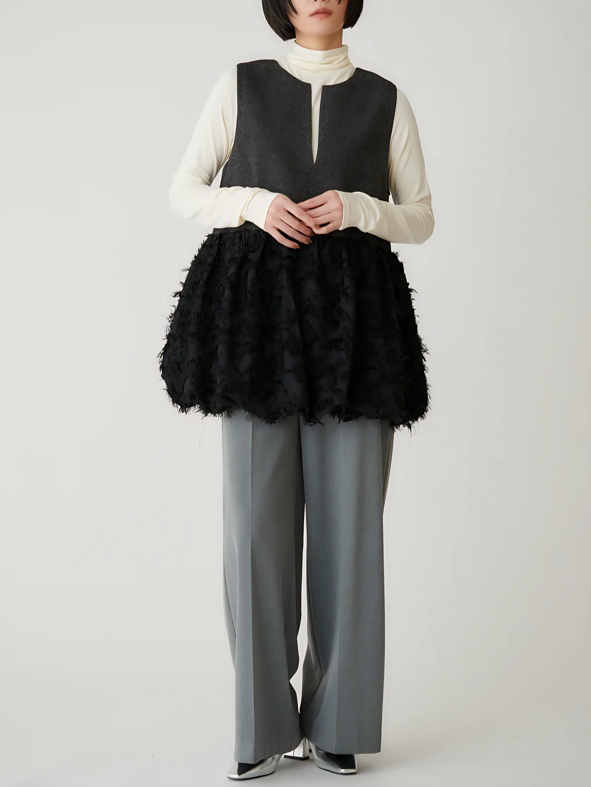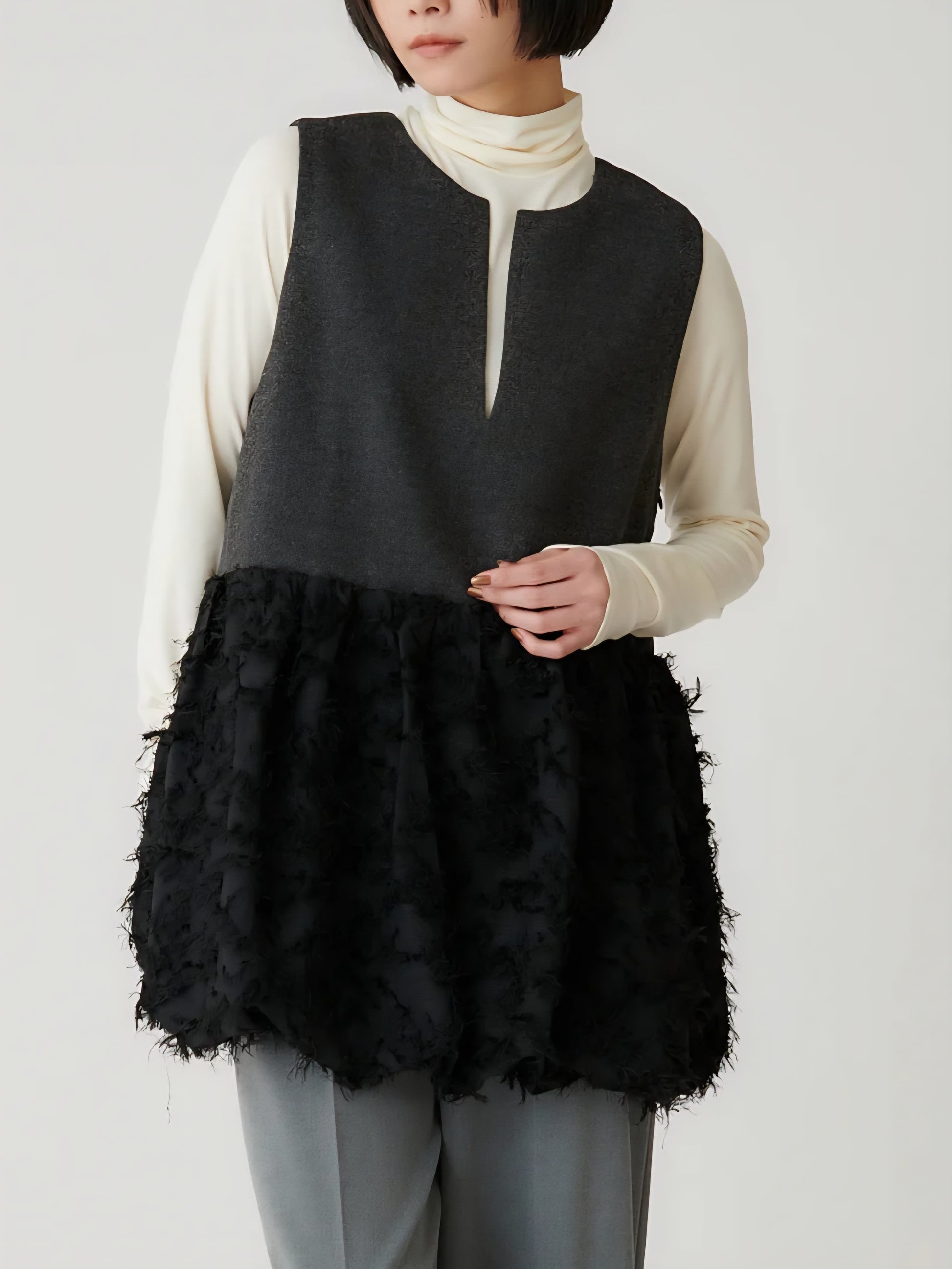 表情豊かなツイードと、繊細なカットジャガード素材を組み合わせた異素材デザインは、
