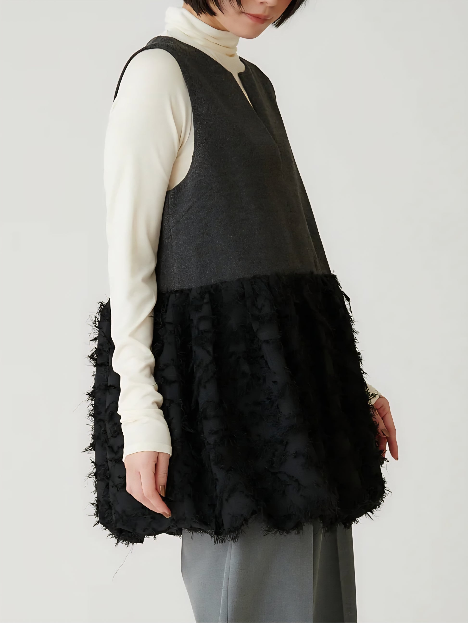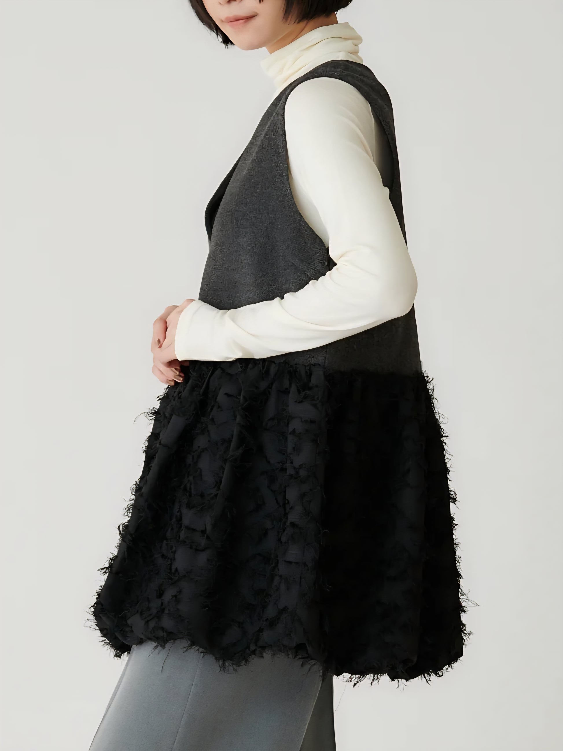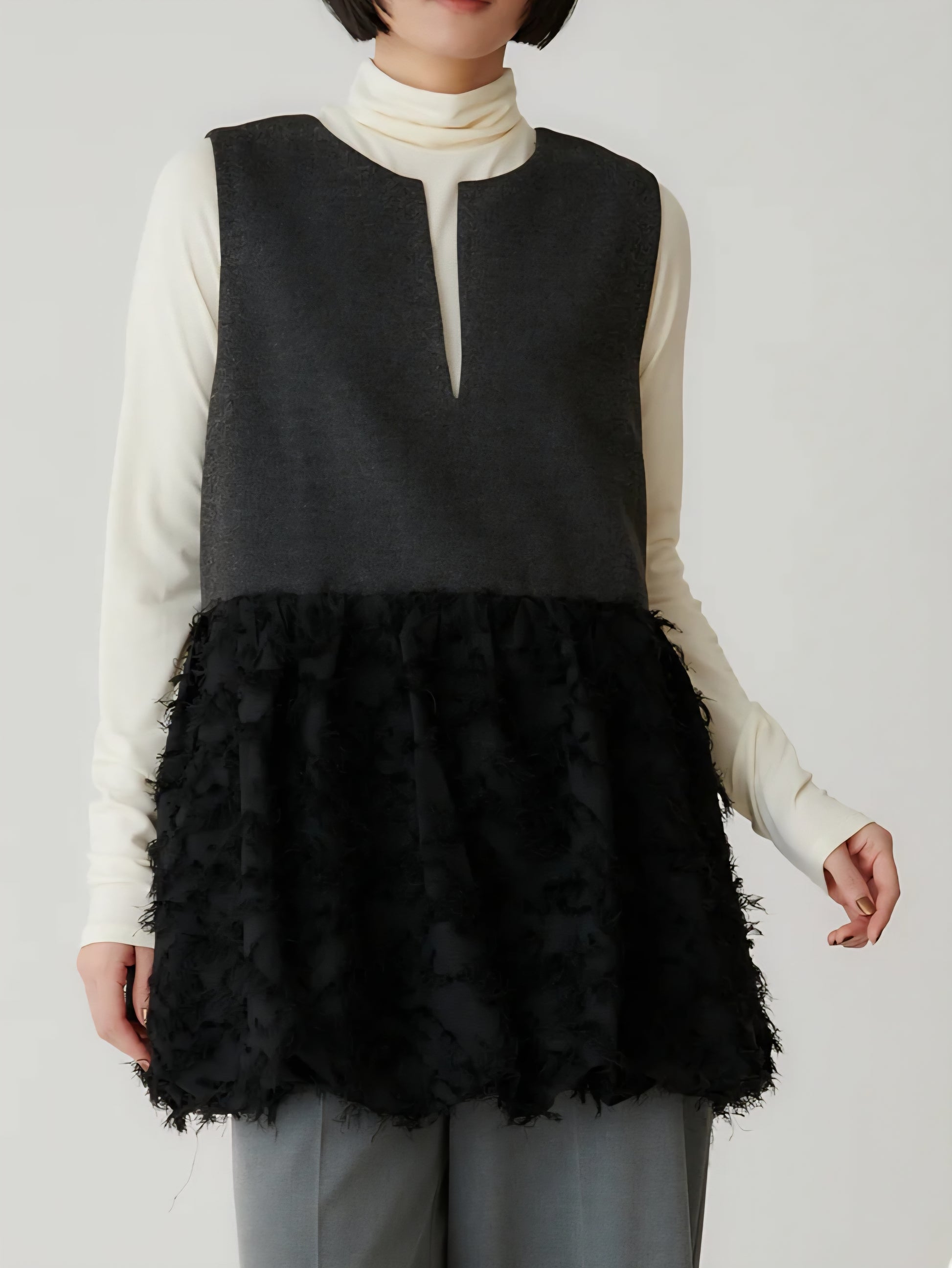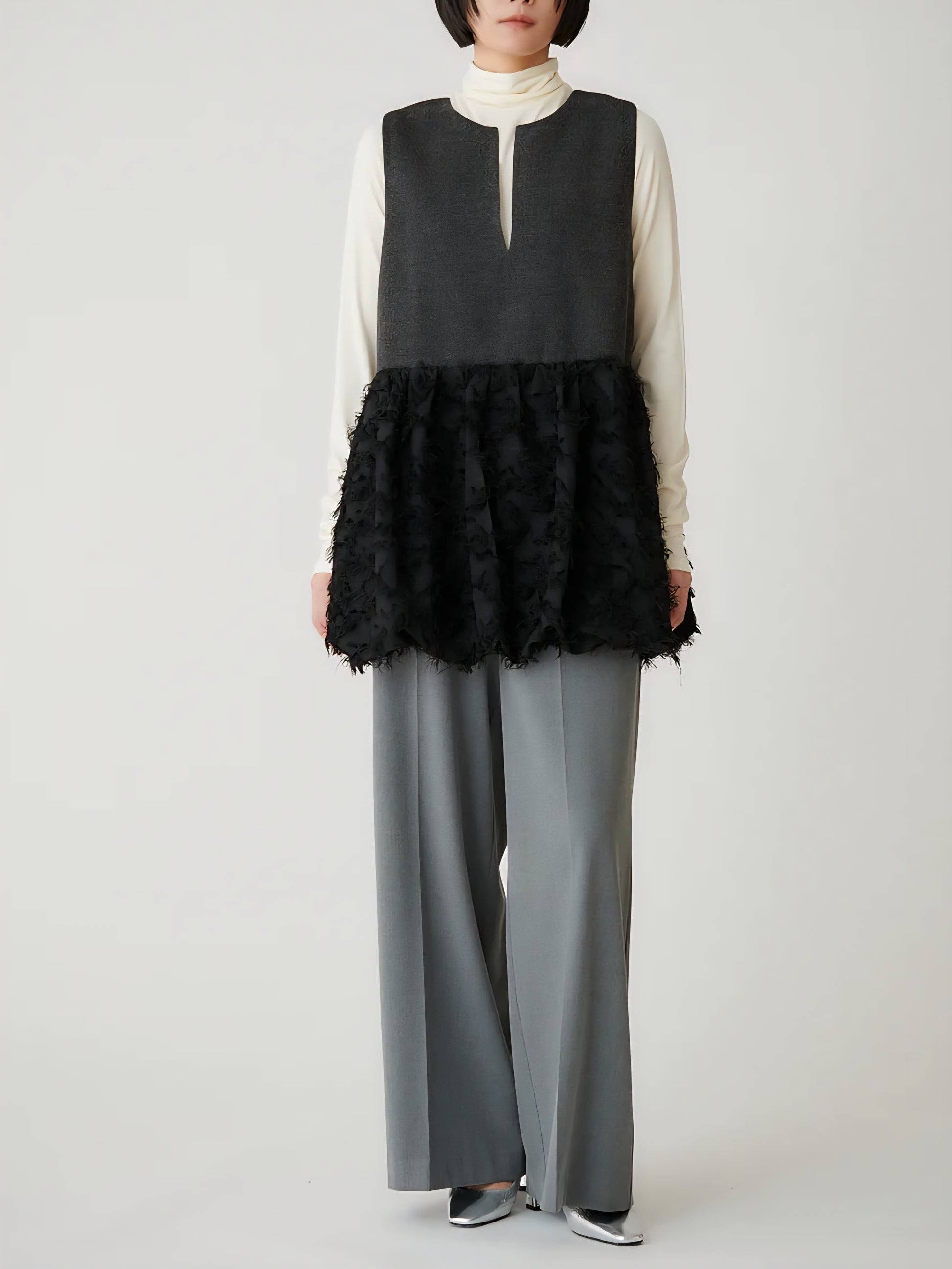 表情豊かなツイードと、繊細なカットジャガード素材を組み合わせた異素材デザインは、