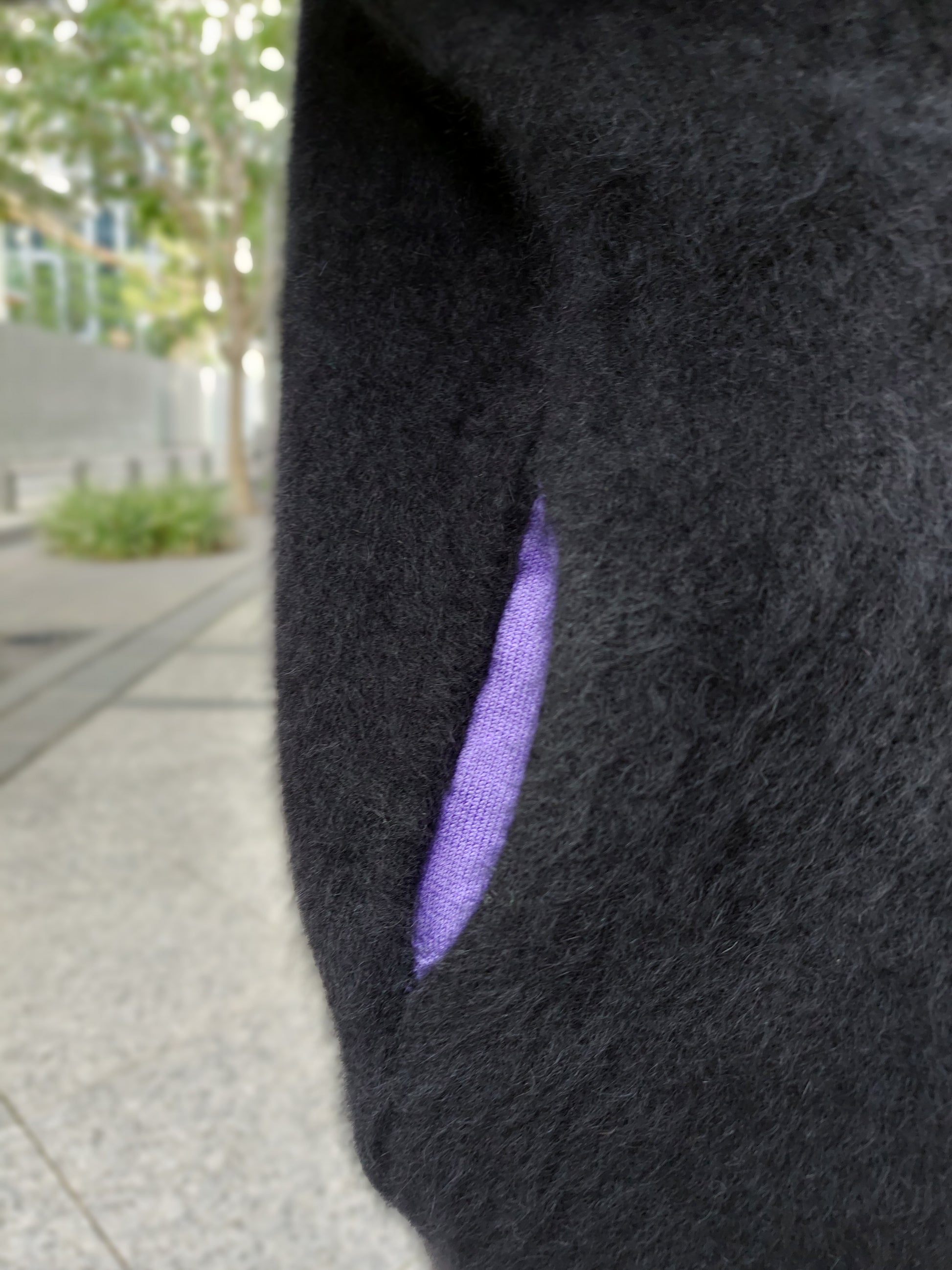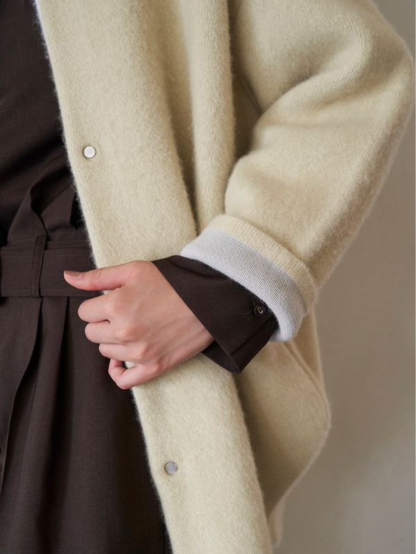 1重だと柔らかすぎてフェミニンになり過ぎる毛足の長い素材を、2重編みにすることで、保温性と共にデイリーに昇華。