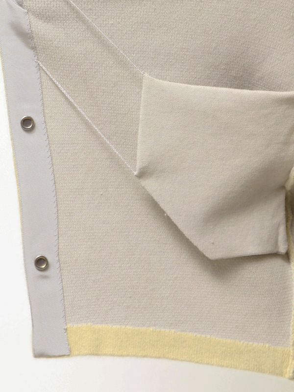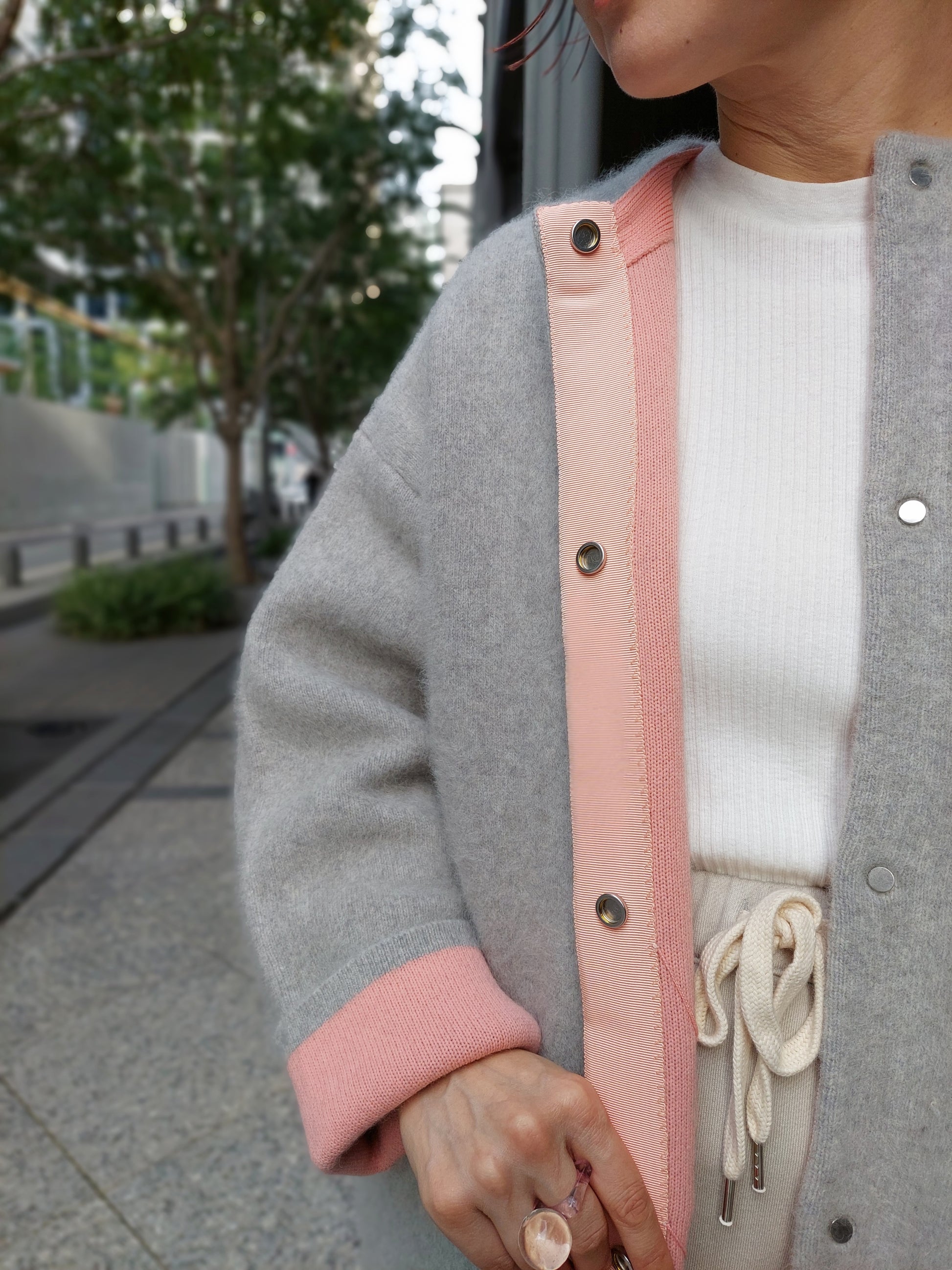 前開きボタンにはグログランリボンを施し、アウター見えする上品な仕上がりに。