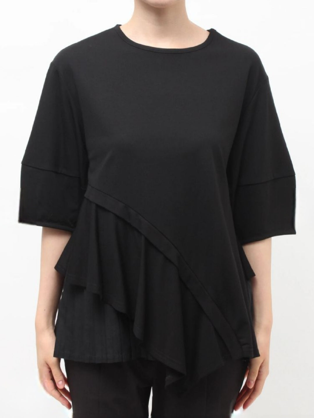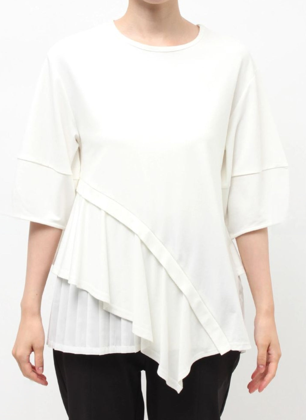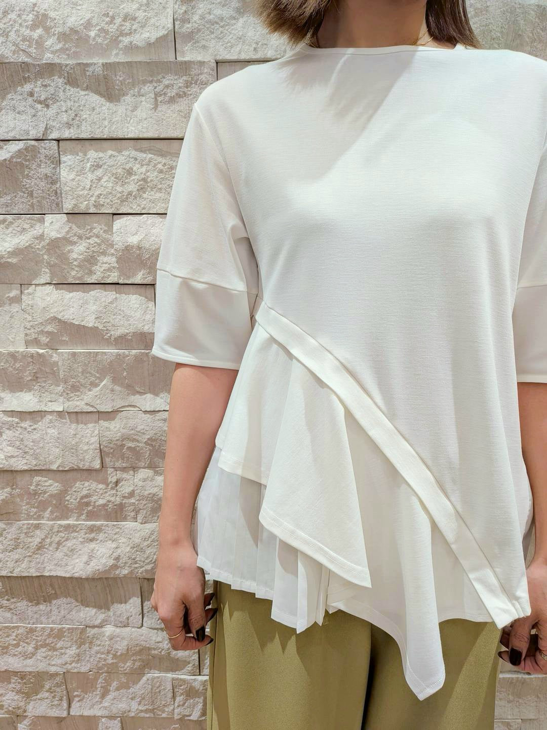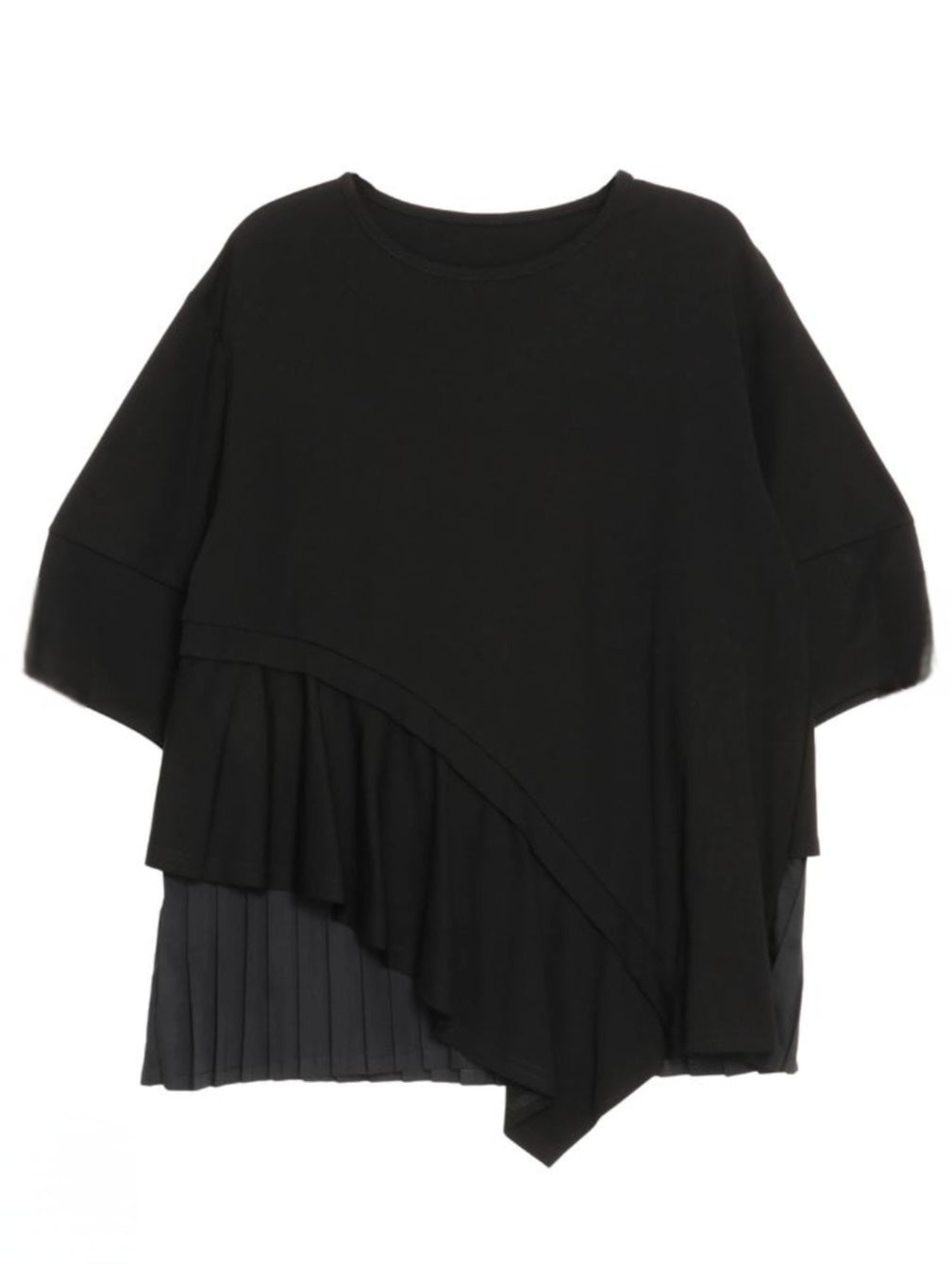 裾にかけて斜めに切り替えを入れフレアとプリーツをドッキングした一枚で着映えするデザインTシャツ♡