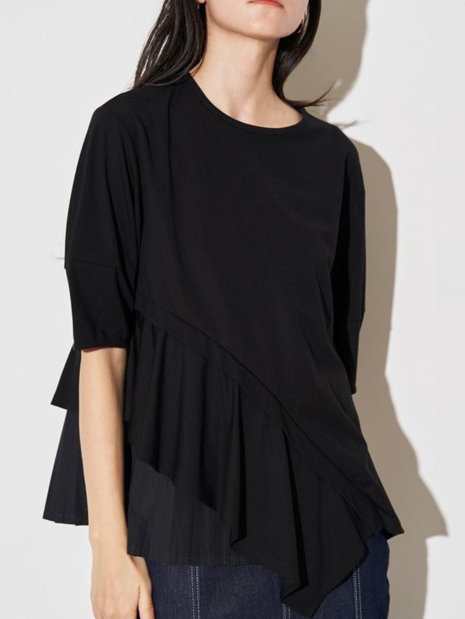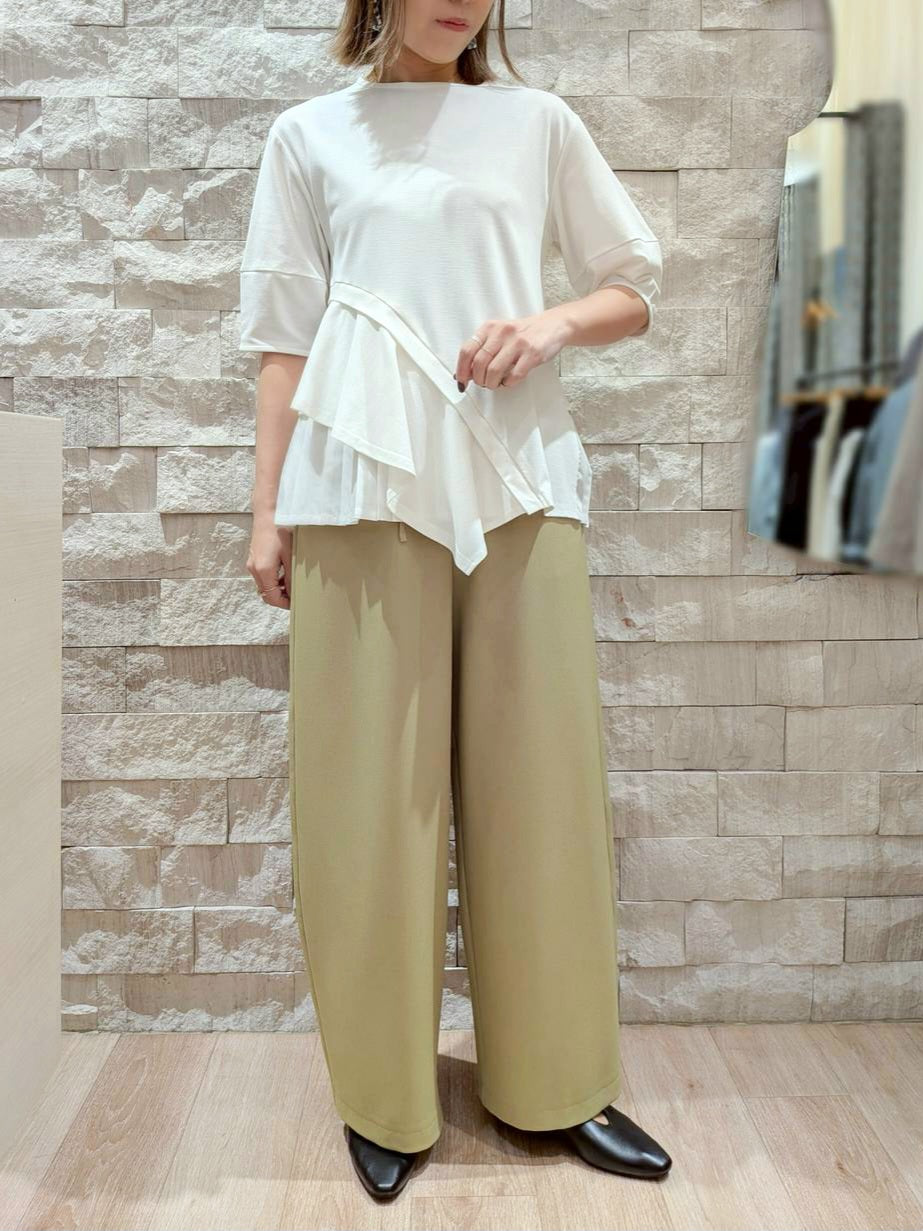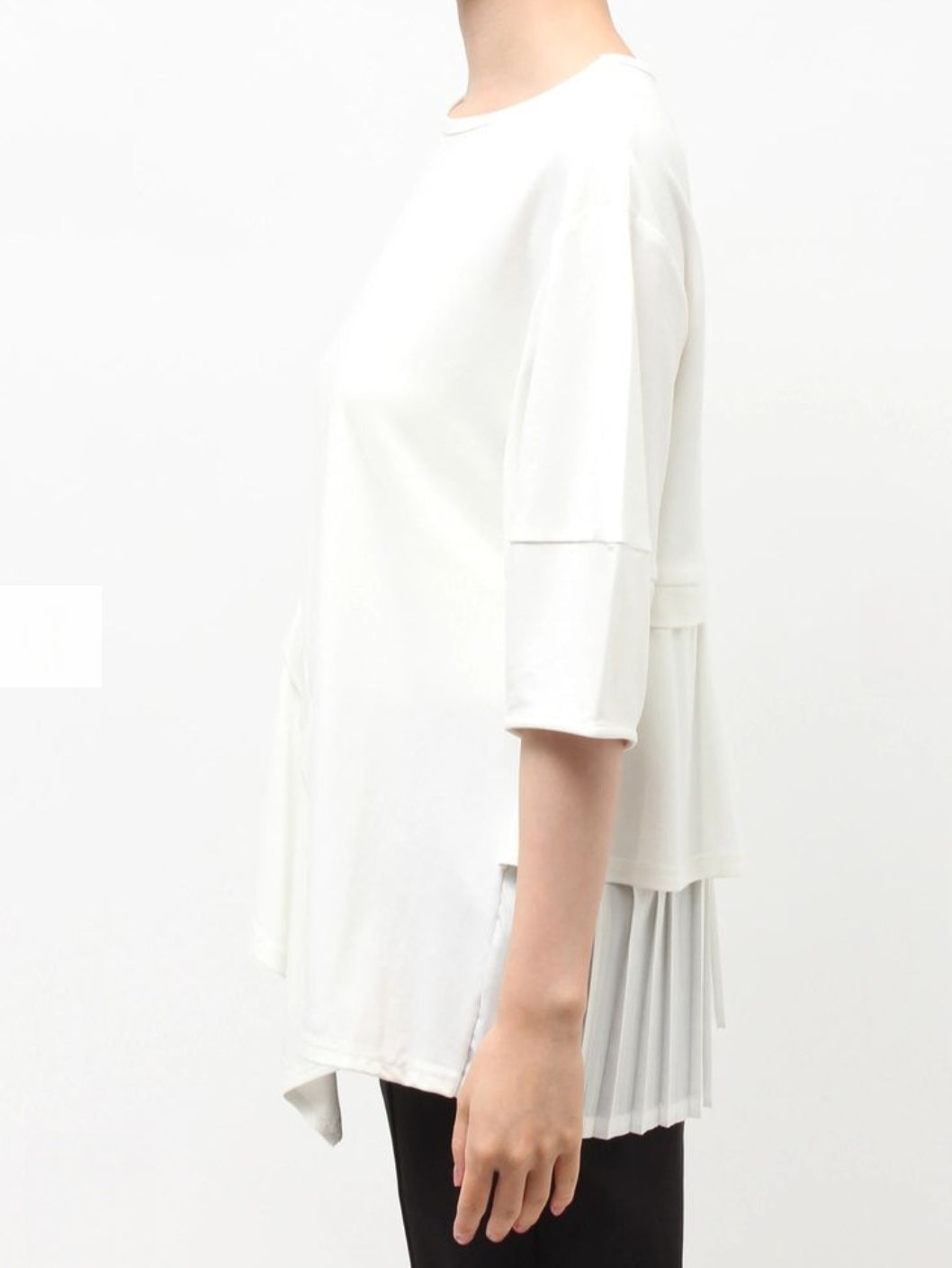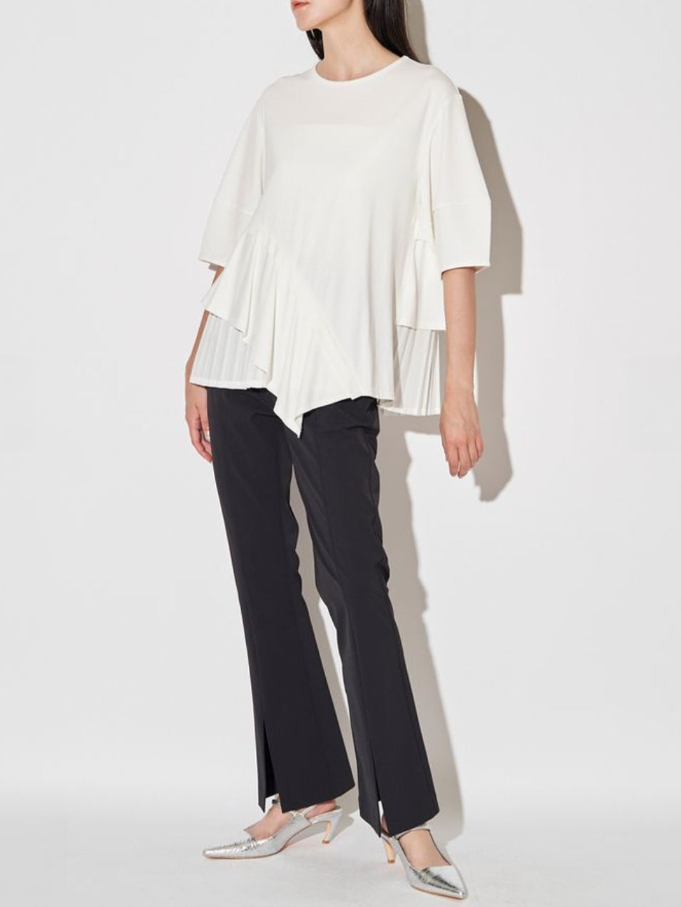 裾にかけて斜めに切り替えを入れフレアとプリーツをドッキングした一枚で着映えするデザインTシャツ♡