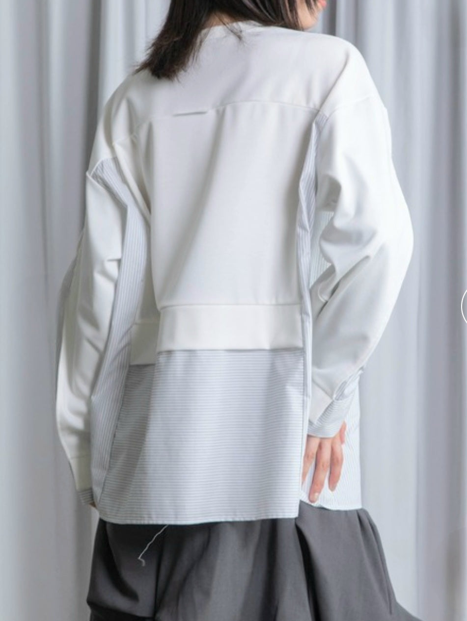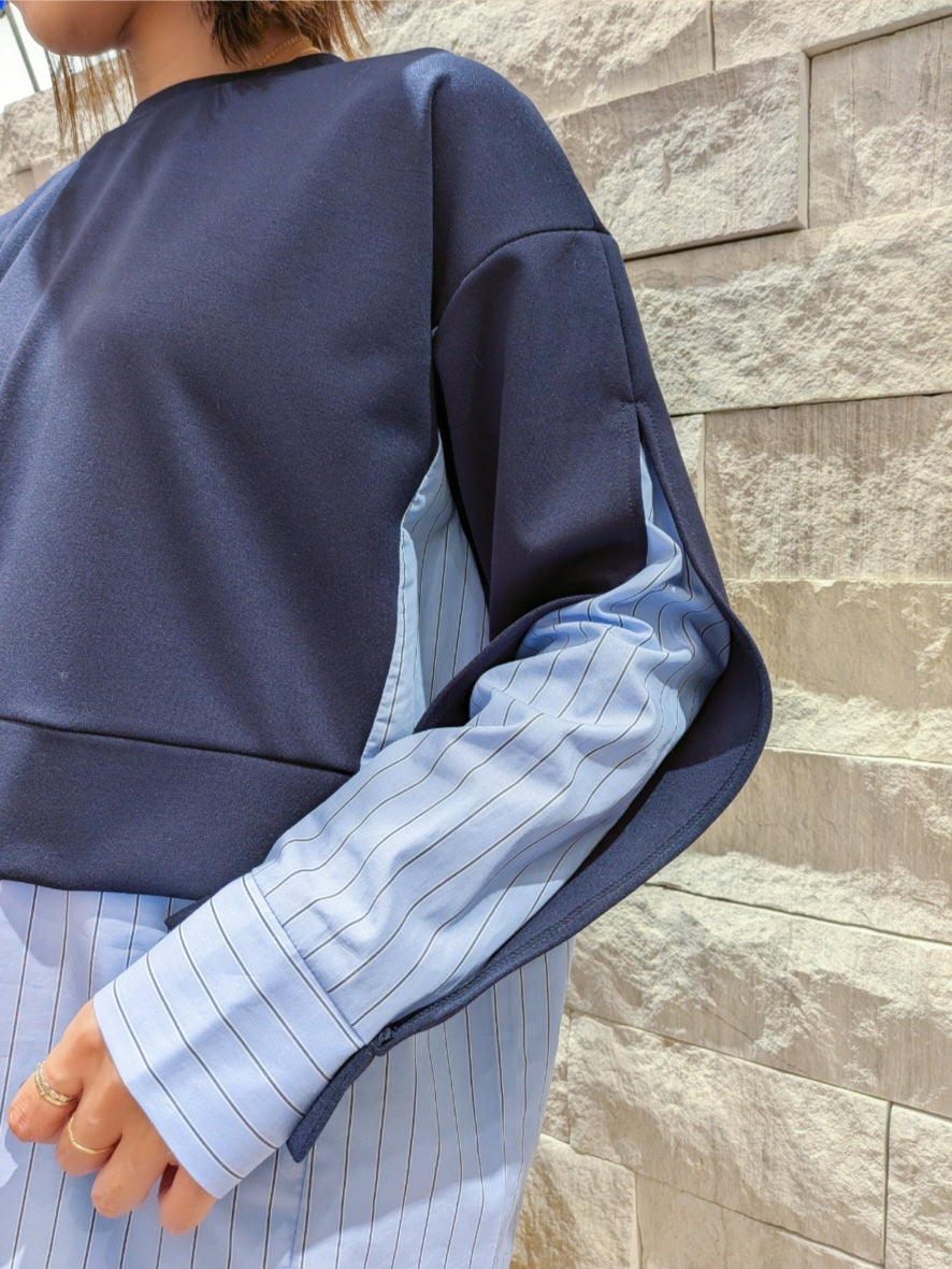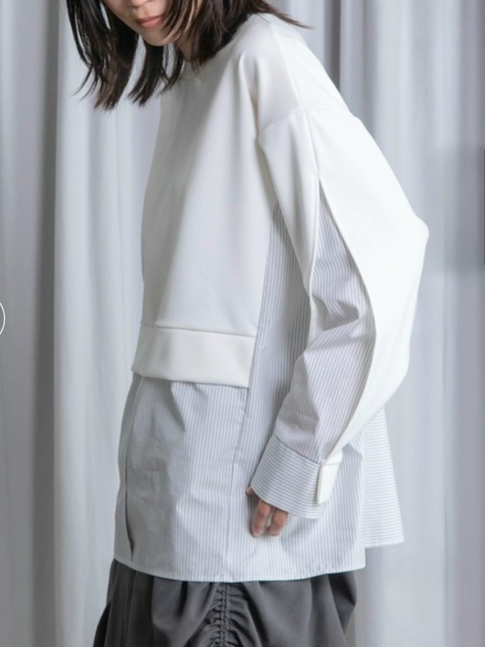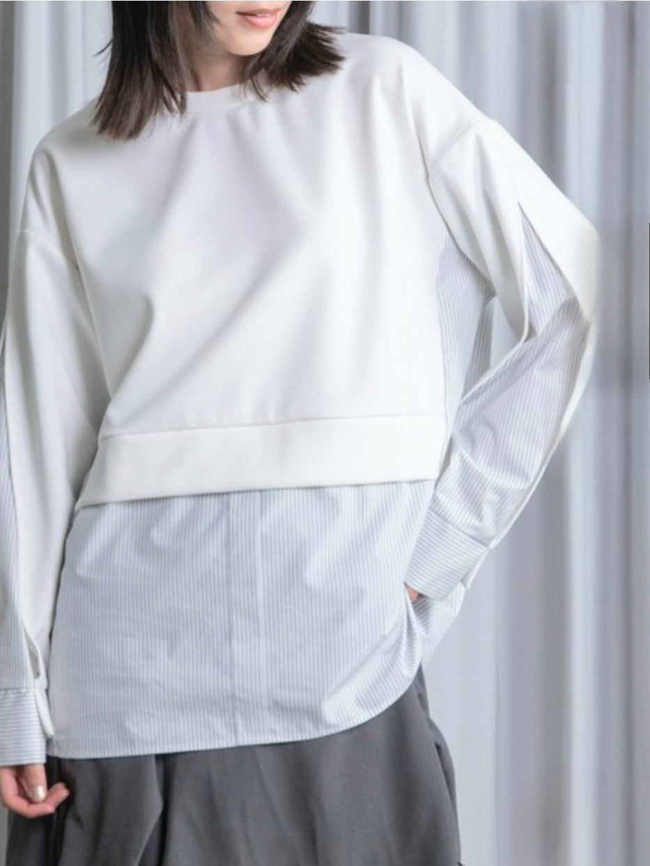 シャツライクな素材とカットソーを組み合わせた、モード感漂う長袖トップス!!