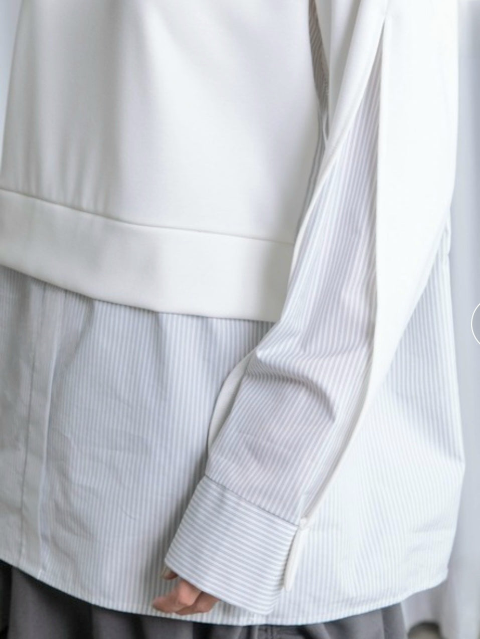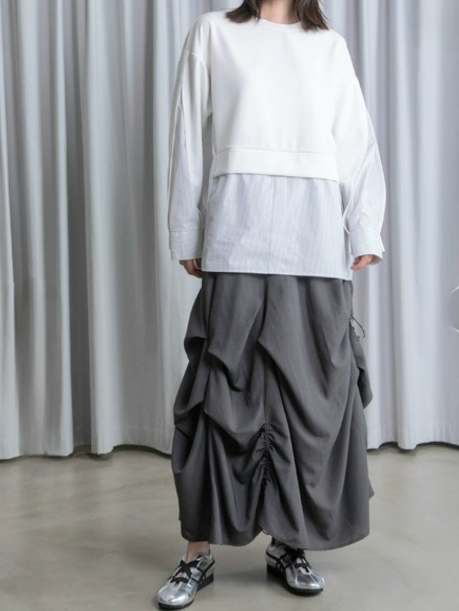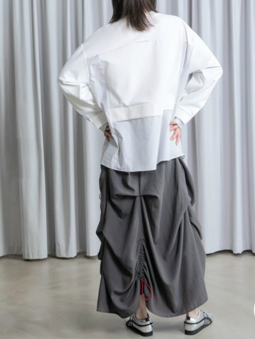 シャツライクな素材とカットソーを組み合わせた、モード感漂う長袖トップス!!