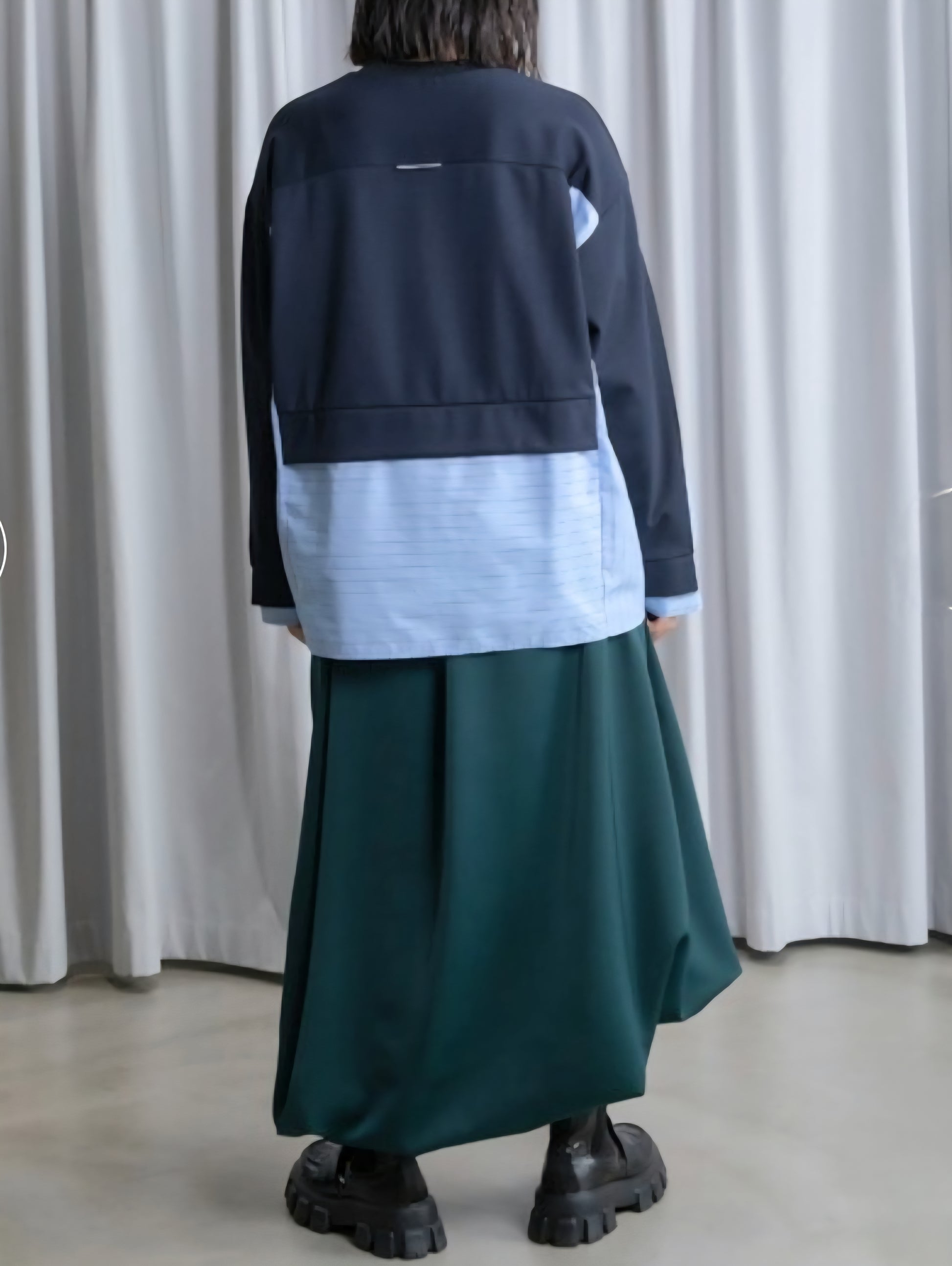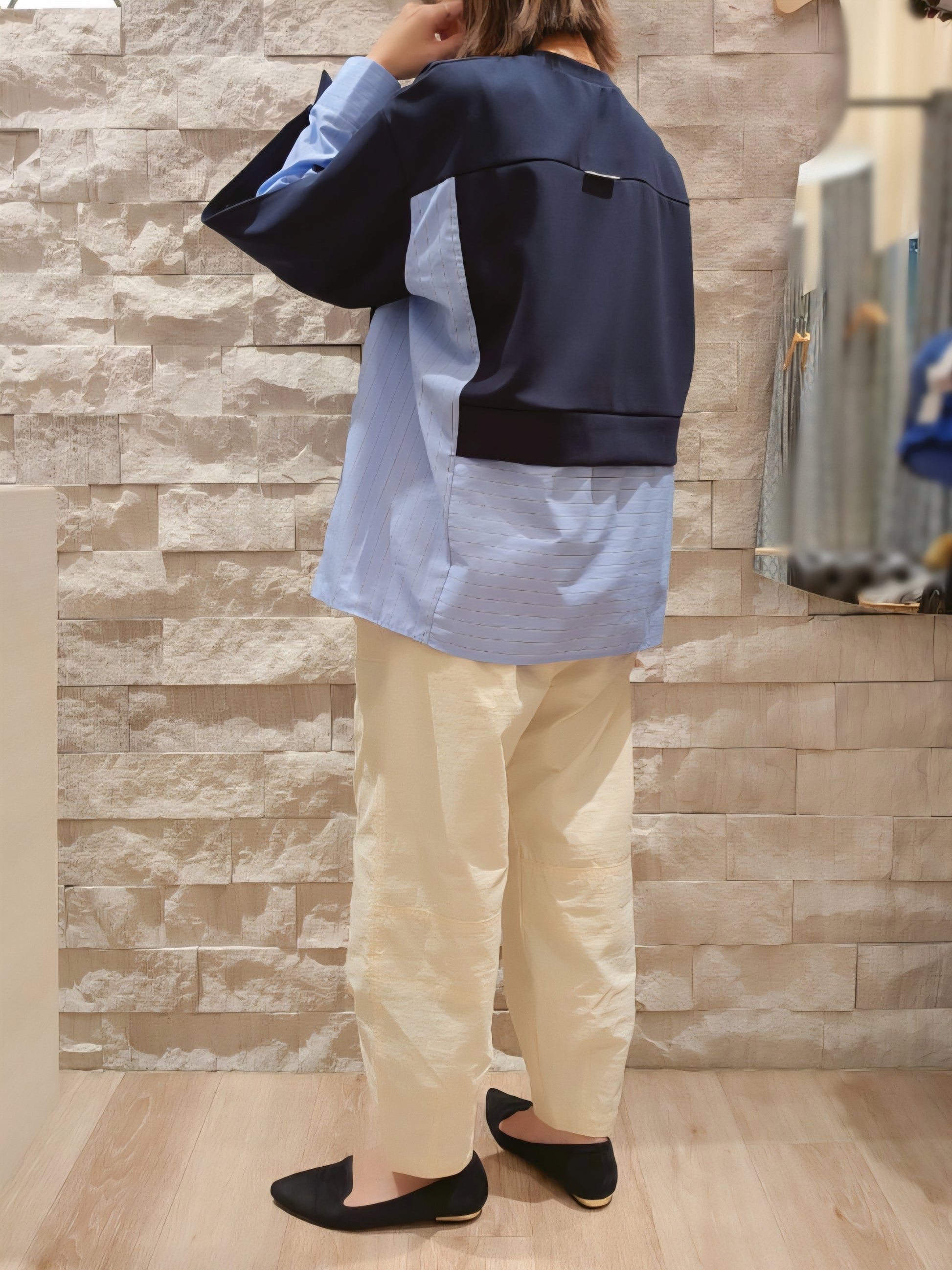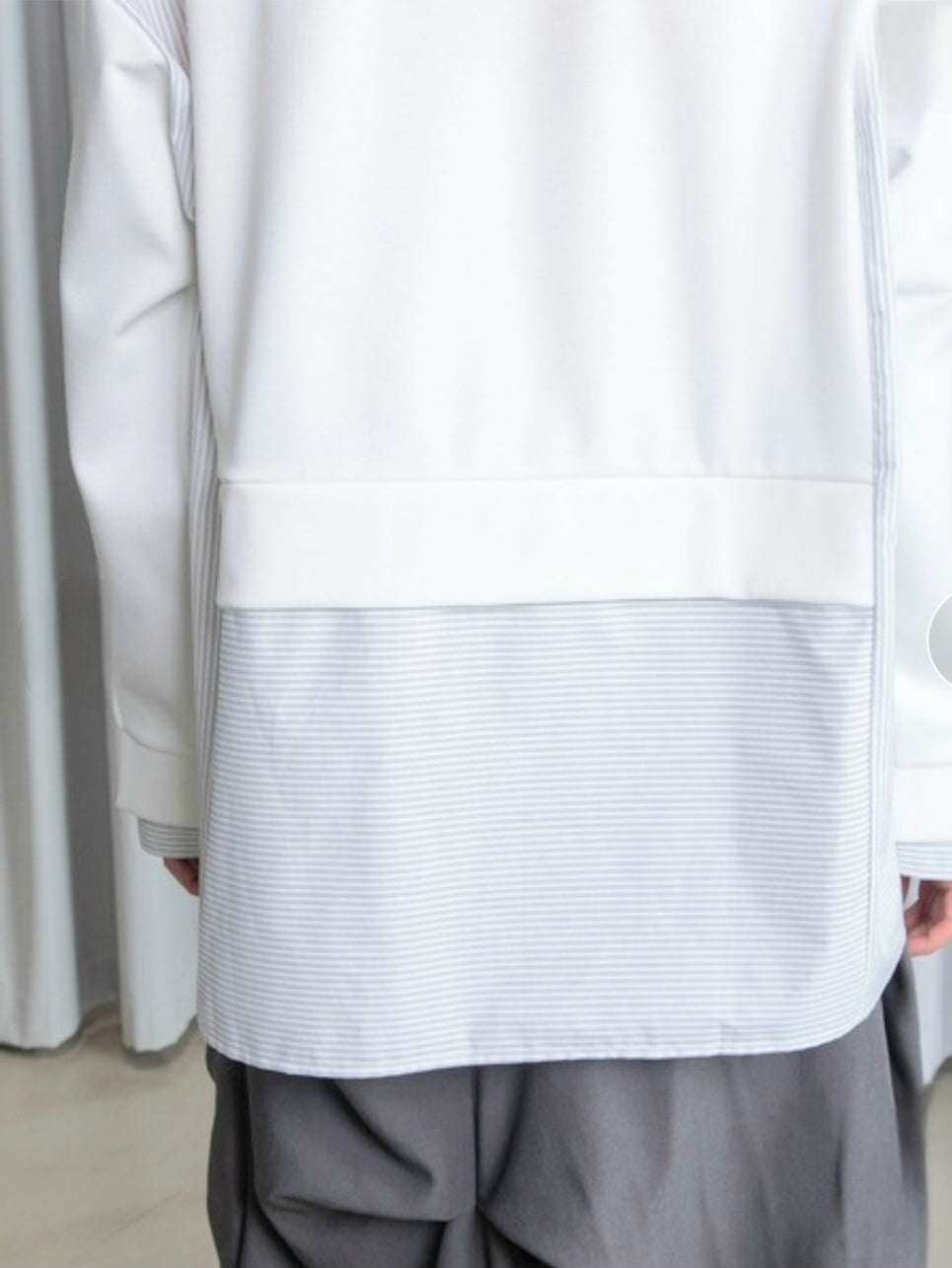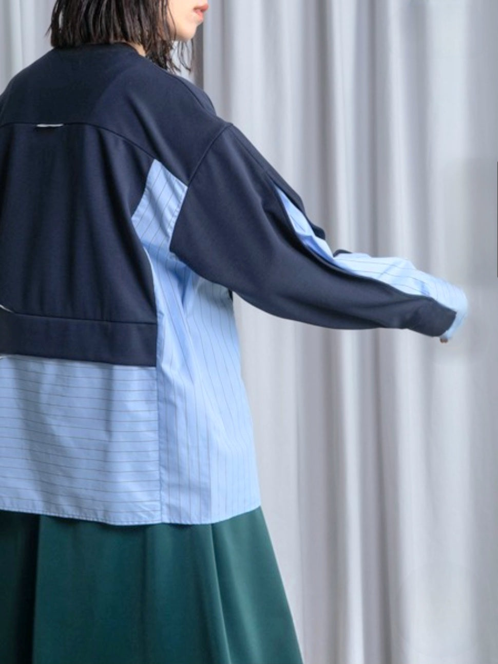 シャツライクな素材とカットソーを組み合わせた、モード感漂う長袖トップス!!
