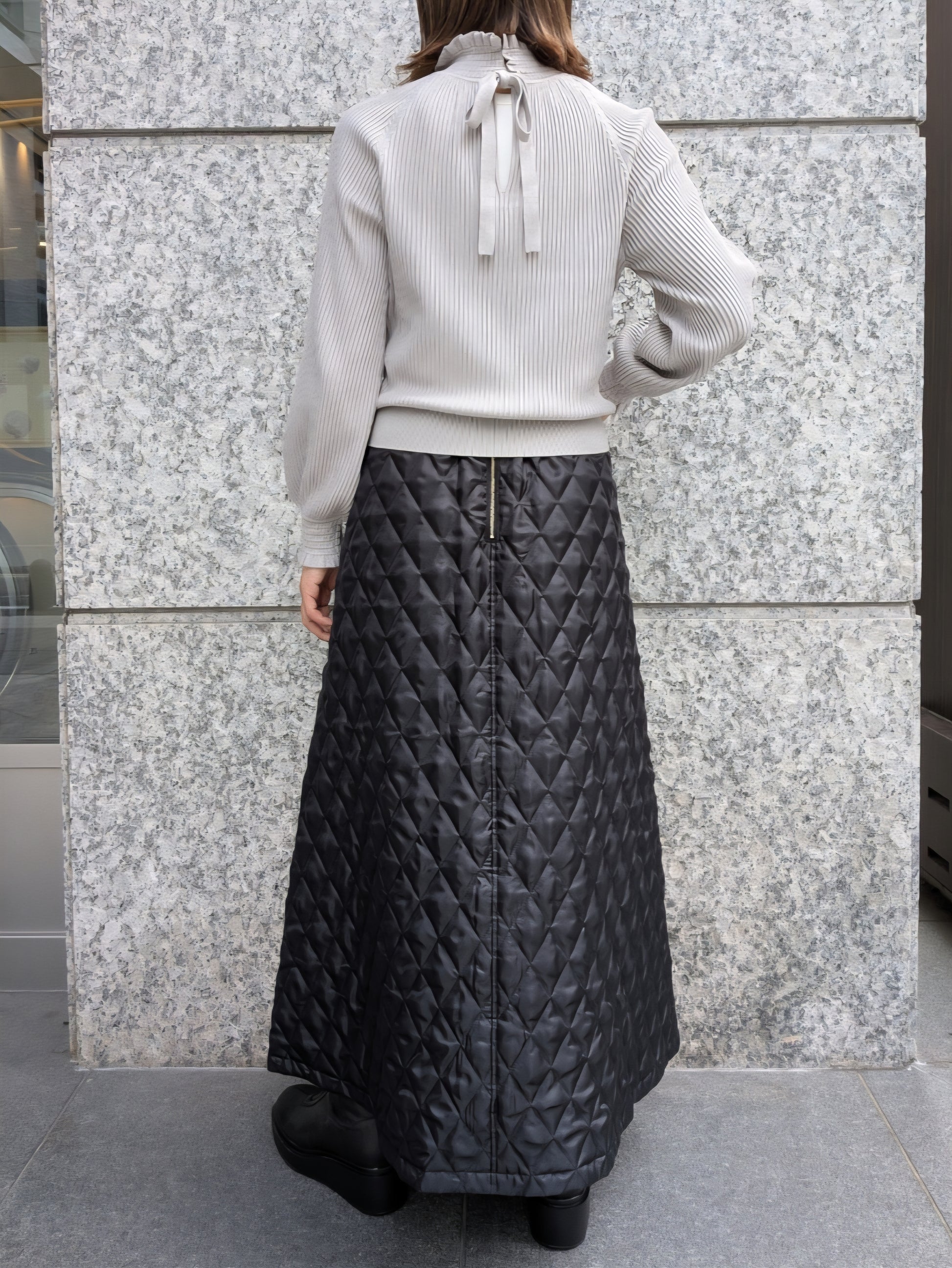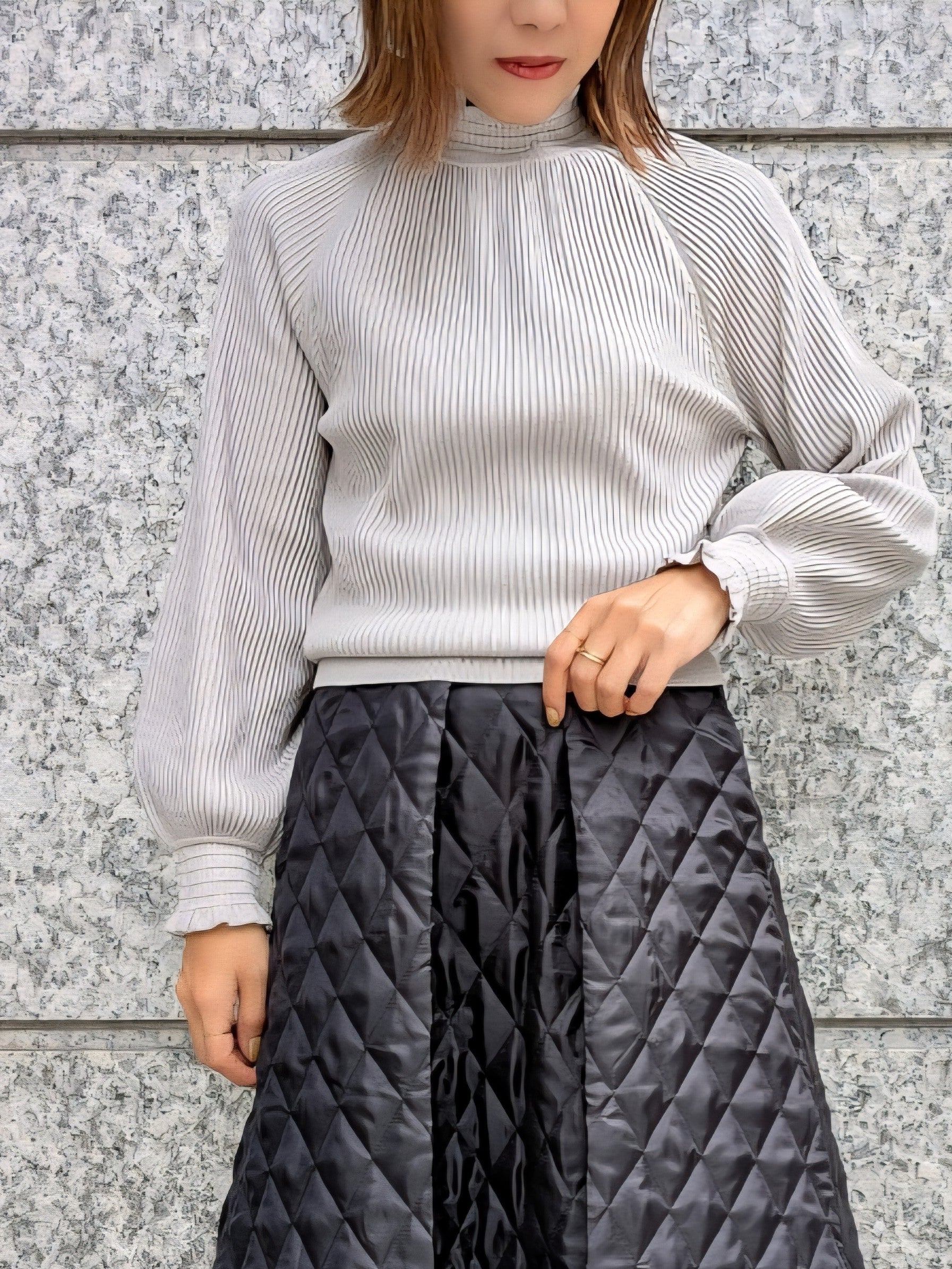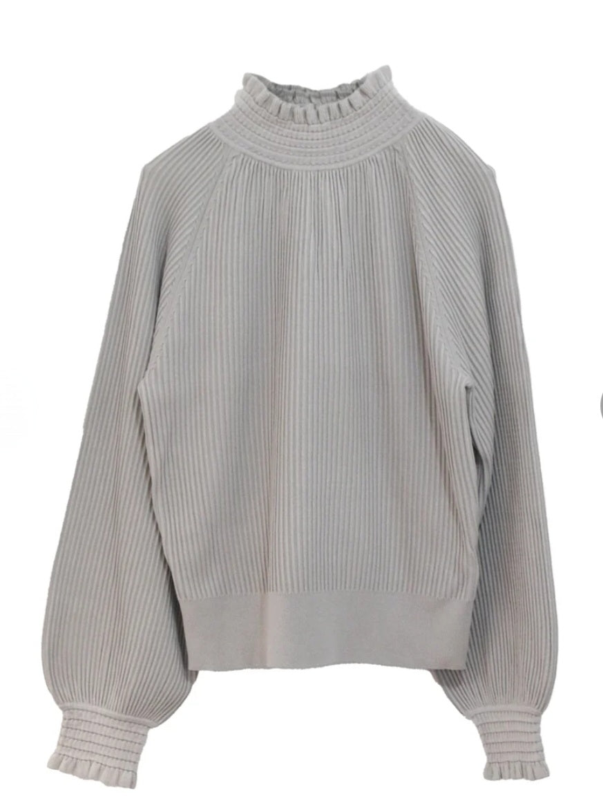 着ていただける季節が長く、扱いやすいレイヤードナイロン素材をリップル編みにしたブラウス風ニット。