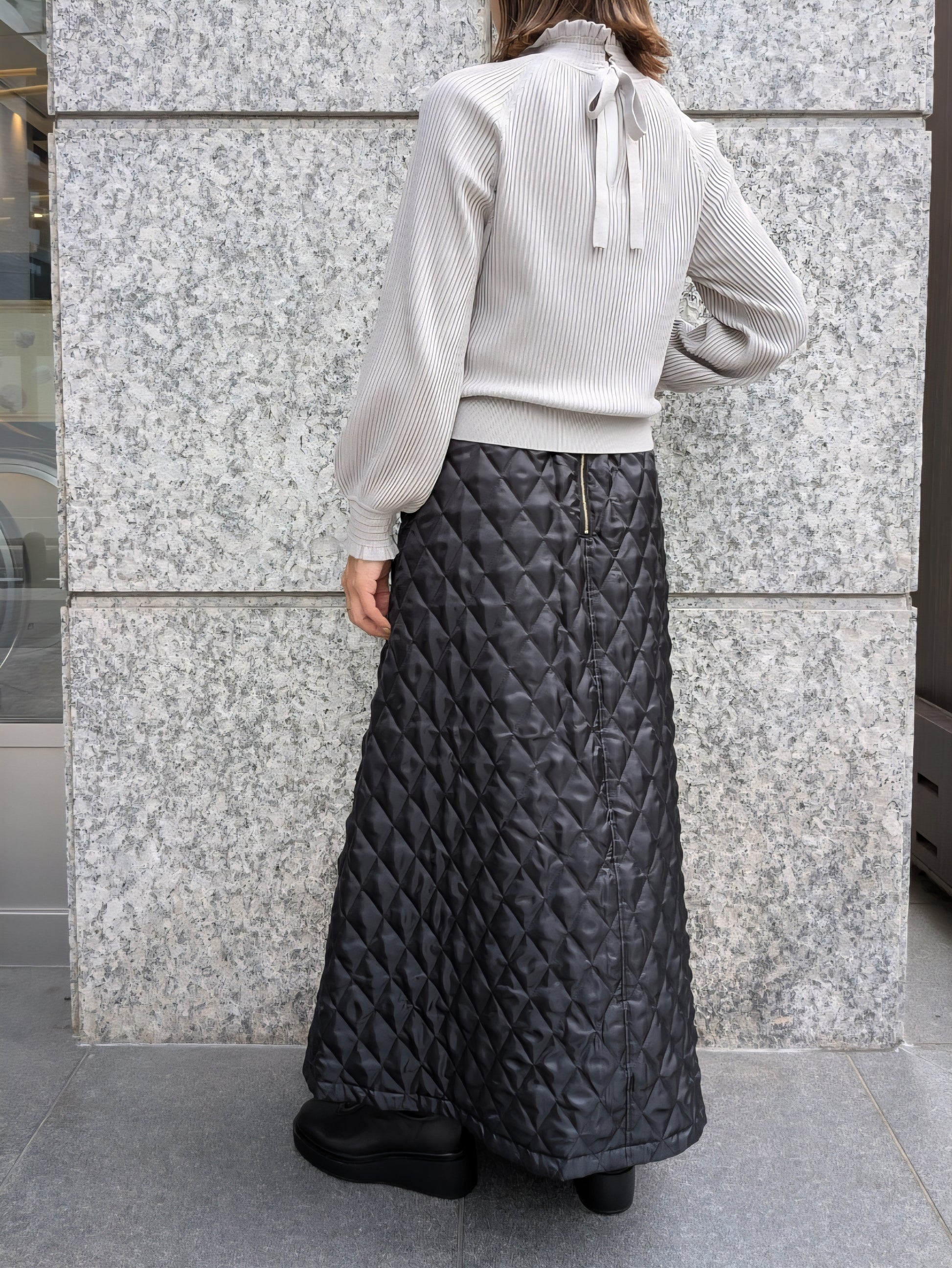 ネックや袖口に施したシャーリング&フリルがクラシック・モダンなアクセントに♡