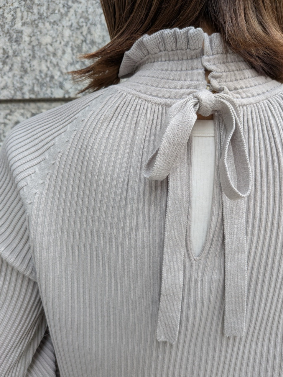 前後2way着用していただけ、後ろでリボンを結んで◎またリボン側を前にしたVあきニット風の抜け感のある着こなしもおすすめです!!