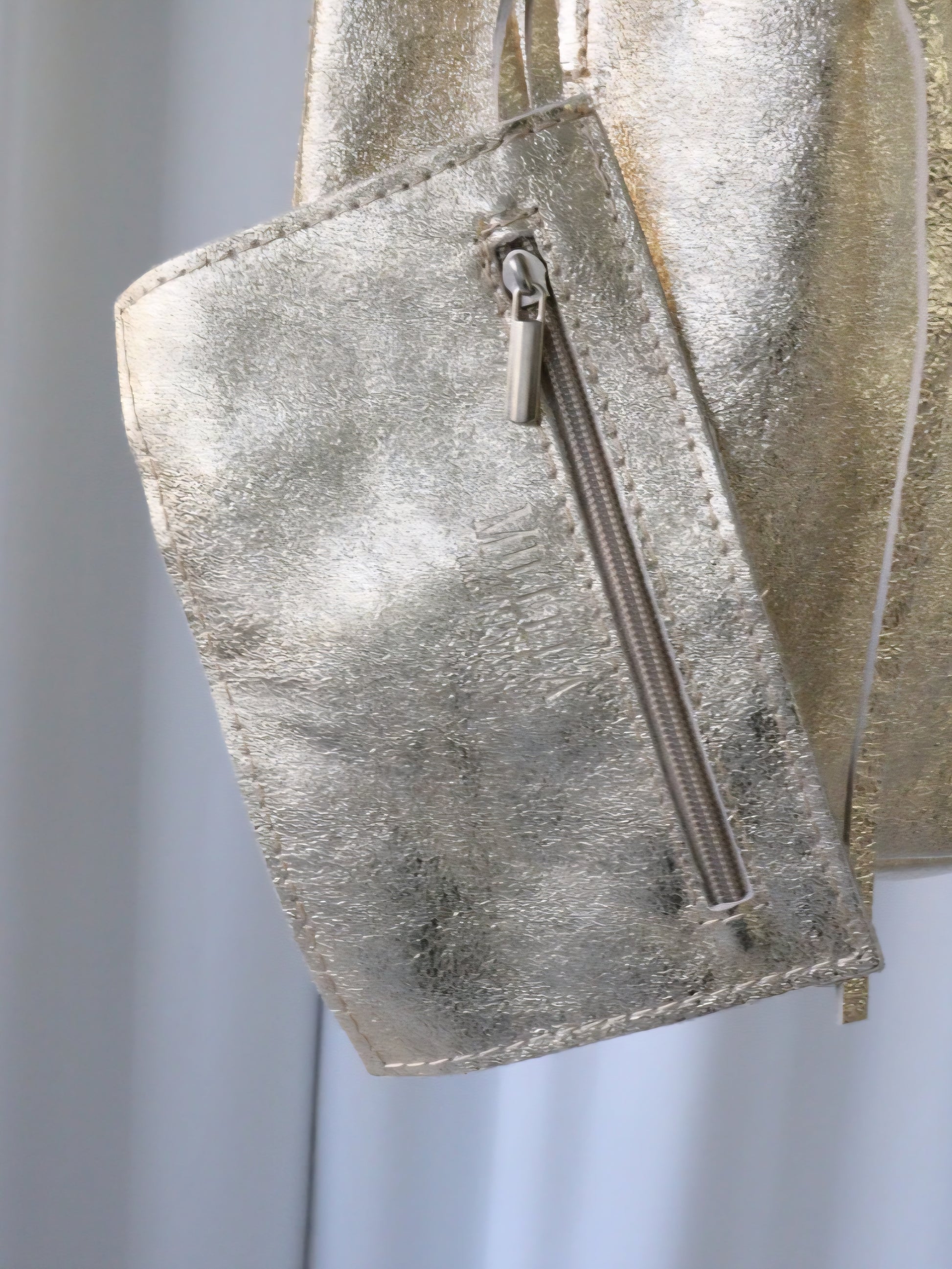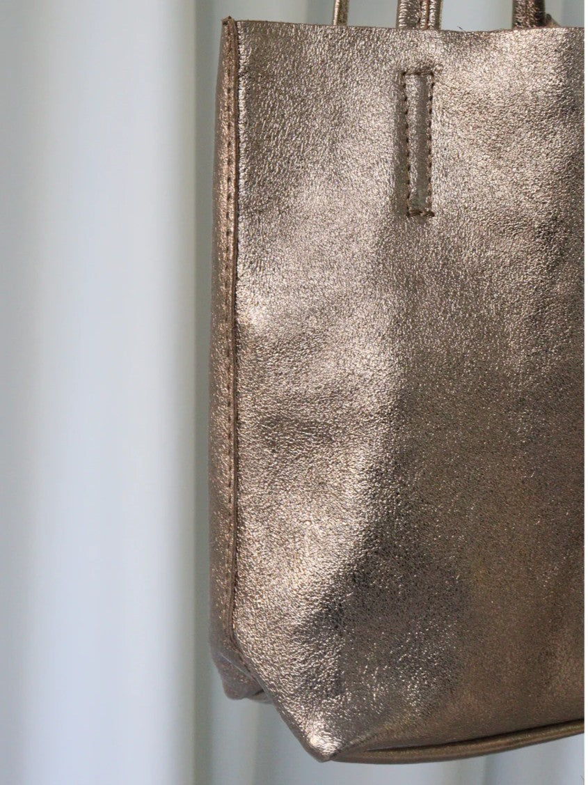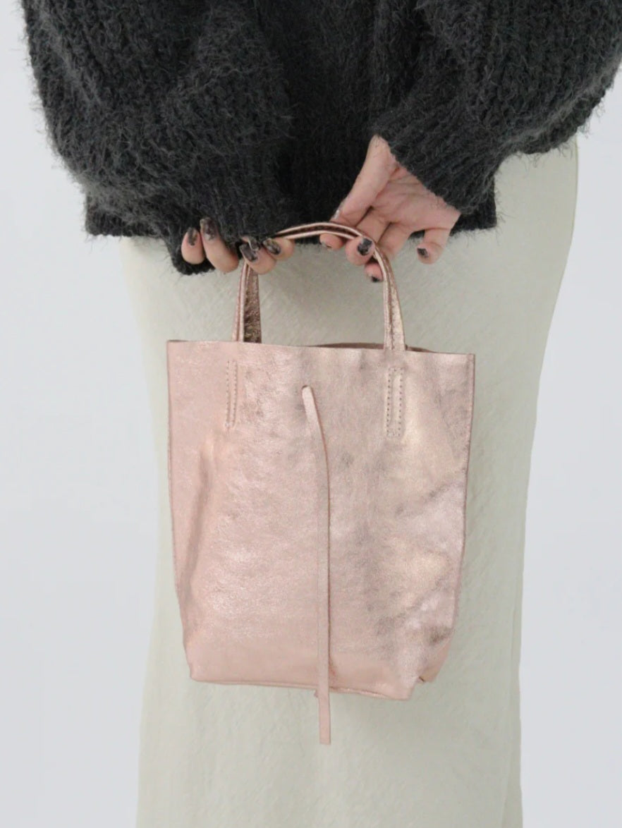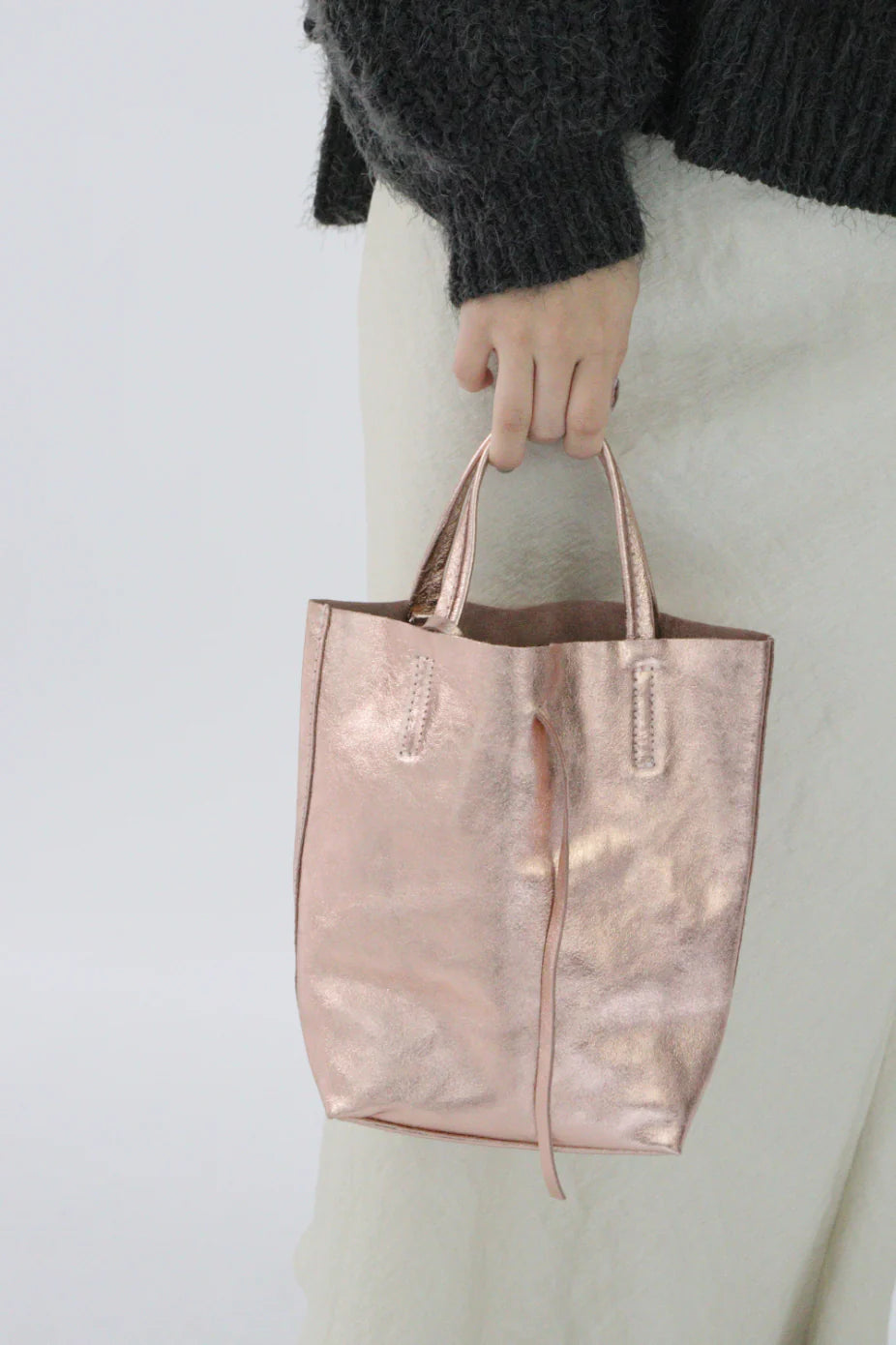 柔らかくリッチな質感のレザーにメタリック加工を施したミニトートバッグ。