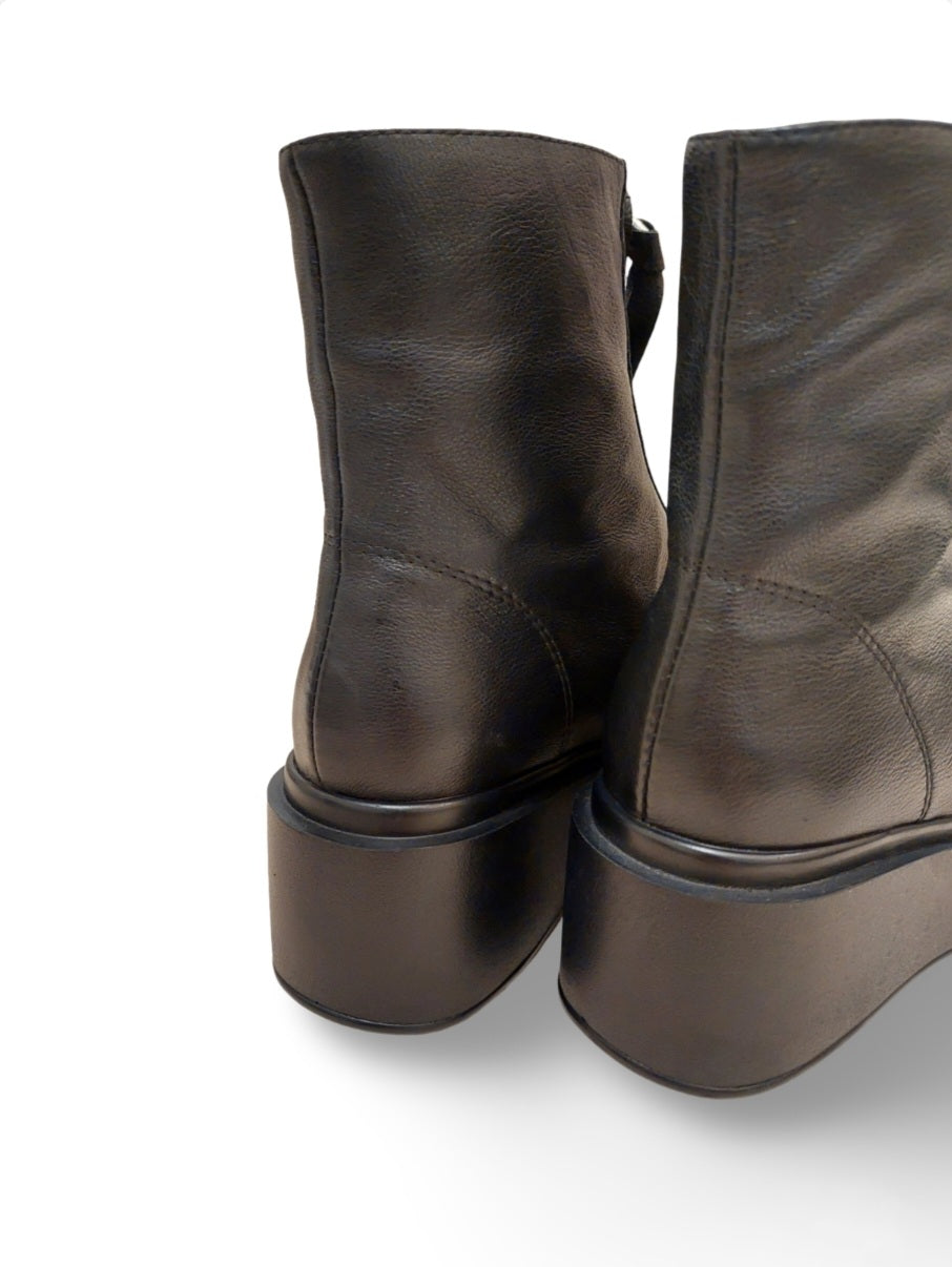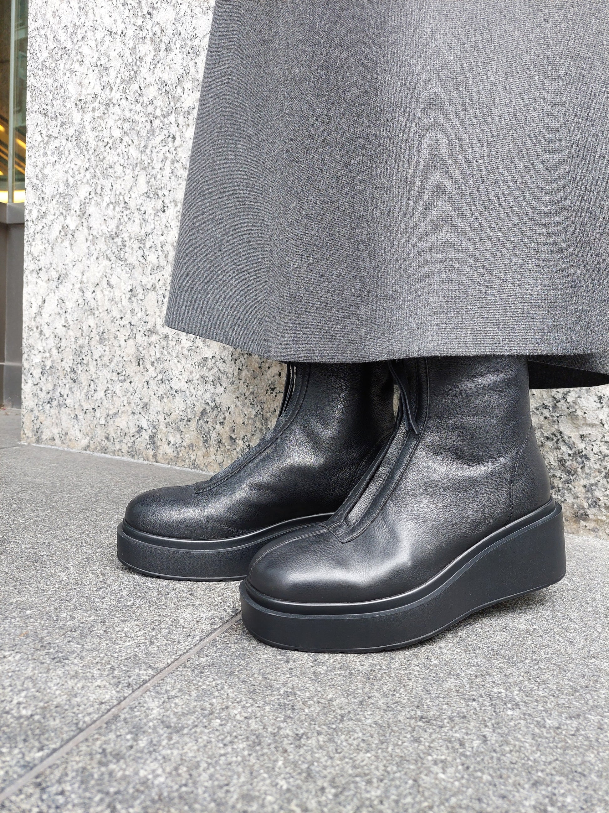 マットな表情の柔らかなレザーのミディアム丈ブーツは