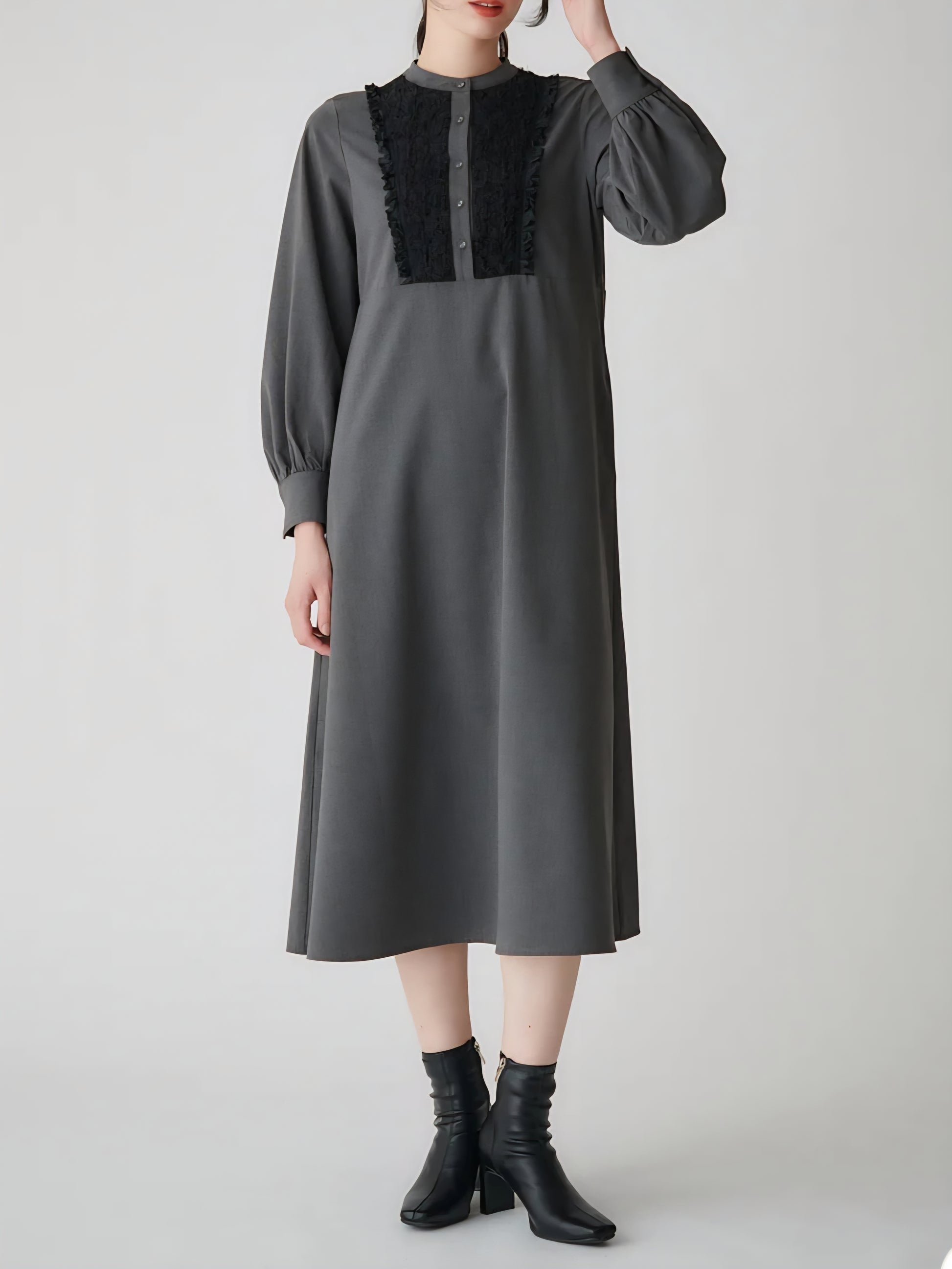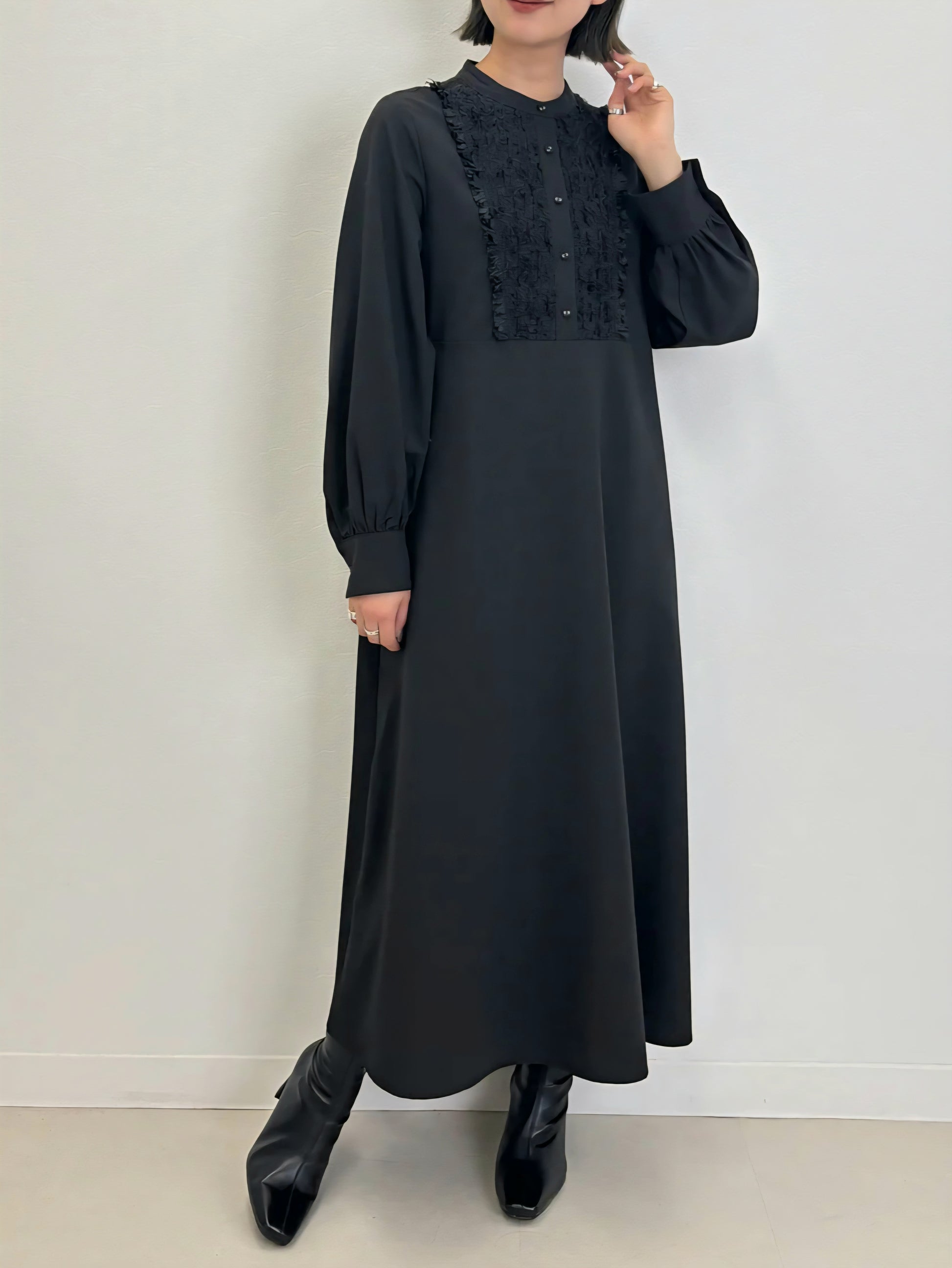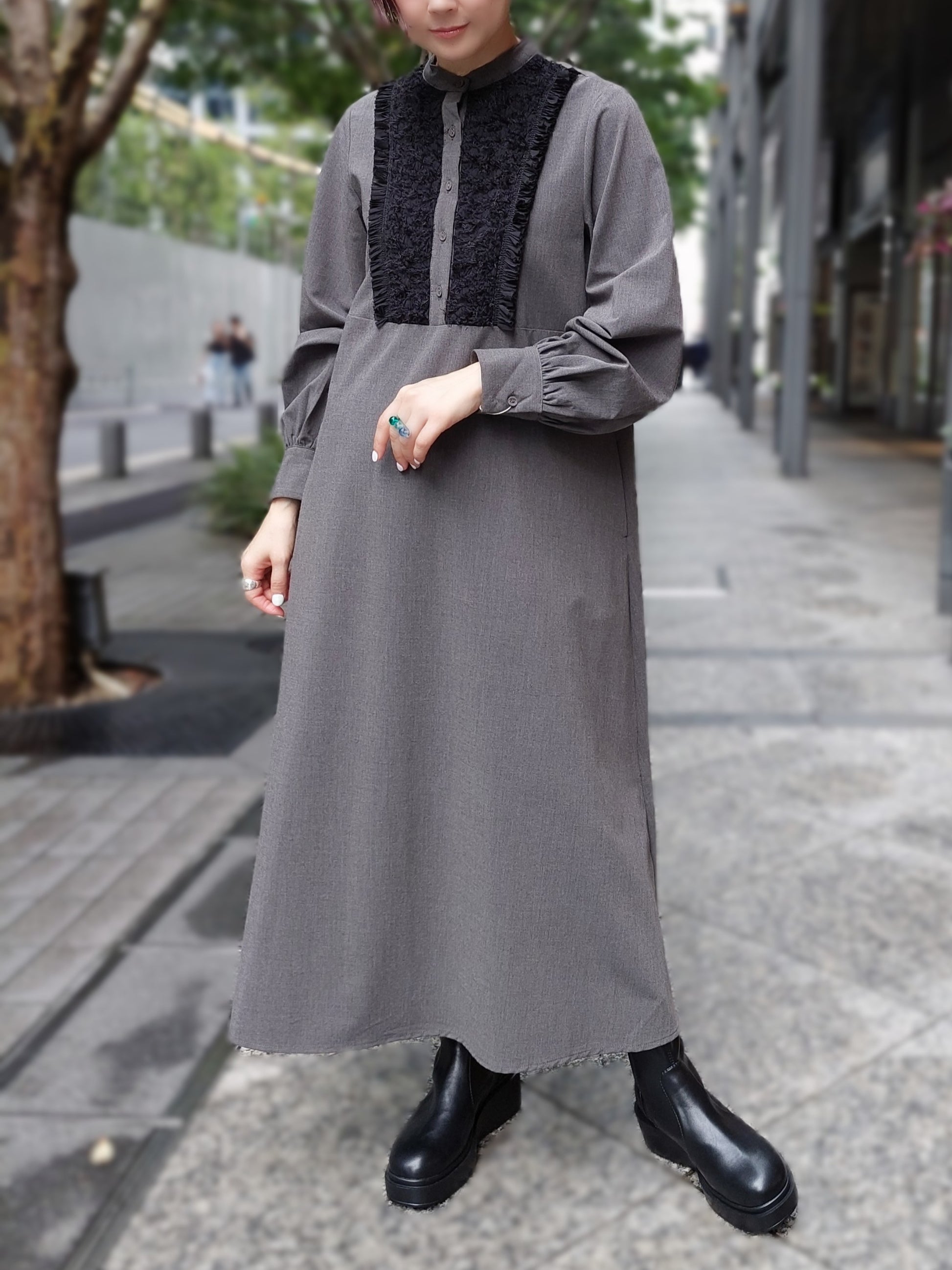 前立てにはクラシカルな雰囲気漂うくるみボタンを使用し、ディテールまでこだわった一枚で着映えする主役級ワンピースです。