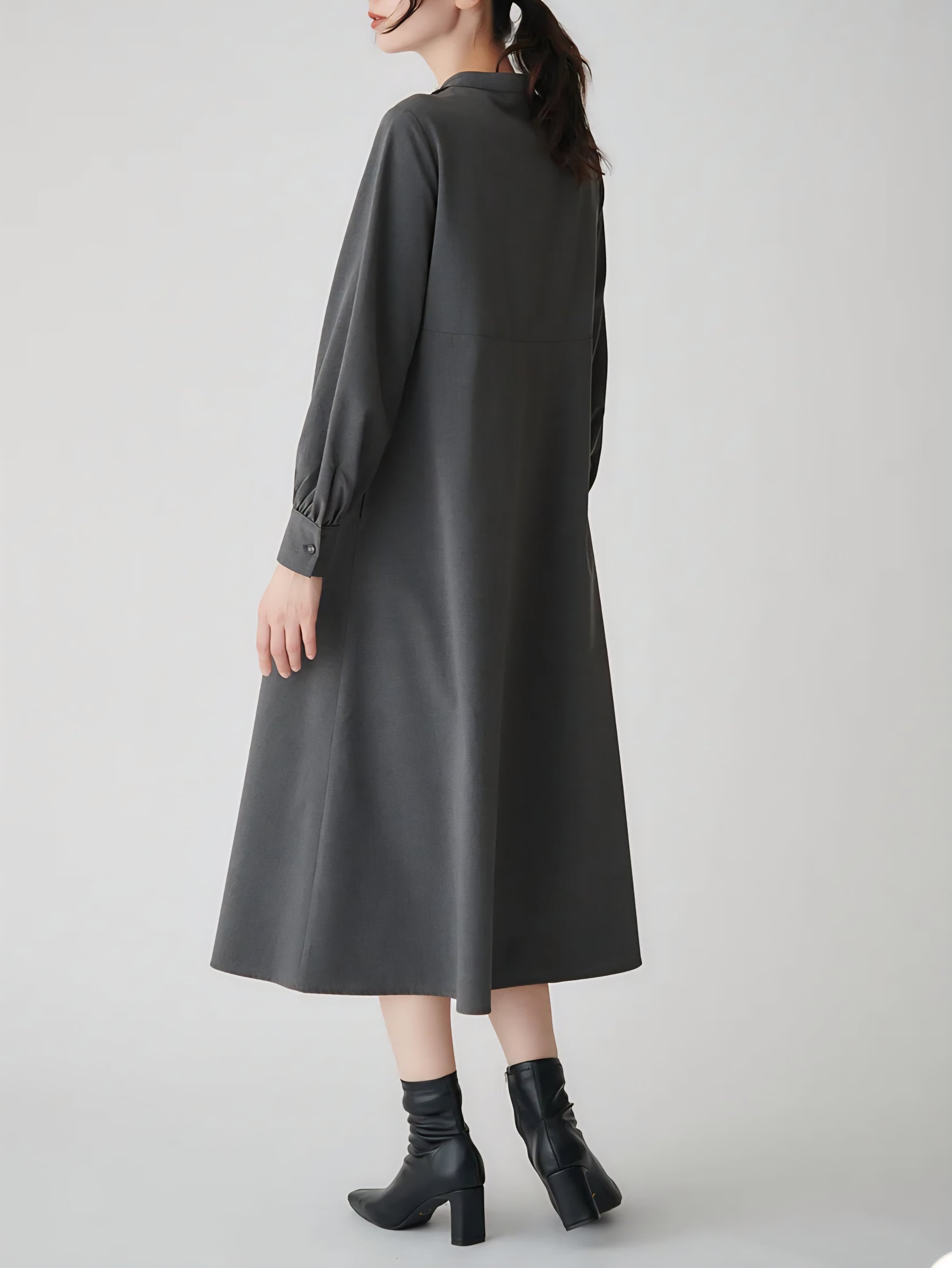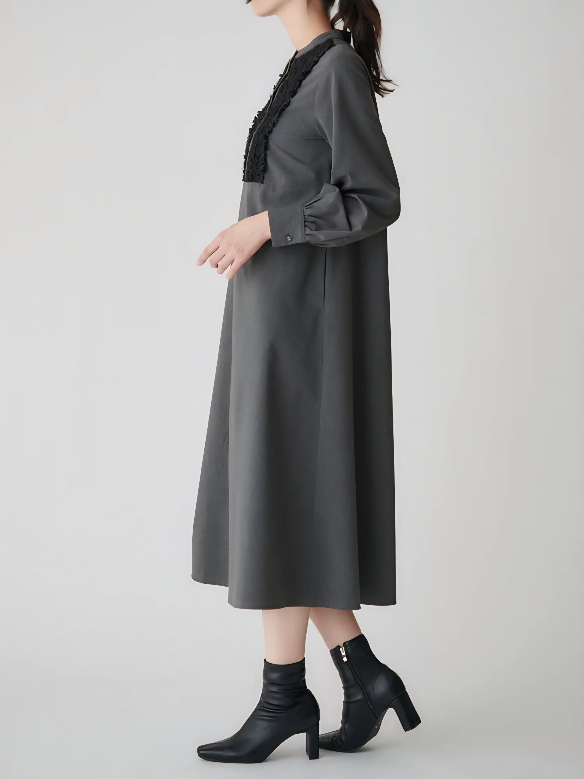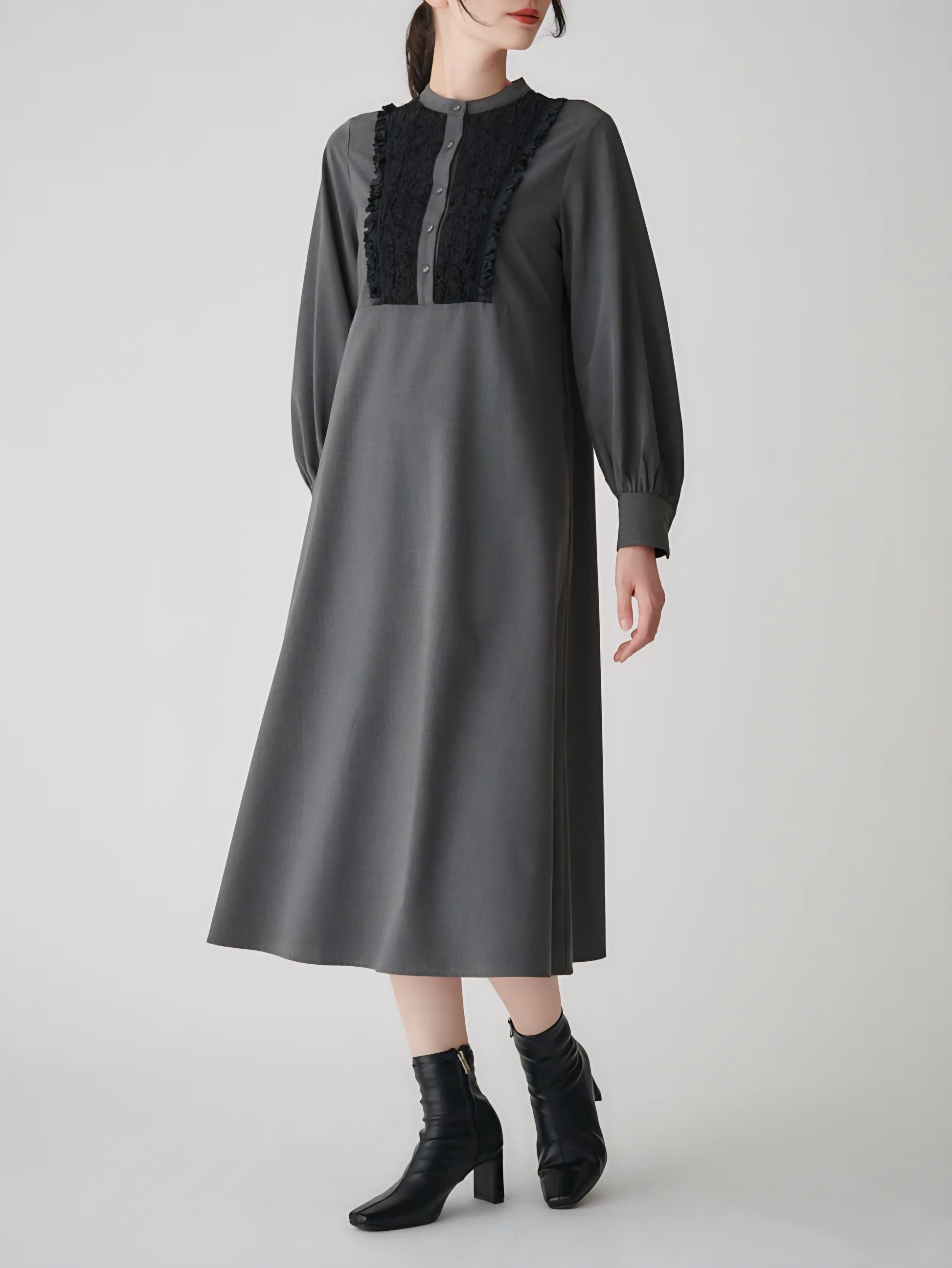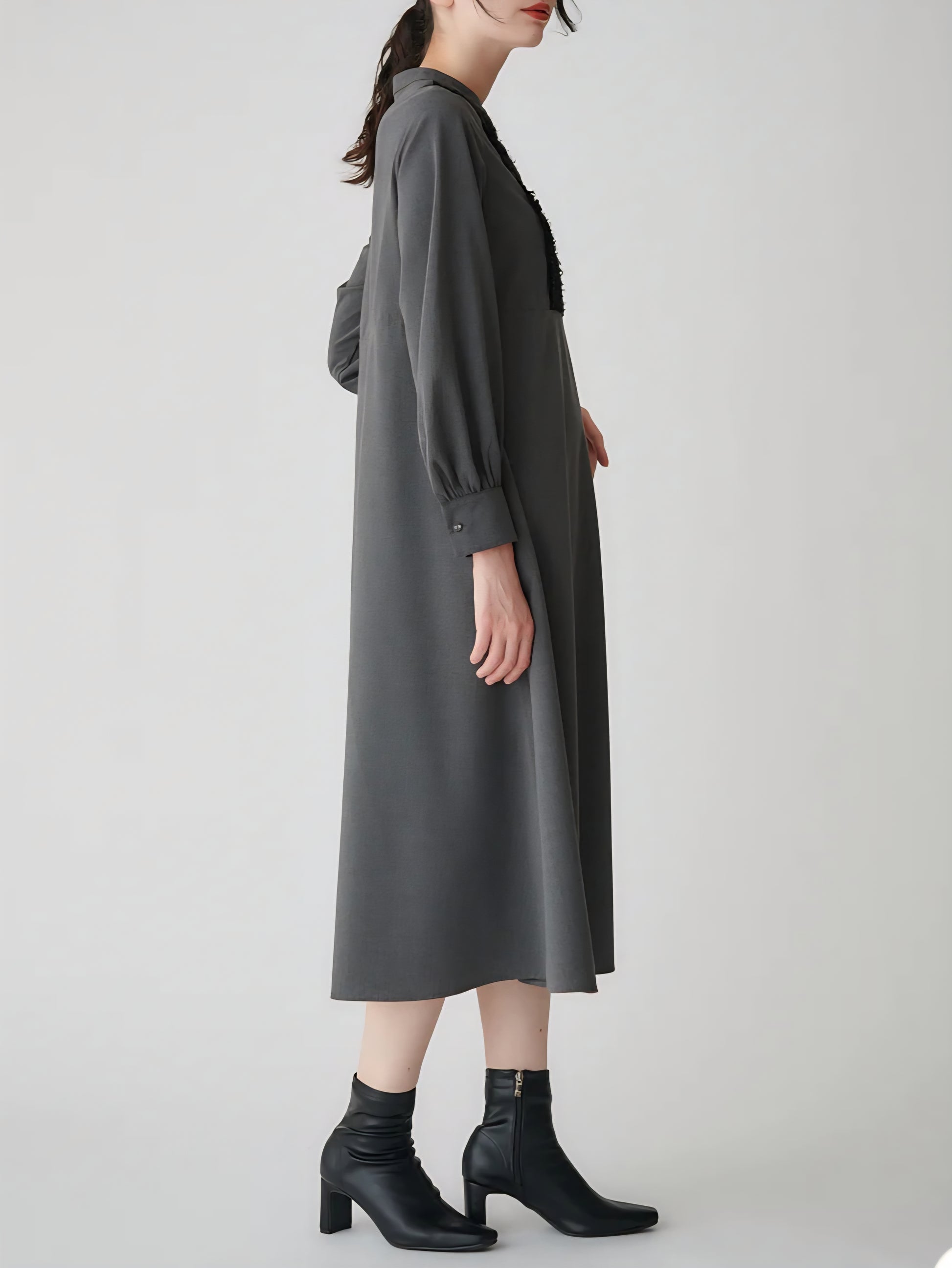 前立てにはクラシカルな雰囲気漂うくるみボタンを使用し、ディテールまでこだわった一枚で着映えする主役級ワンピースです。
