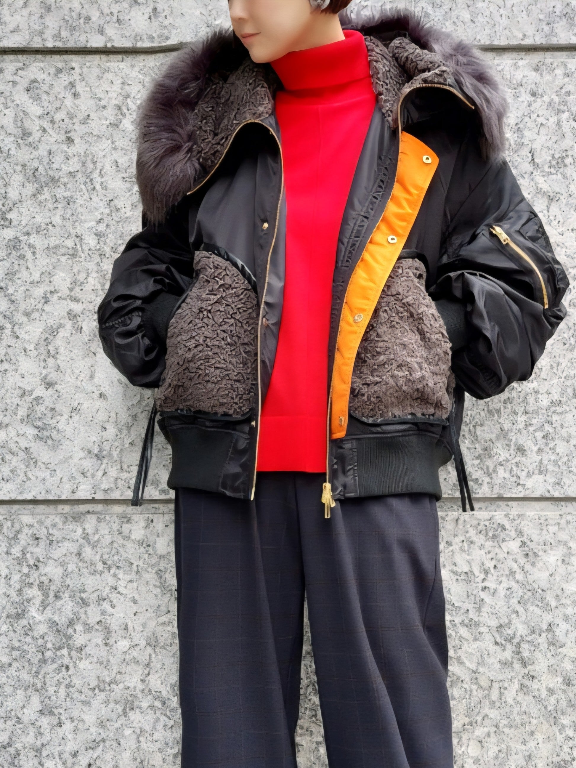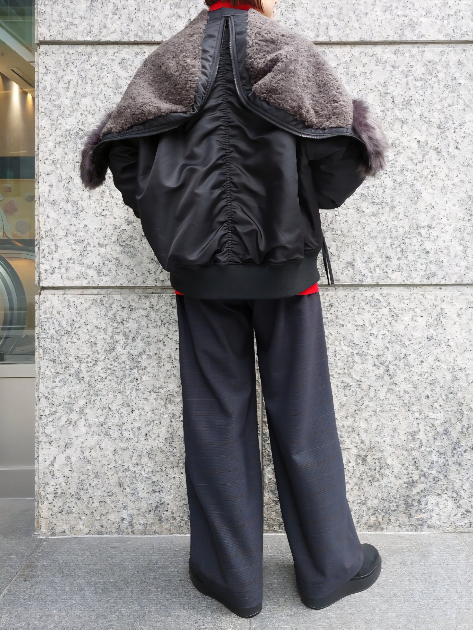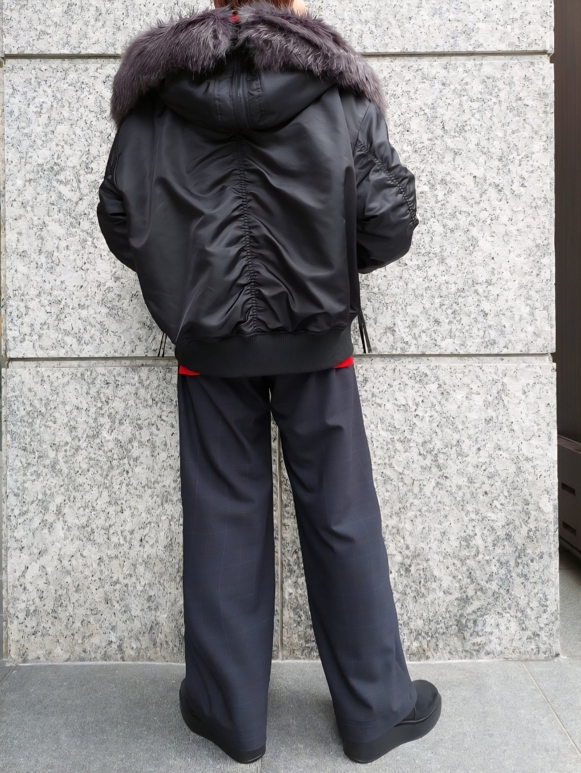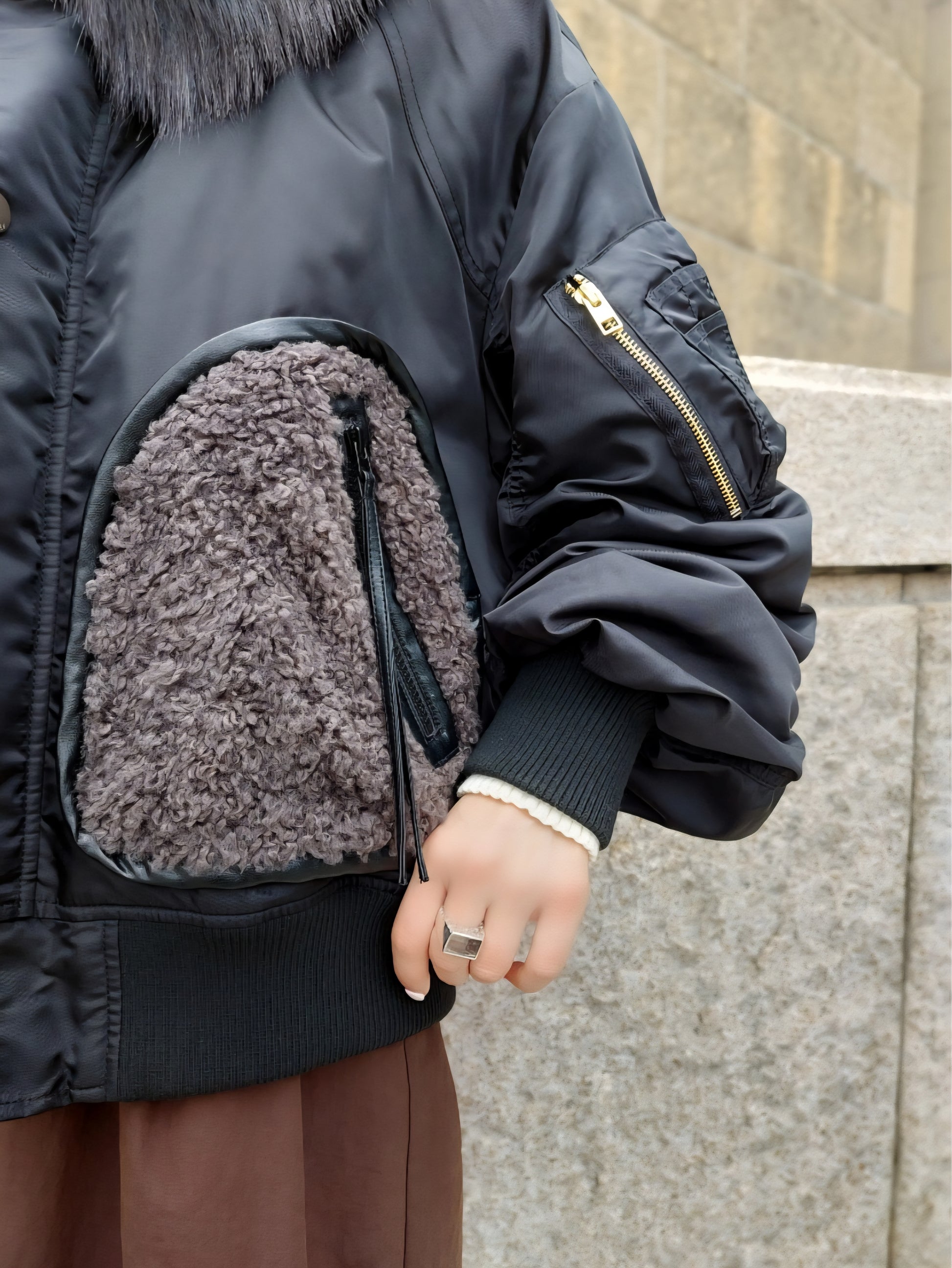 エコファーを贅沢に異素材使いしたブルゾンはフーディがファスナーで大きさ調節可能!!!
