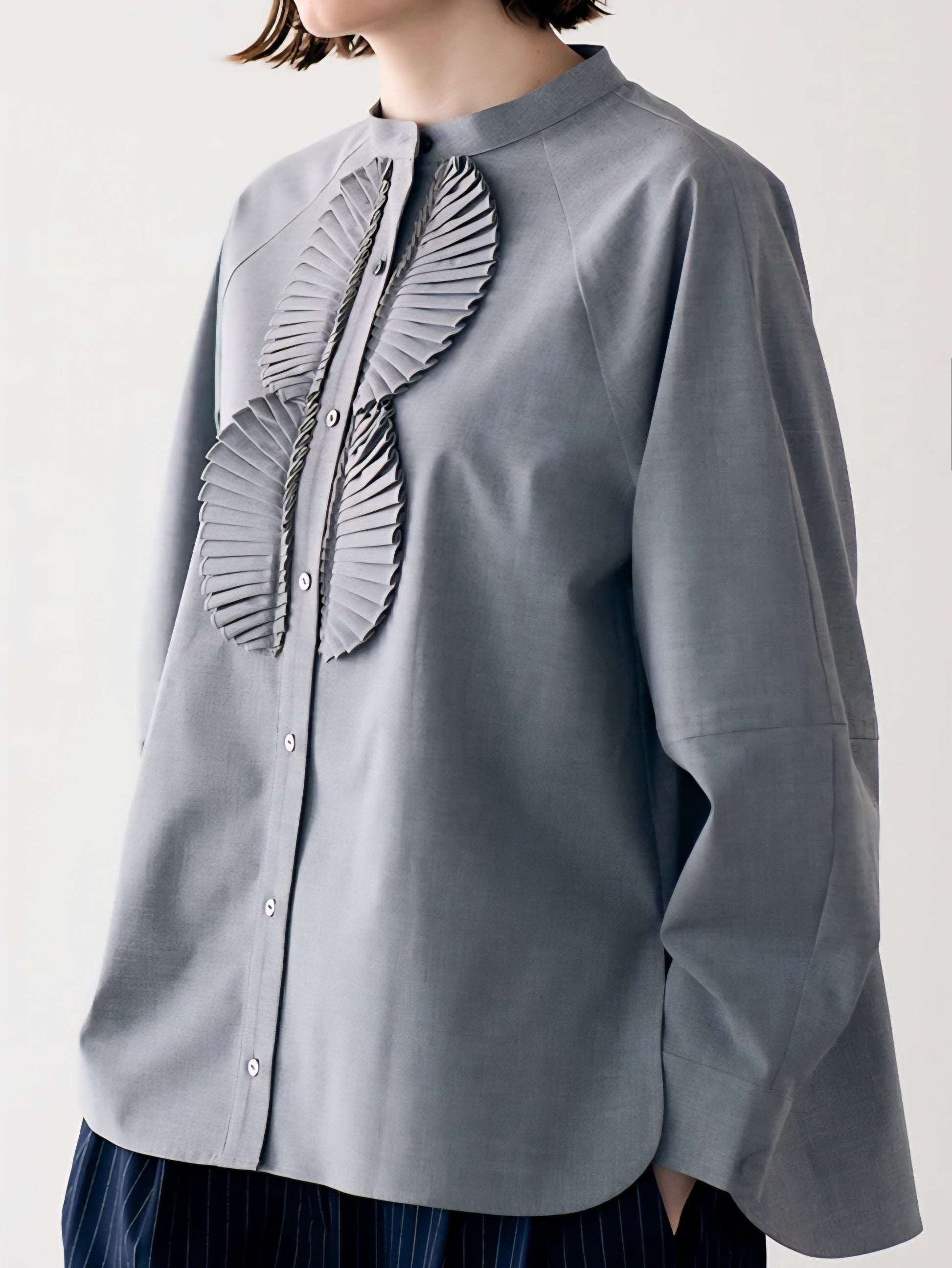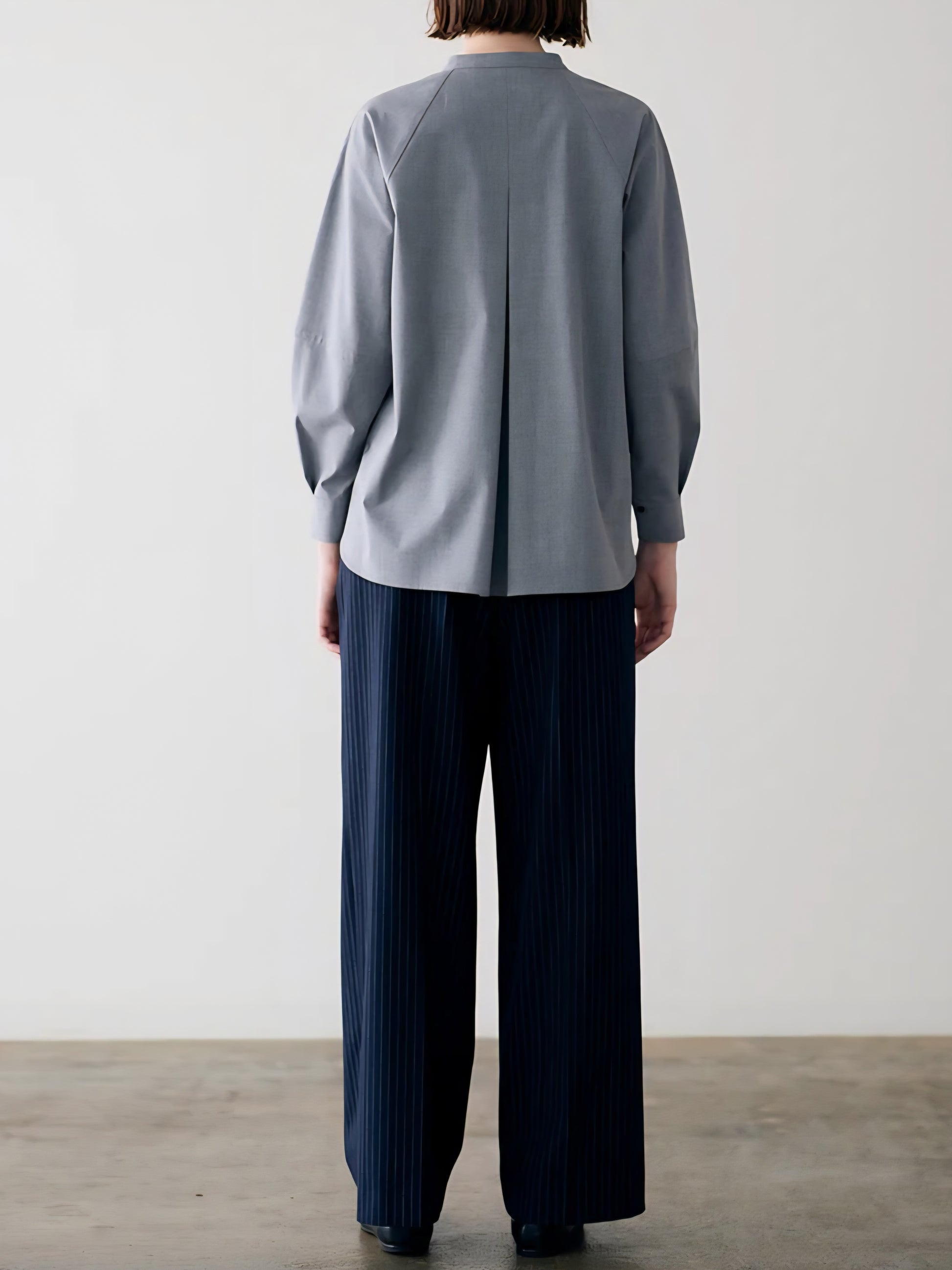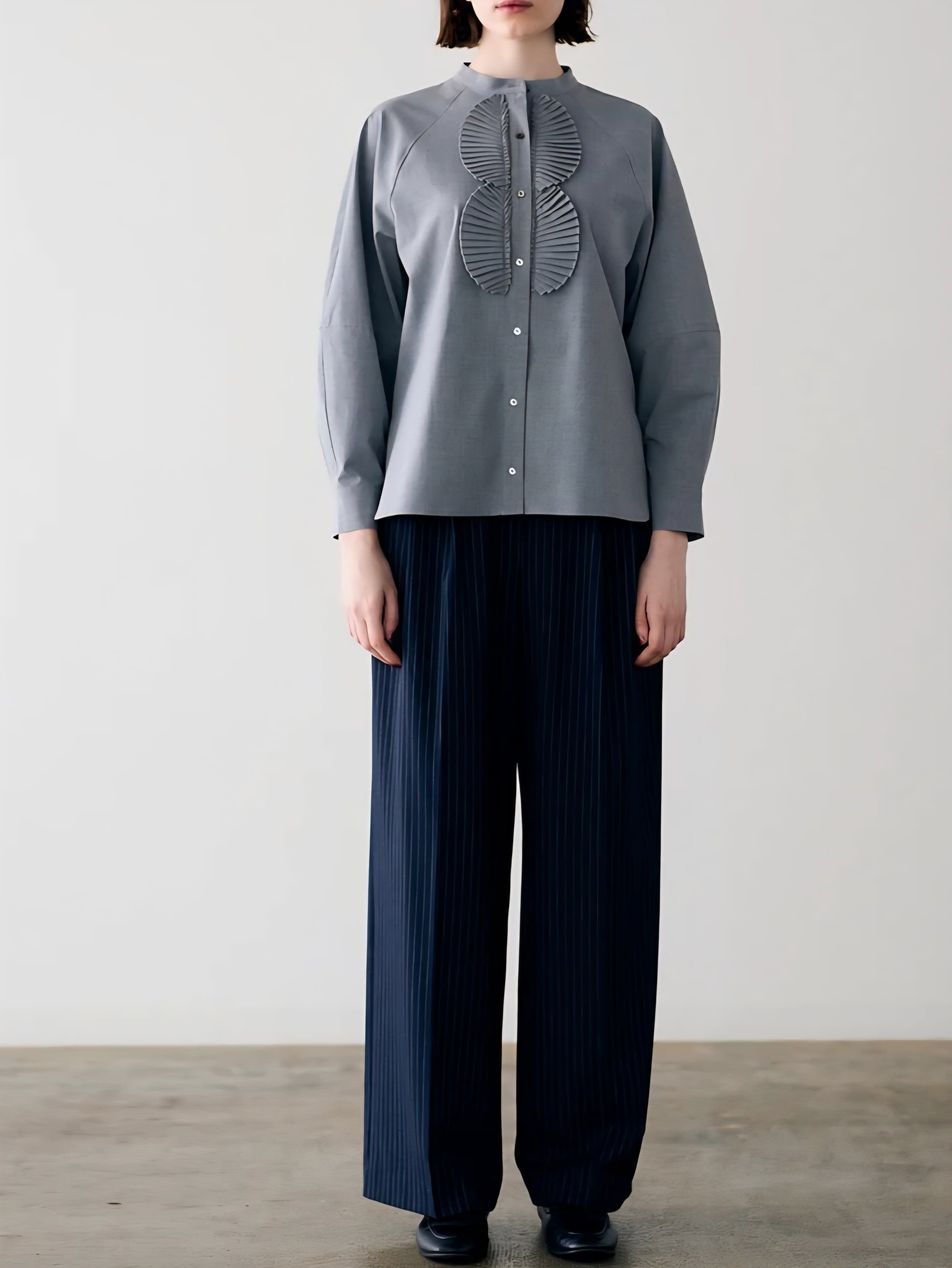 仕立ての美しい繊細なサークルプリーツが目を惹くブラウスは、バンドカラーでネックはスッキリとシンプルに。