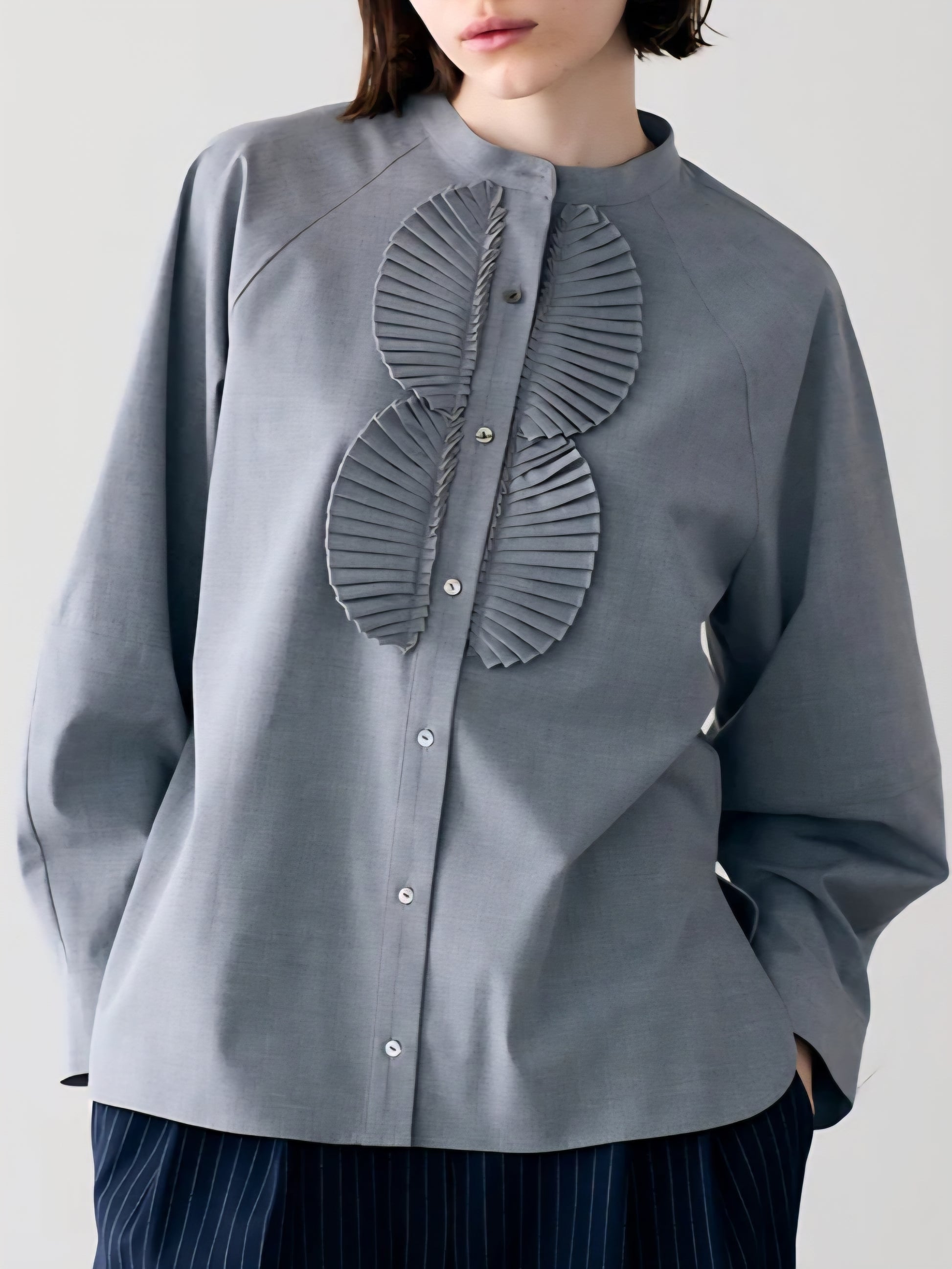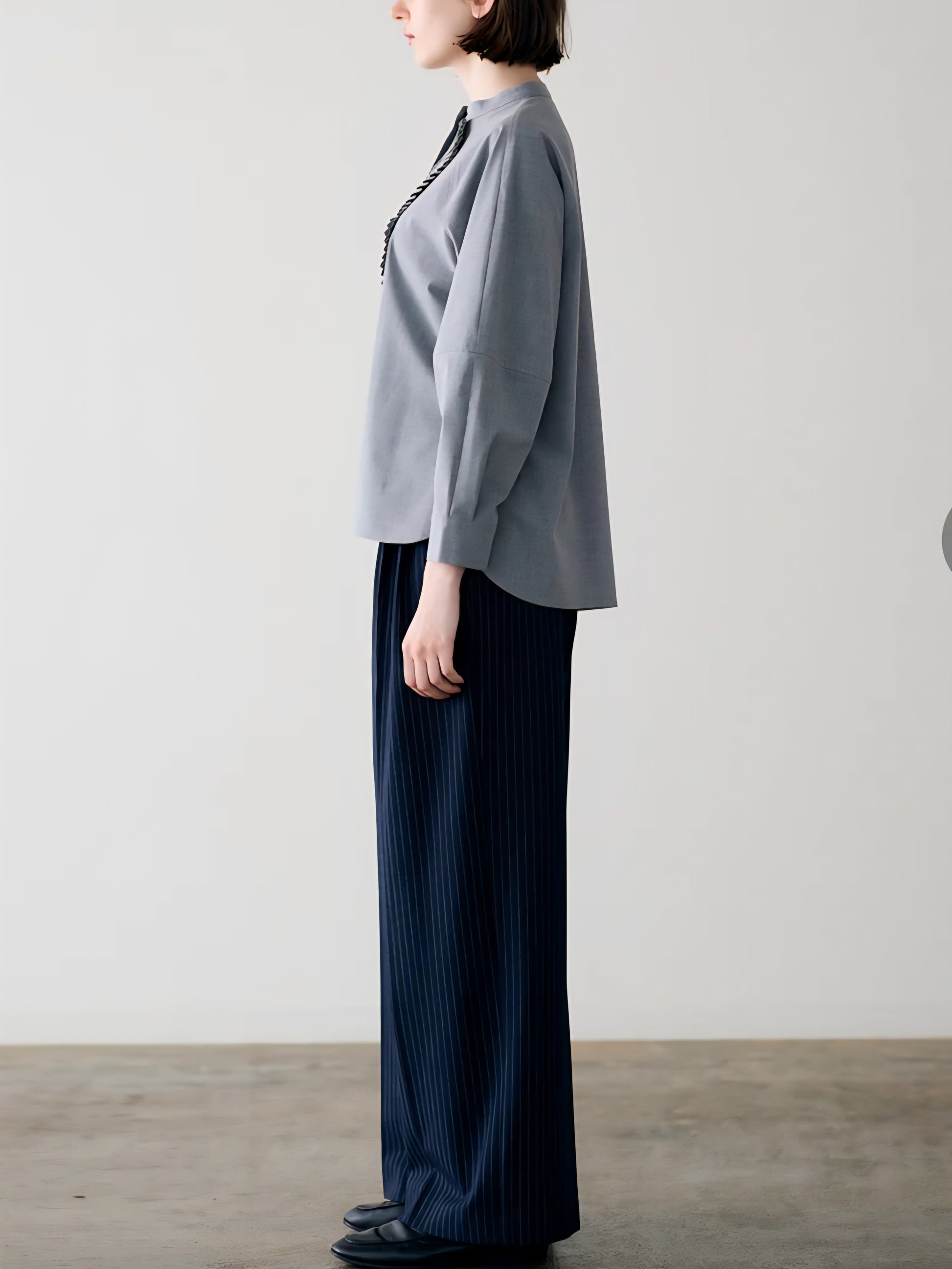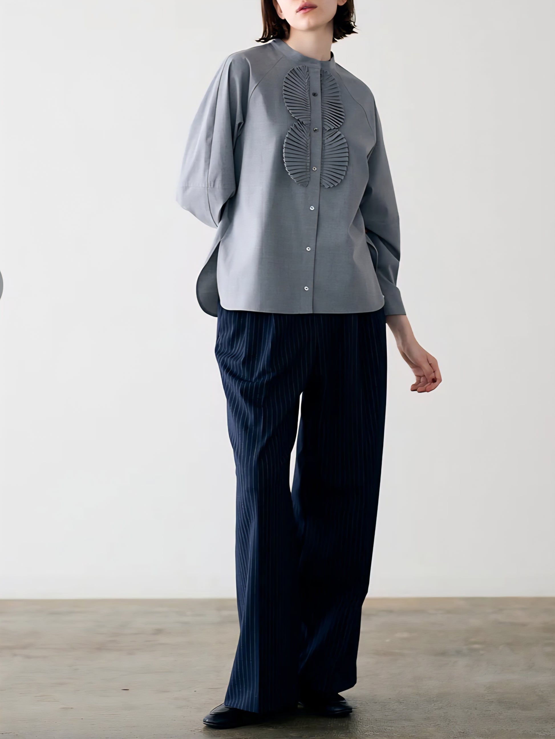 仕立ての美しい繊細なサークルプリーツが目を惹くブラウスは、バンドカラーでネックはスッキリとシンプルに。