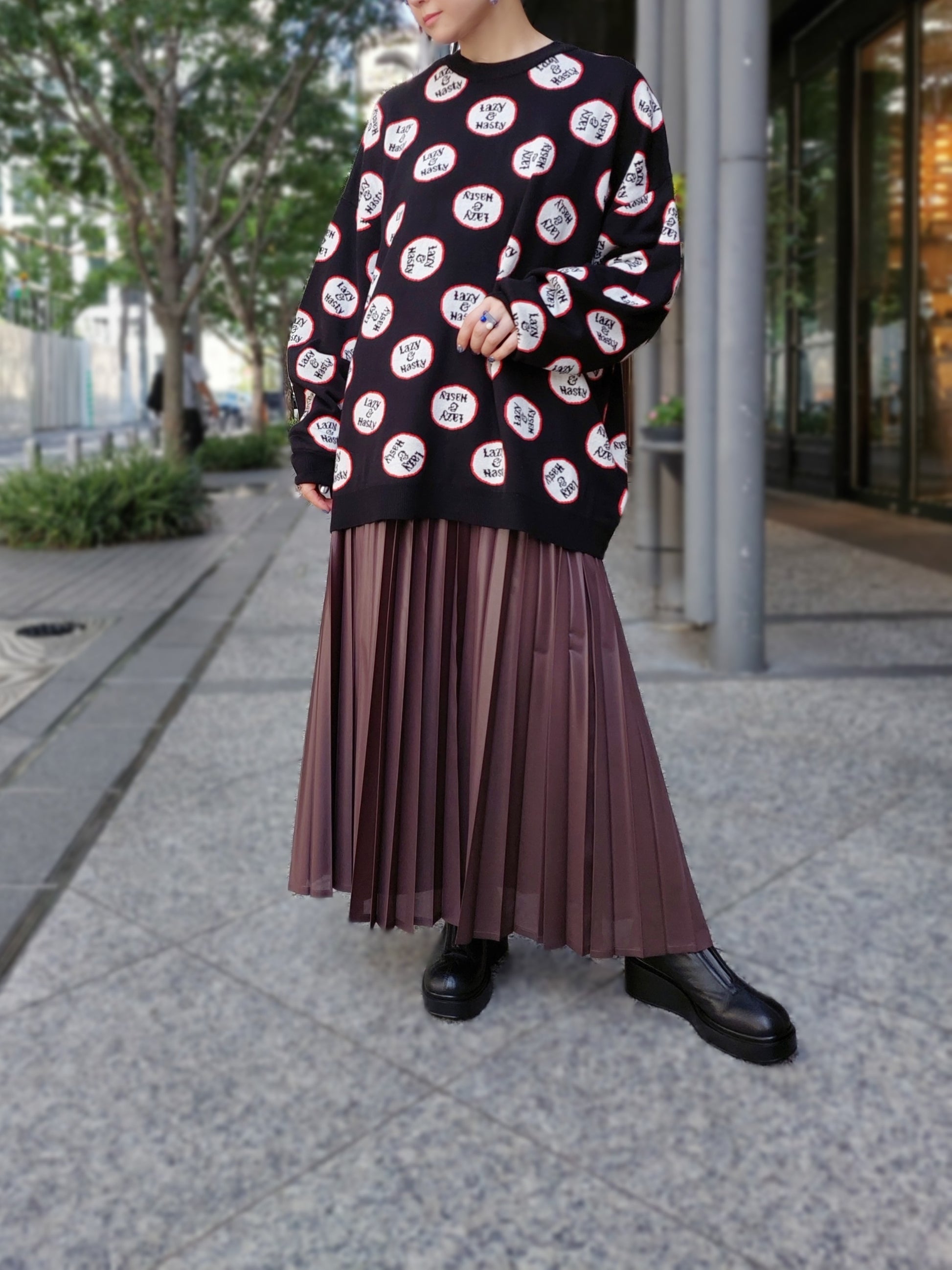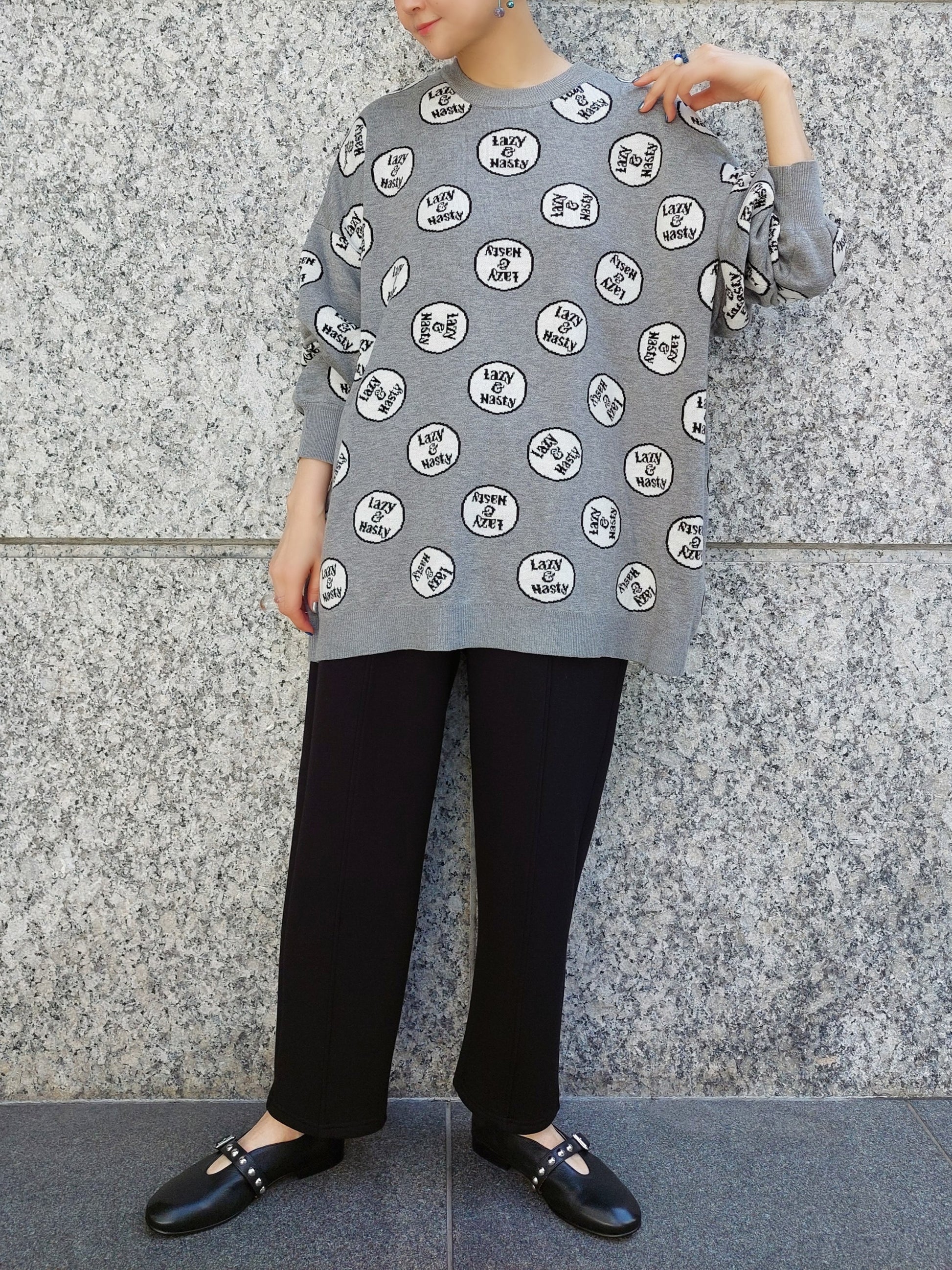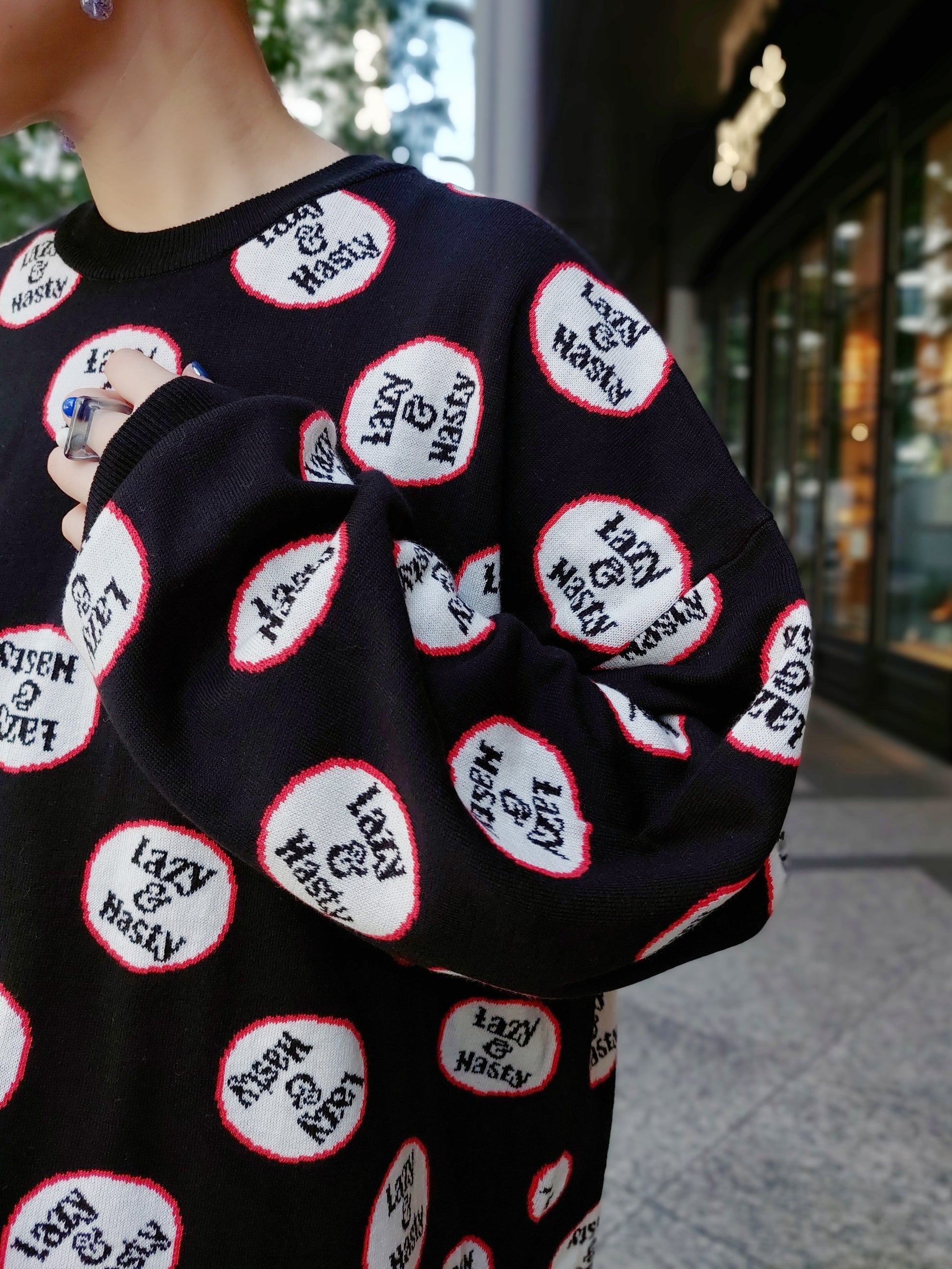 今季のテーマをロゴ総柄に配したプルオーバーのニットは