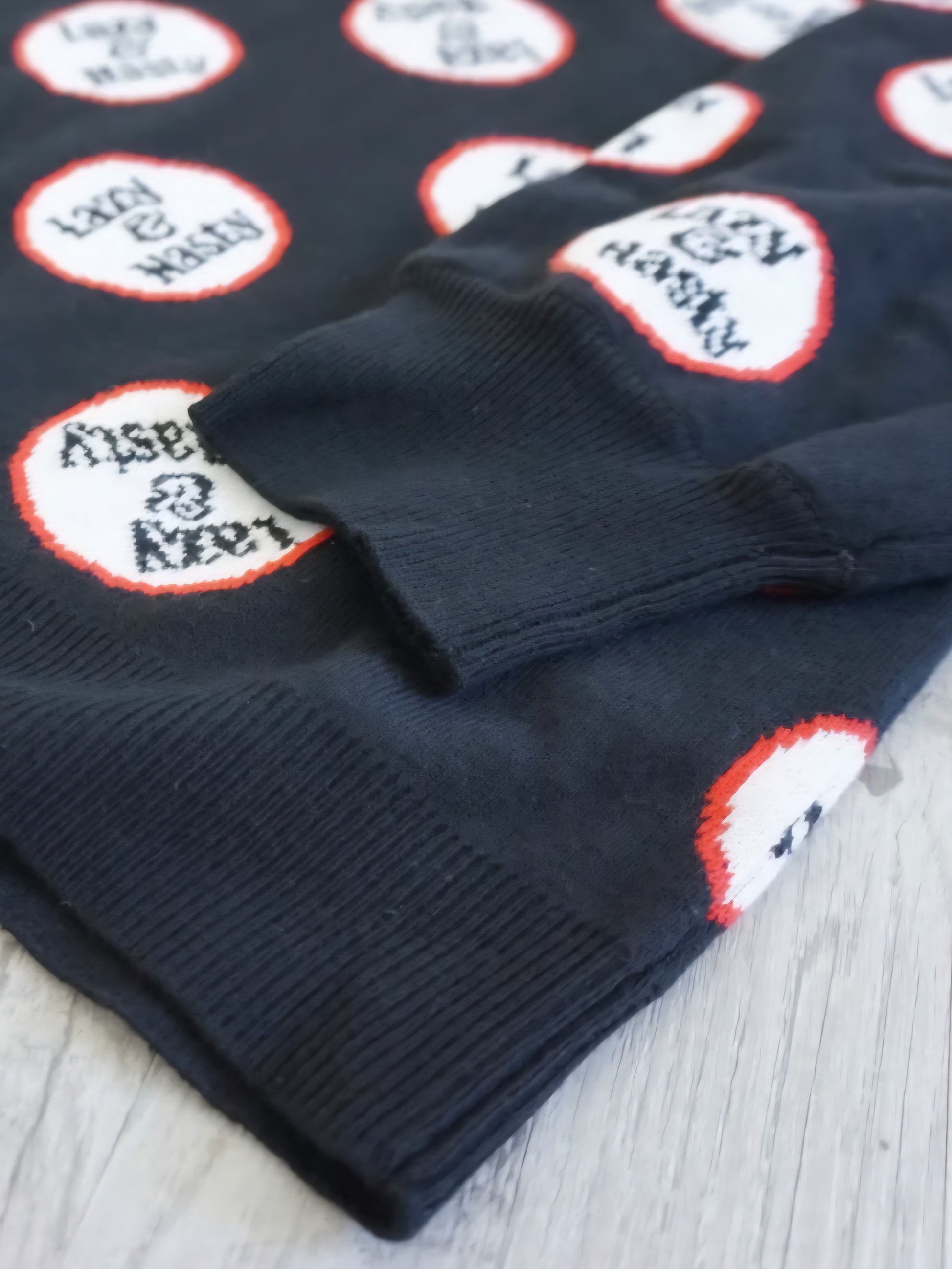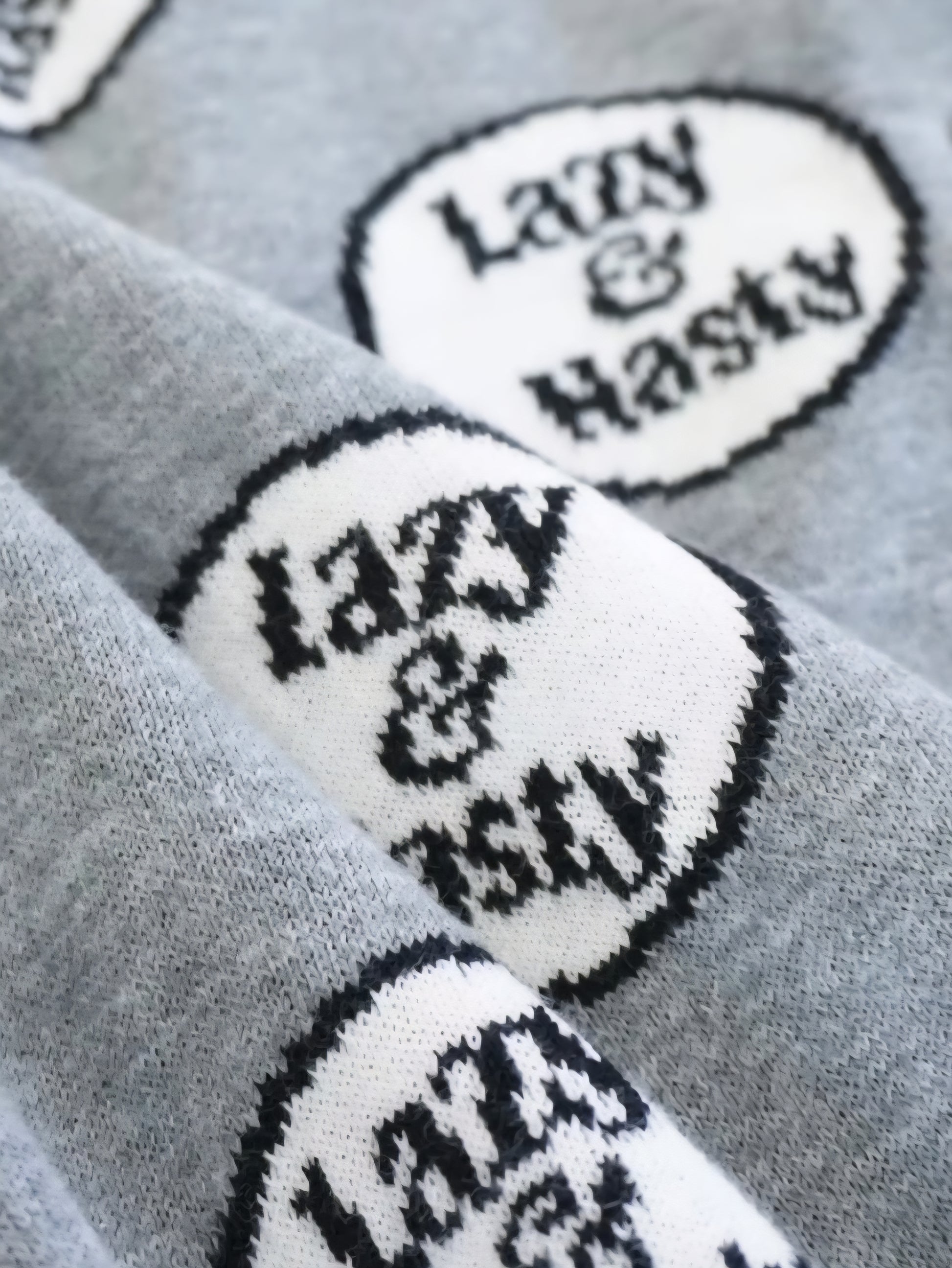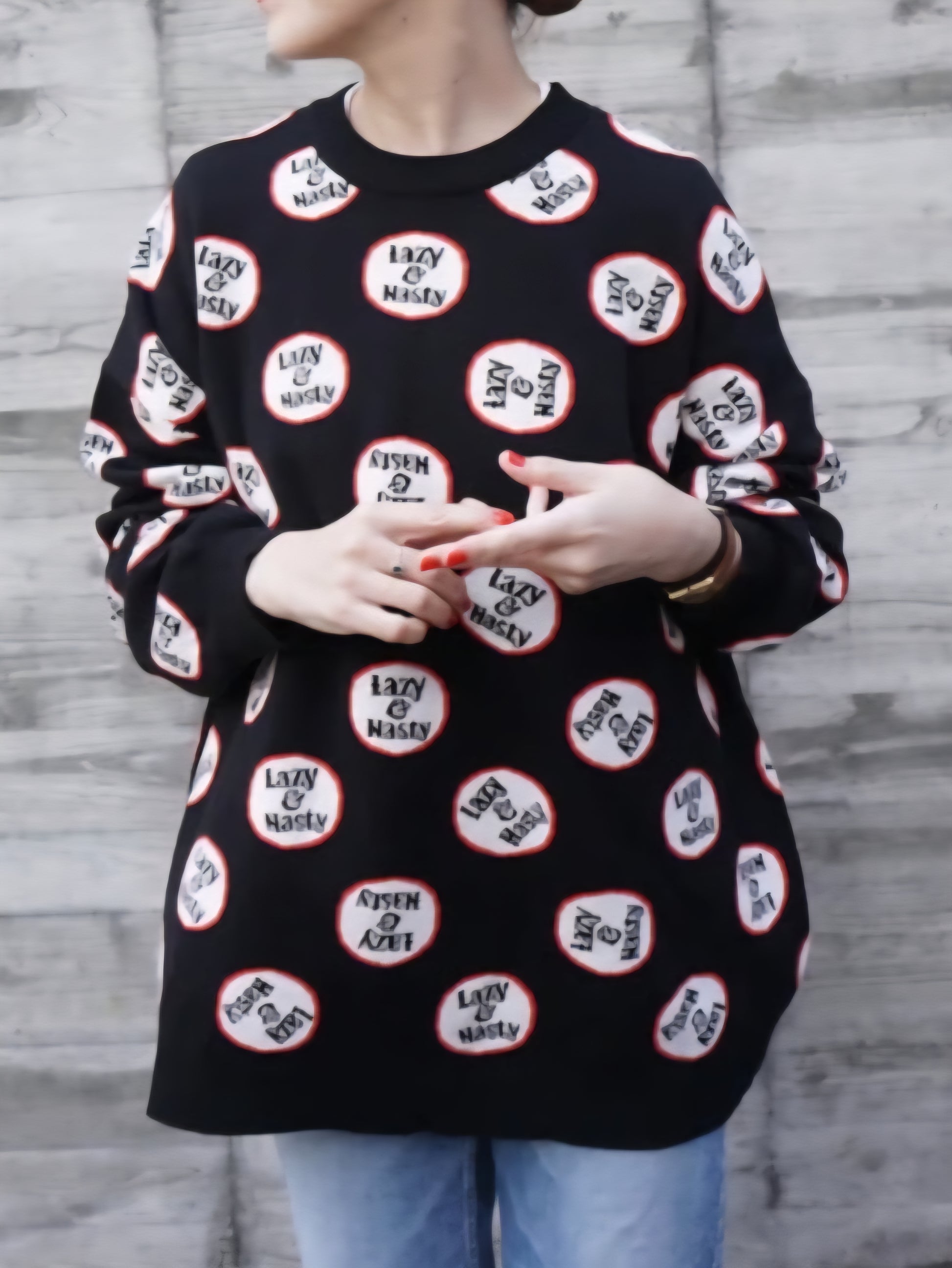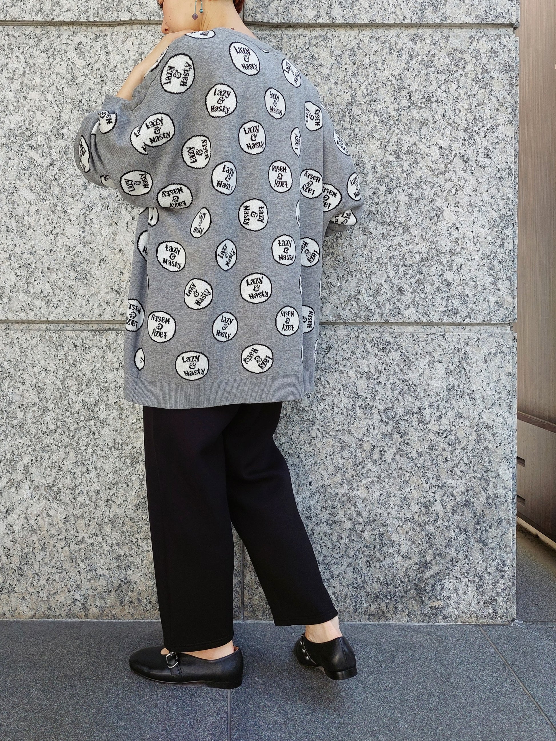 今季のテーマをロゴ総柄に配したプルオーバーのニットは