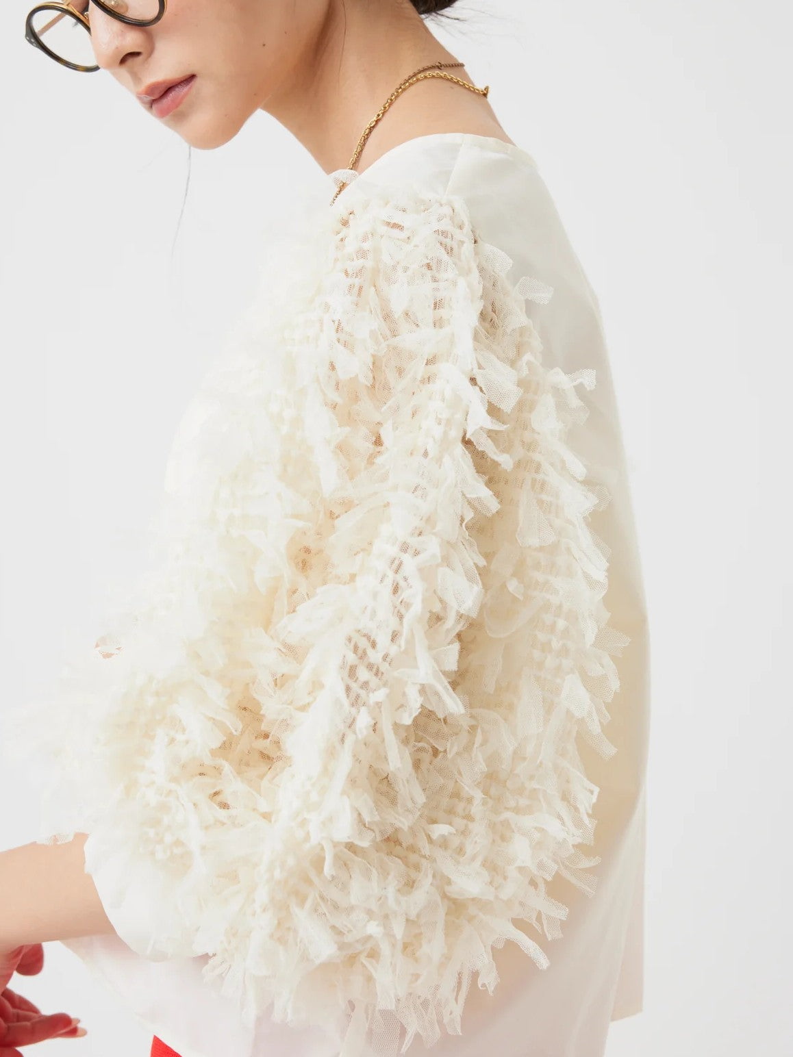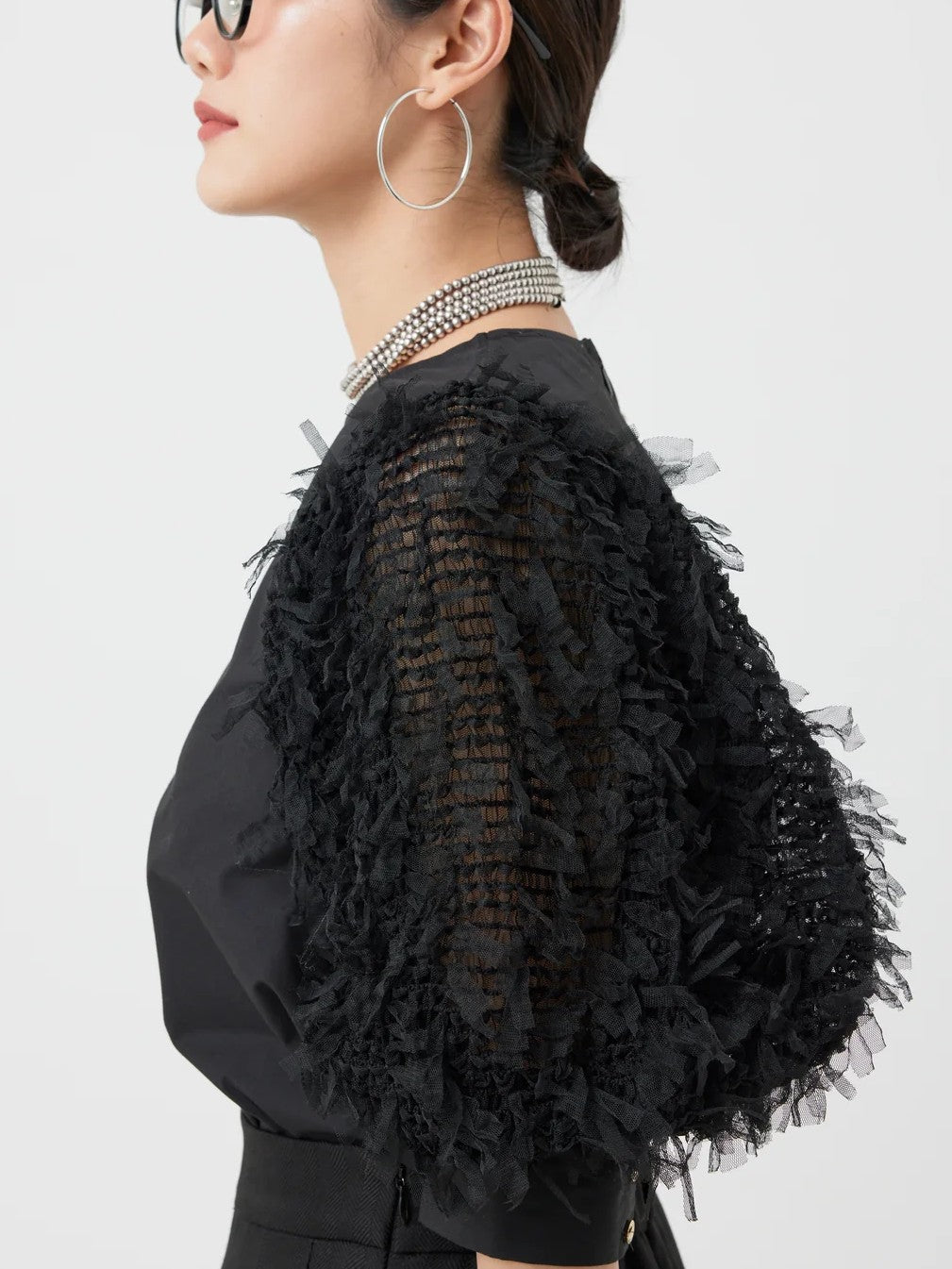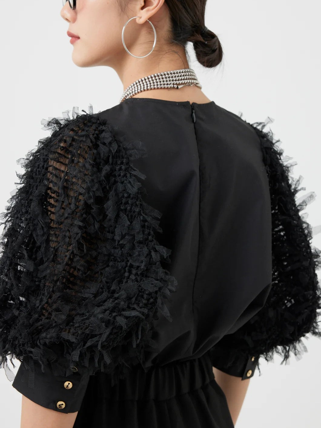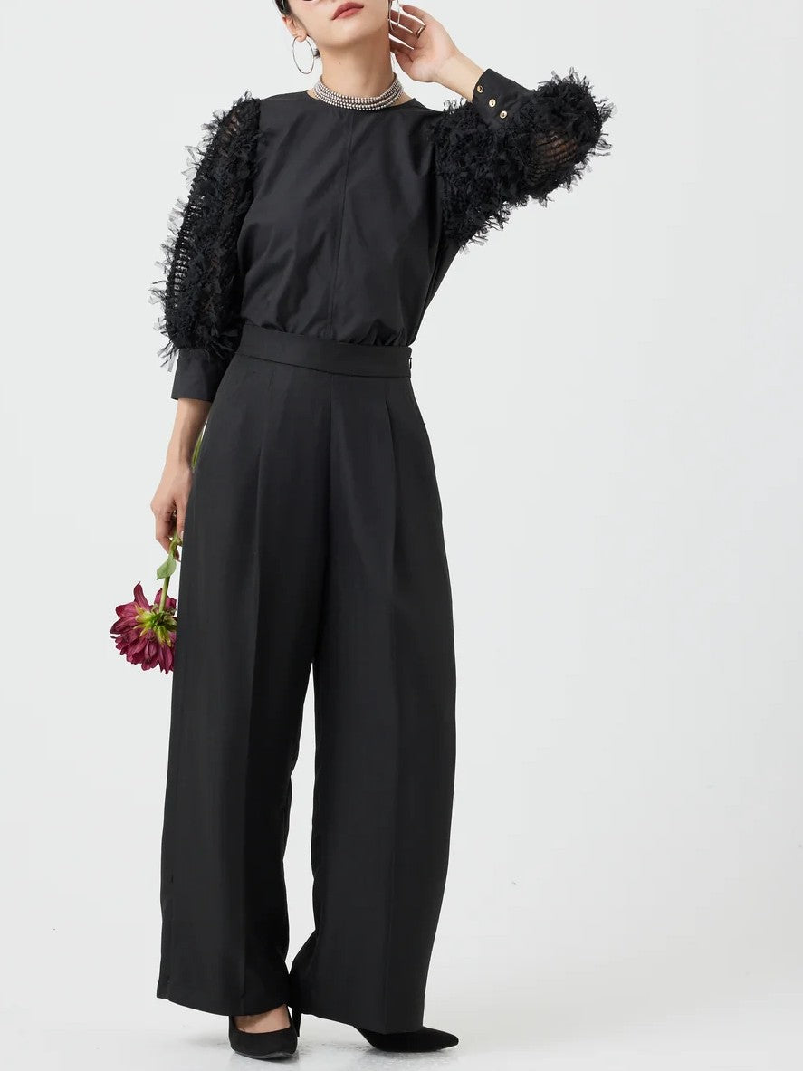 袖にチュールがフリンジの様に編み込まれたファンシー生地を使用し、1枚でパッと華やかなブラウス。