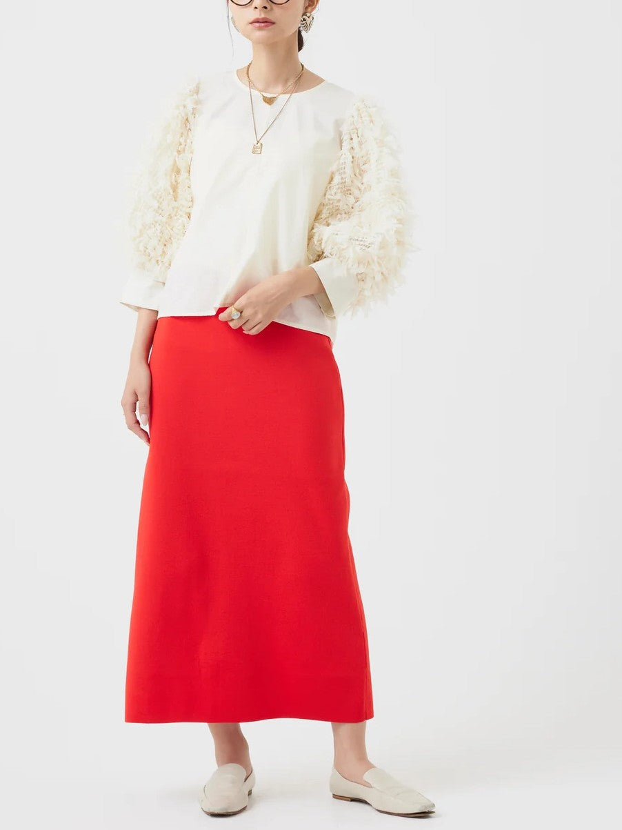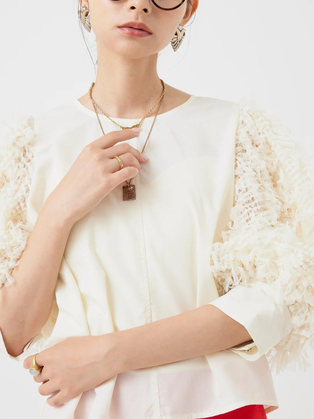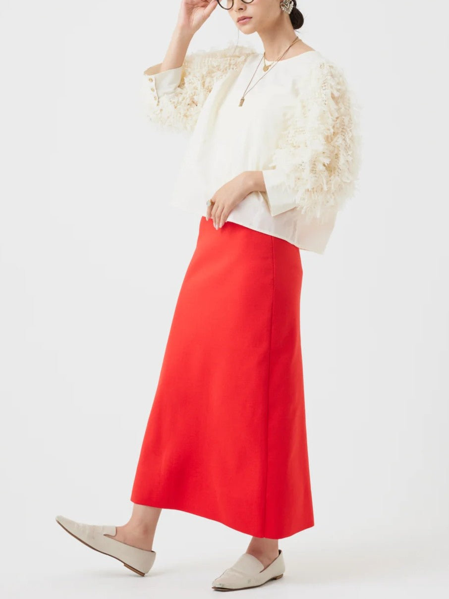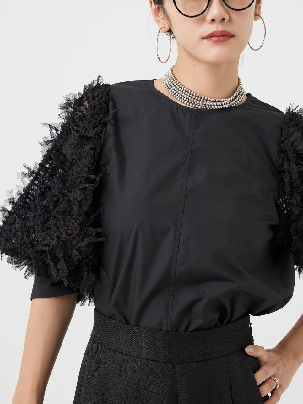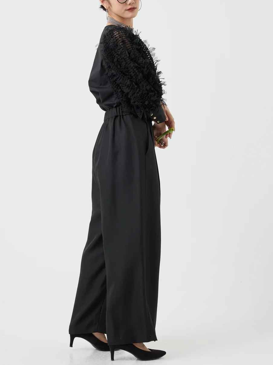 袖にチュールがフリンジの様に編み込まれたファンシー生地を使用し、1枚でパッと華やかなブラウス。