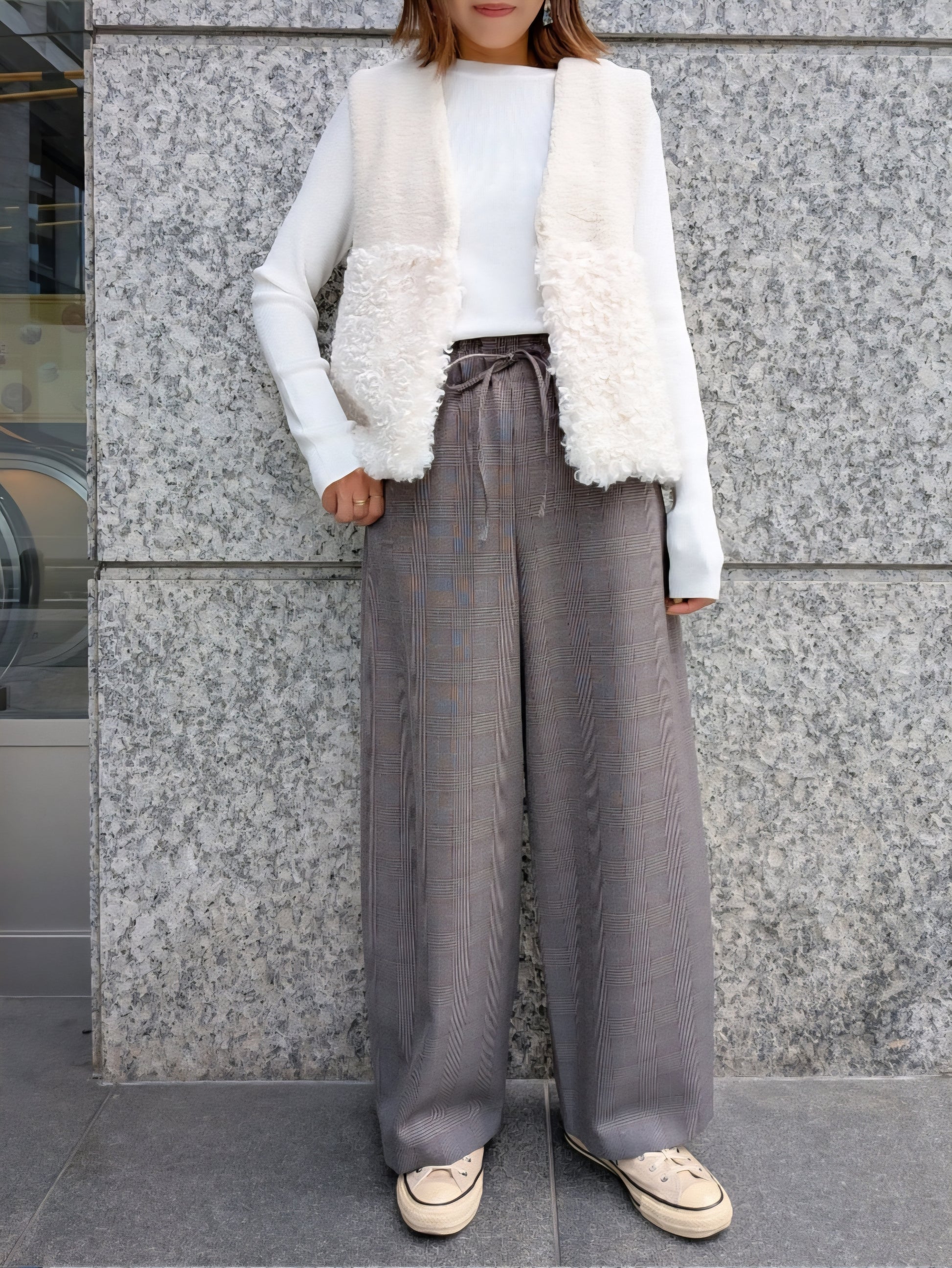 膨らみのあるウールライク素材のウーリッシュグレン生地を使用したパンツが