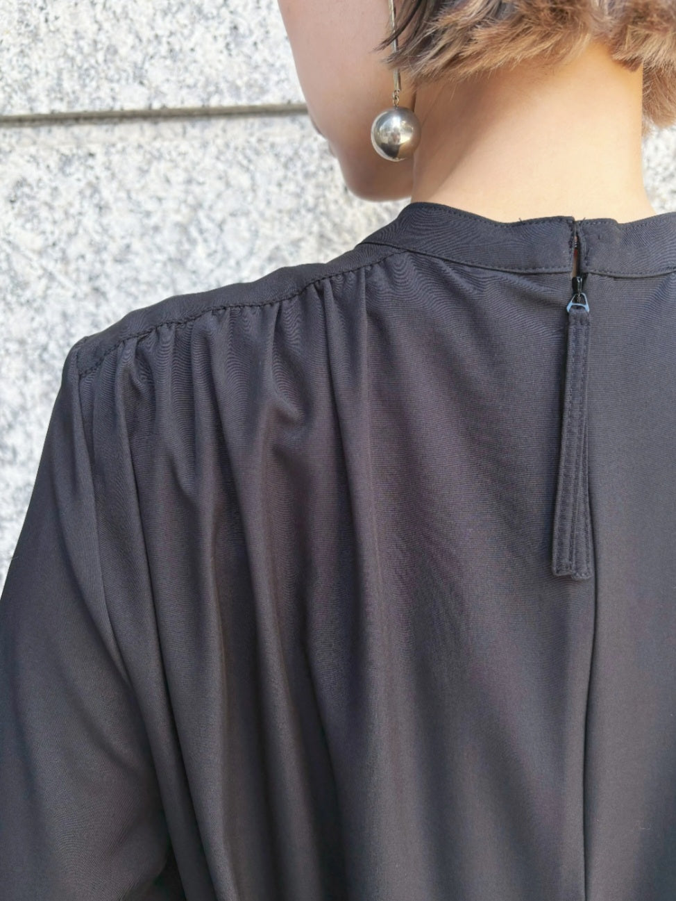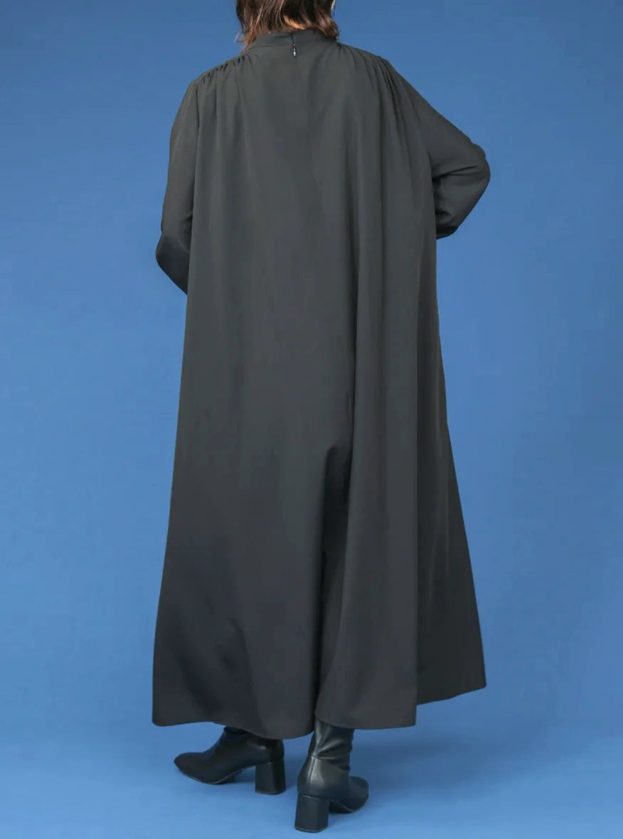 前身頃には細やかなギャザーを寄せ、自然なドレープを生み出すことで動くたびに美しく揺れるシルエットに◎