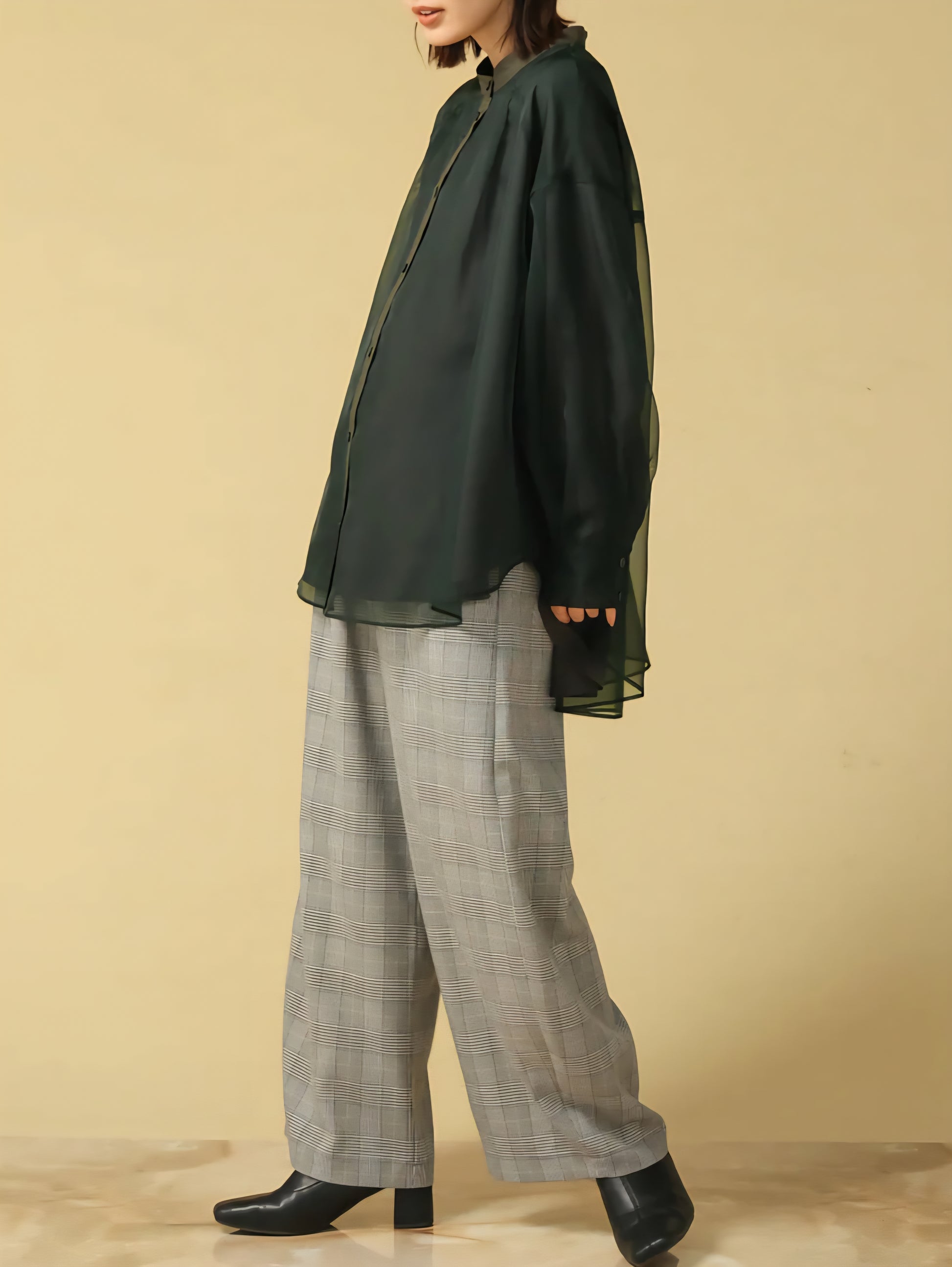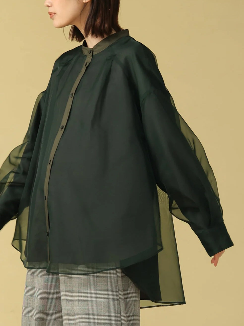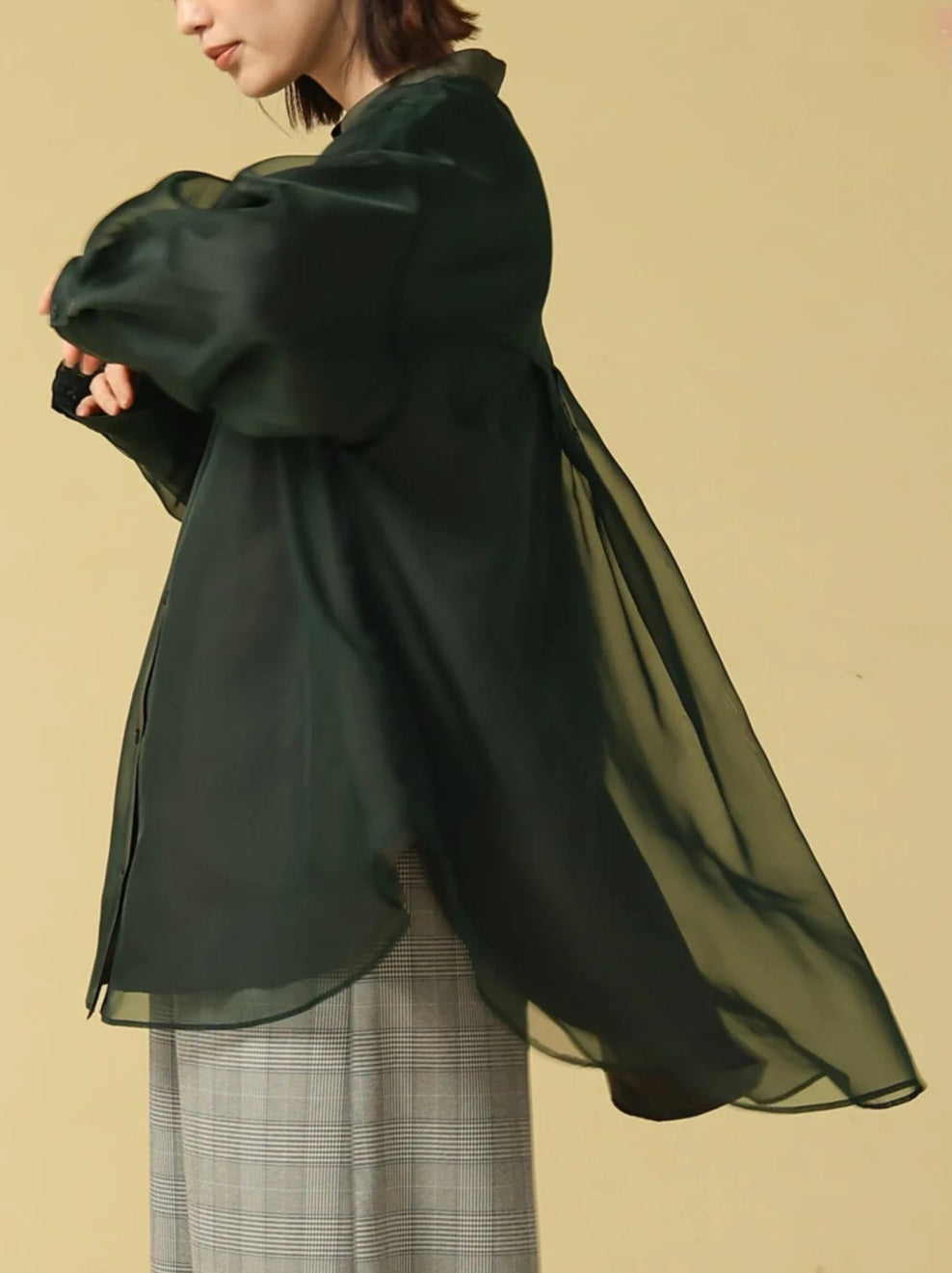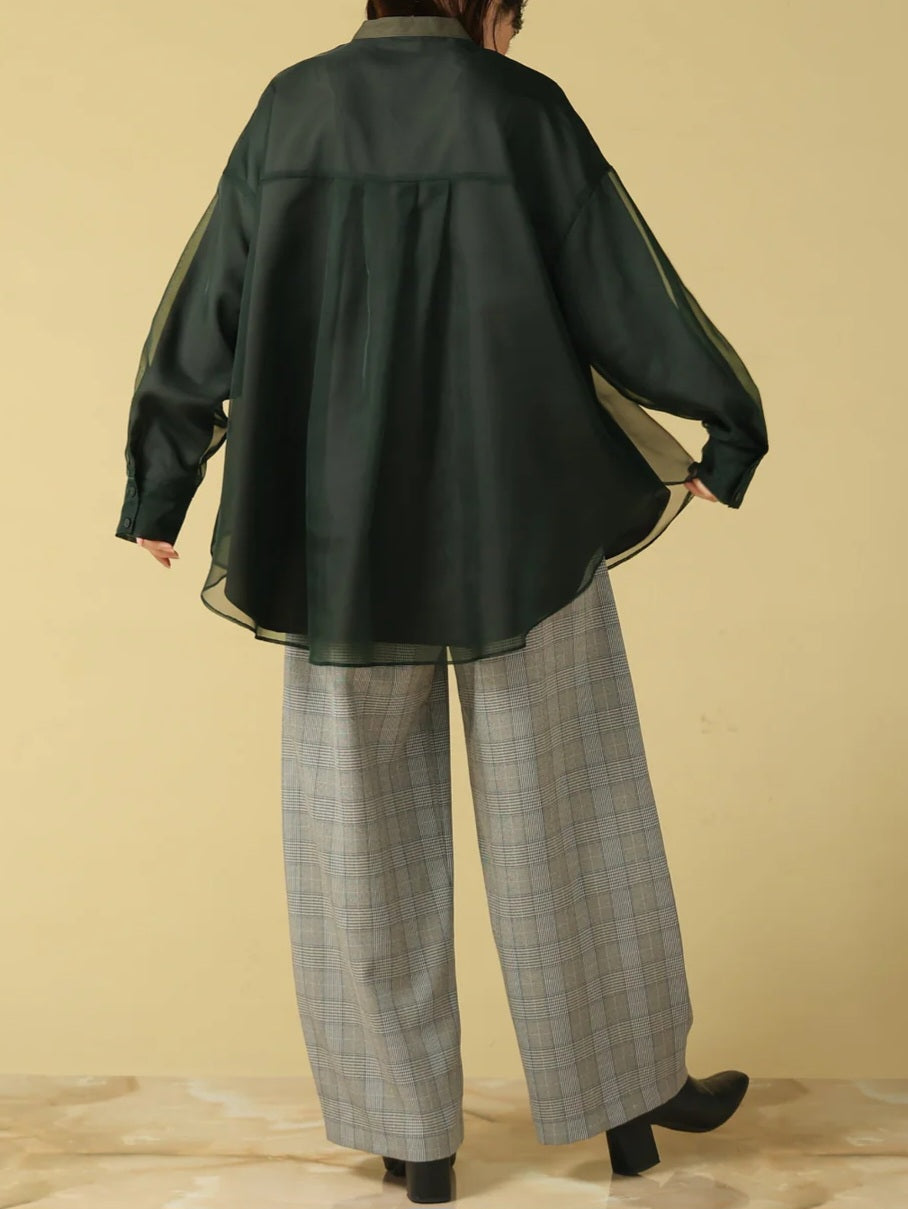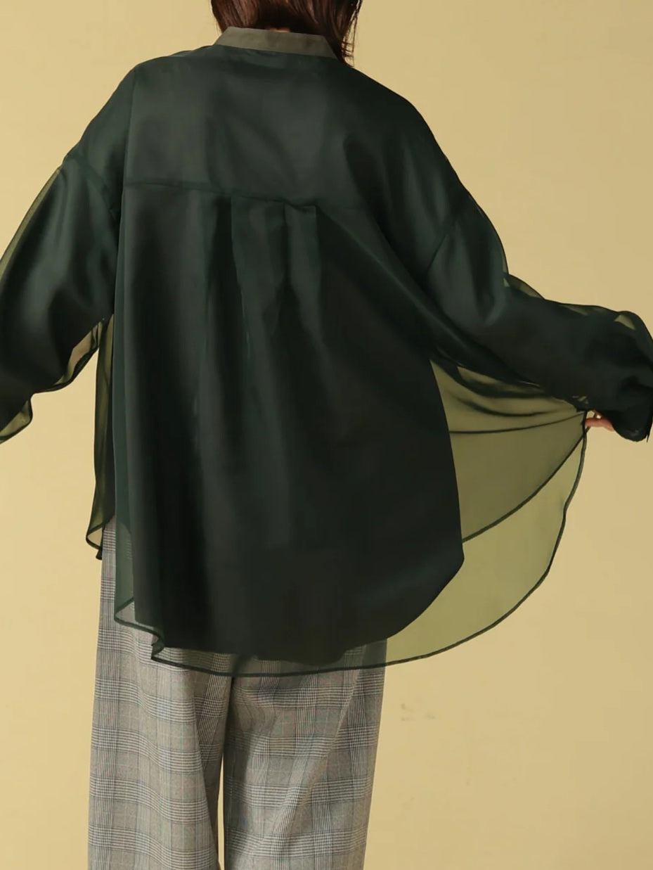 上品な透け感のマットオーガンジーと、撥水・透湿性に優れたパウダータフタの2枚仕立てで、気になる体のラインを自然にカバーしてくれる優秀ブラウス。