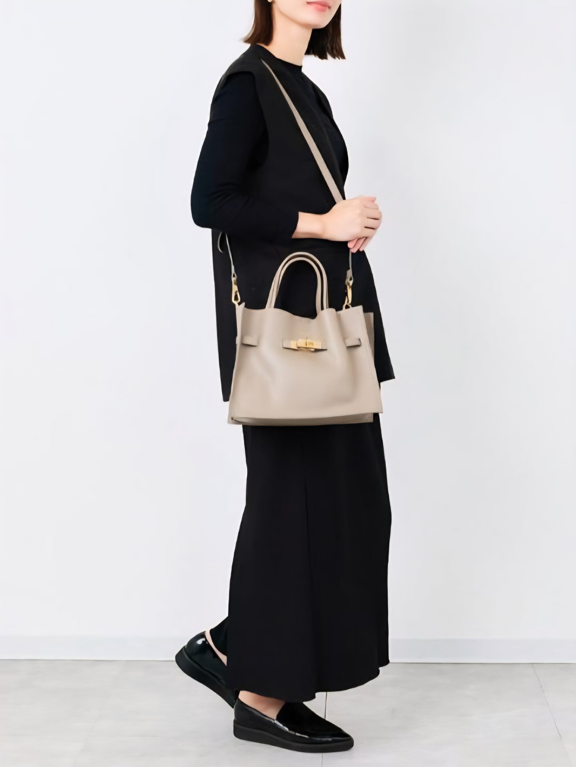 ゴールドの金具やターンロック付きのベルトがアクセントになり、コーディネートを上品な印象に仕上げてくれます!!