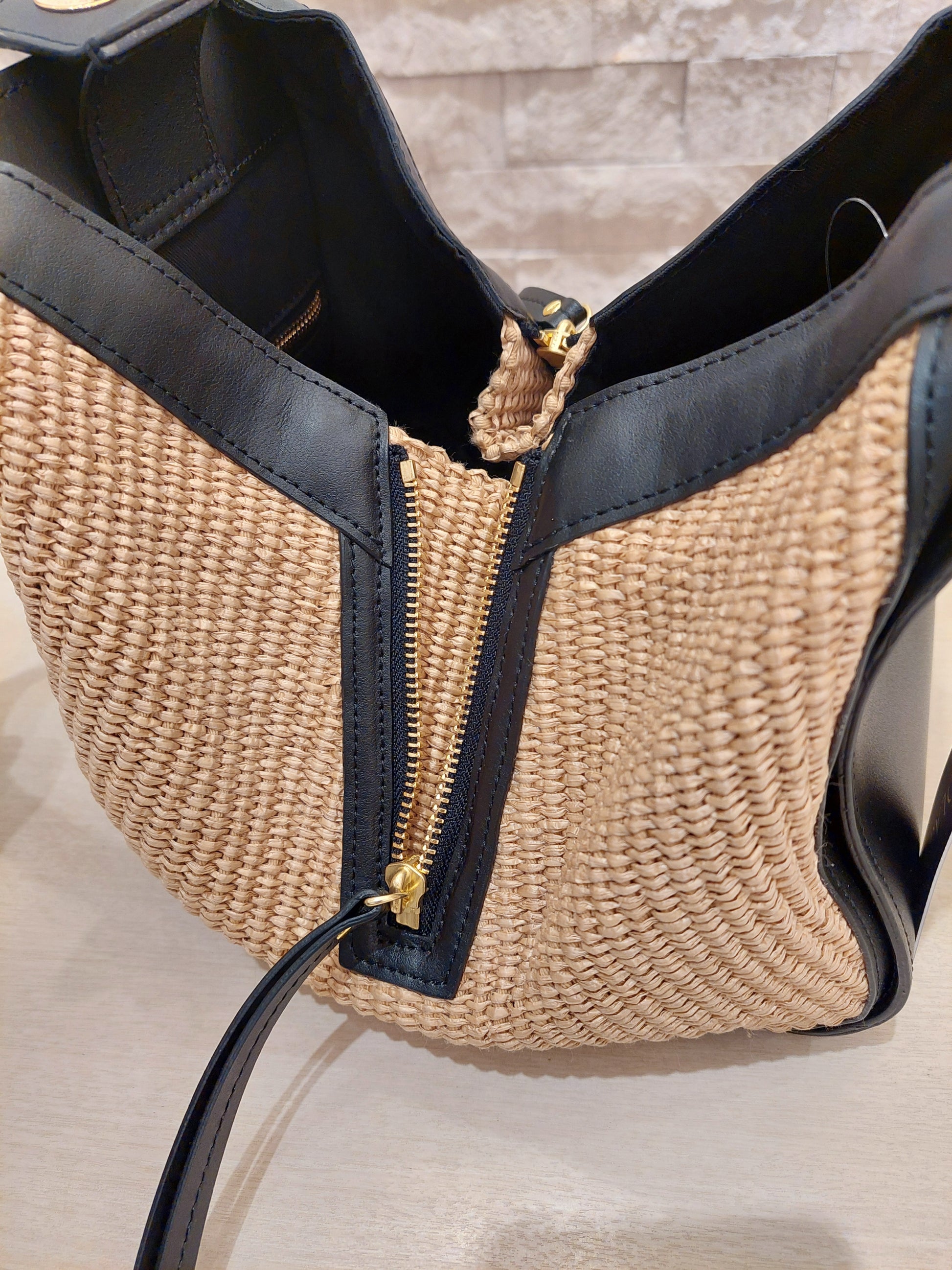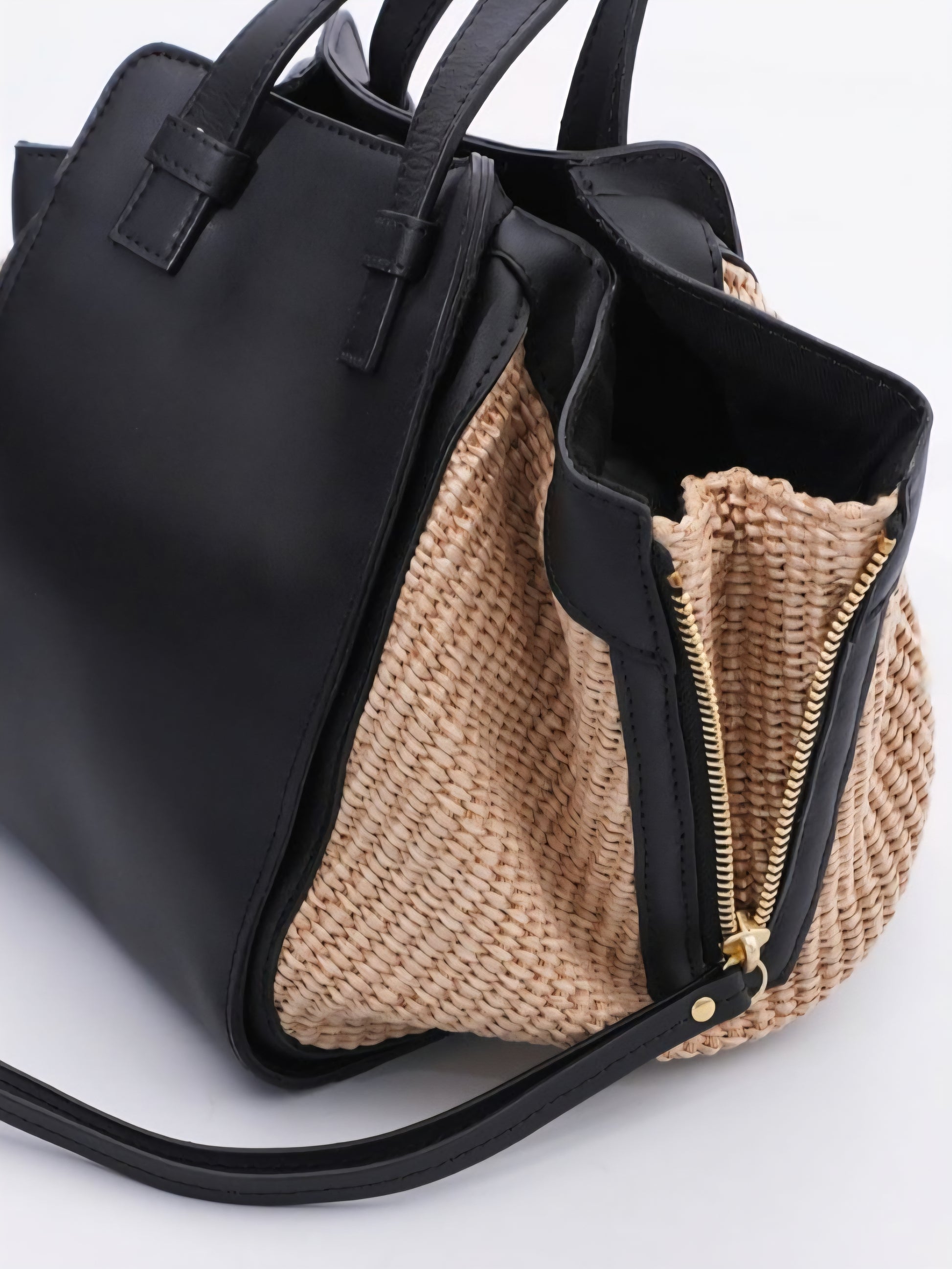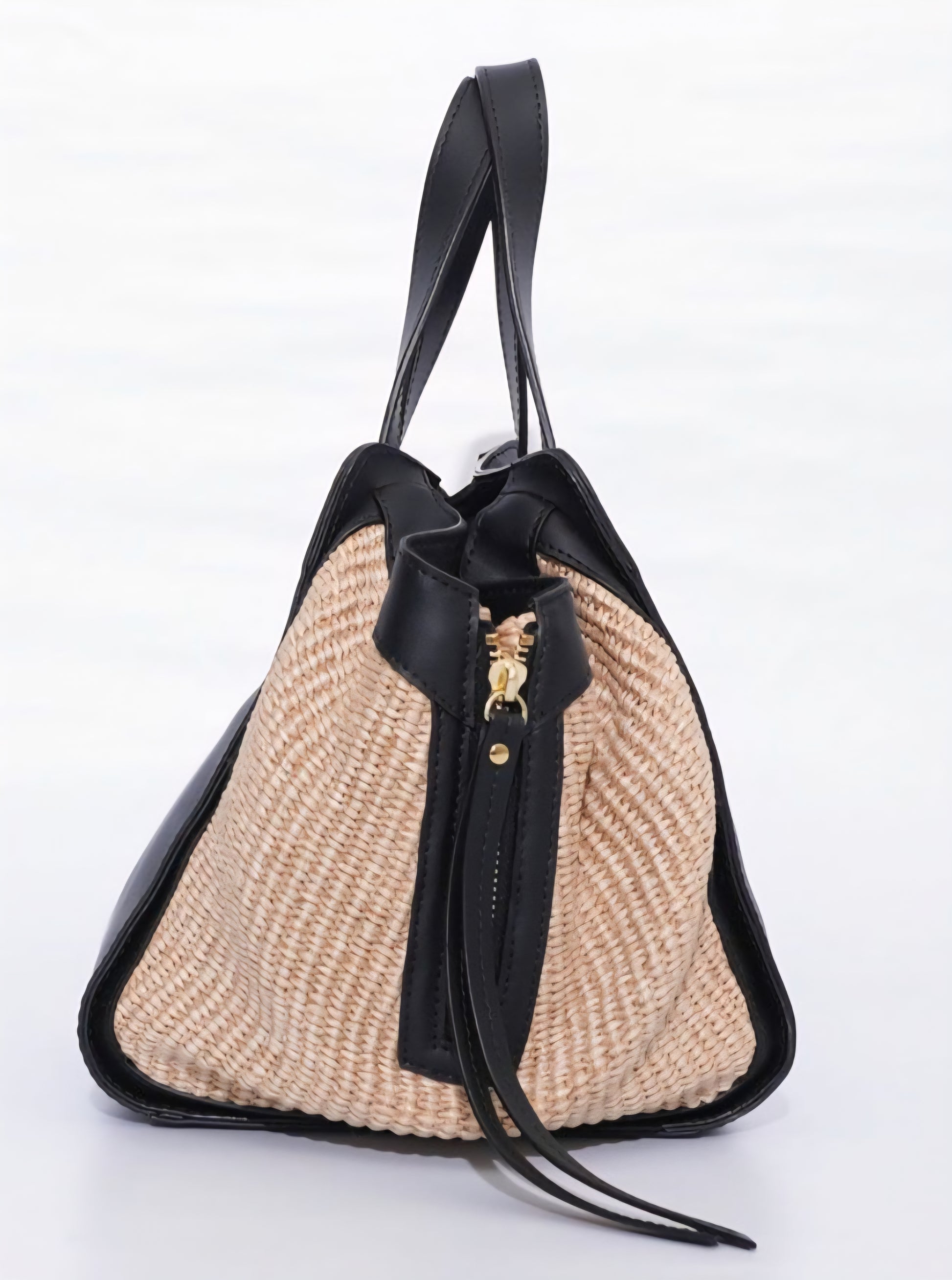 上品な風合いが魅力のラフィア調シートとレザーのコンビがアクセントになったハンドバッグ♡